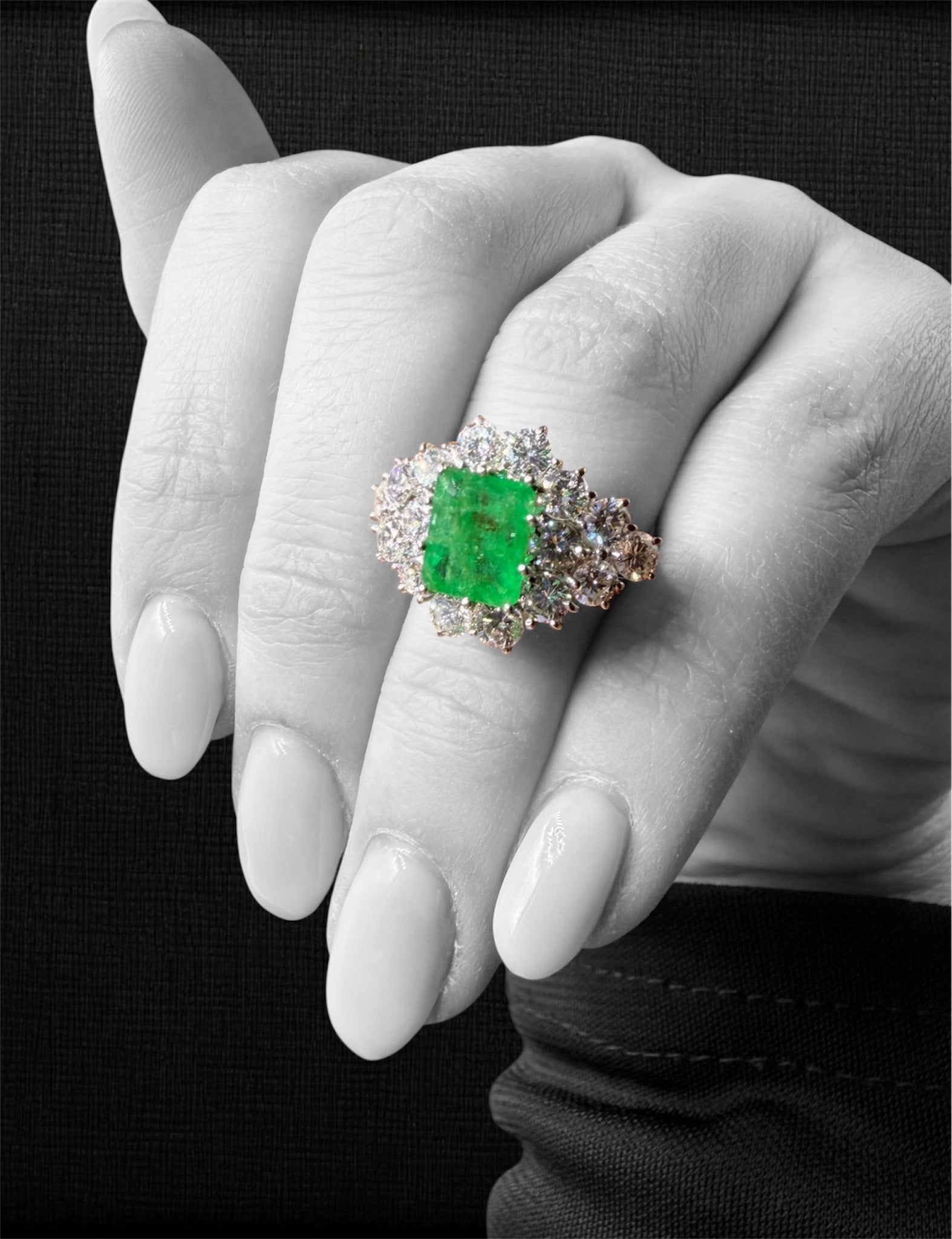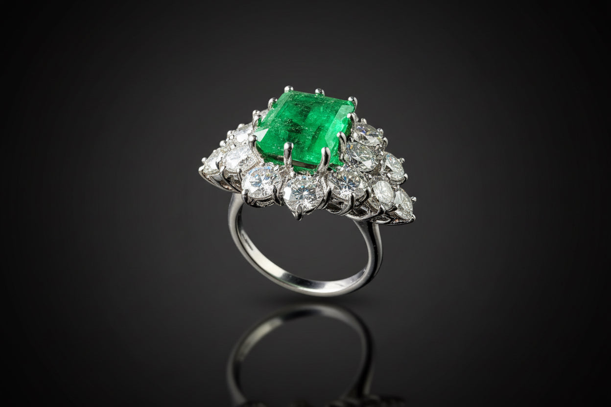 Straordinario anello cocktail di manifattura italiana degli anni '60, caratterizzato da un magnifico smeraldo naturale di taglio rettangolare del peso di ct. 1,45, montato come protagonista assoluto della composizione.