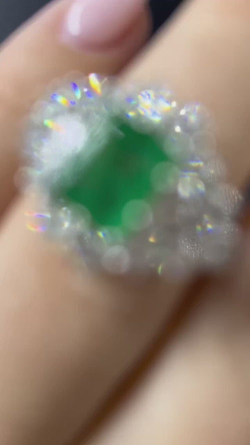 La pietra è circondata da sedici diamanti di taglio brillante, per un totale di ct. 2,4, sapientemente disposti in una geometria triangolare allungata che abbraccia elegantemente il dito.