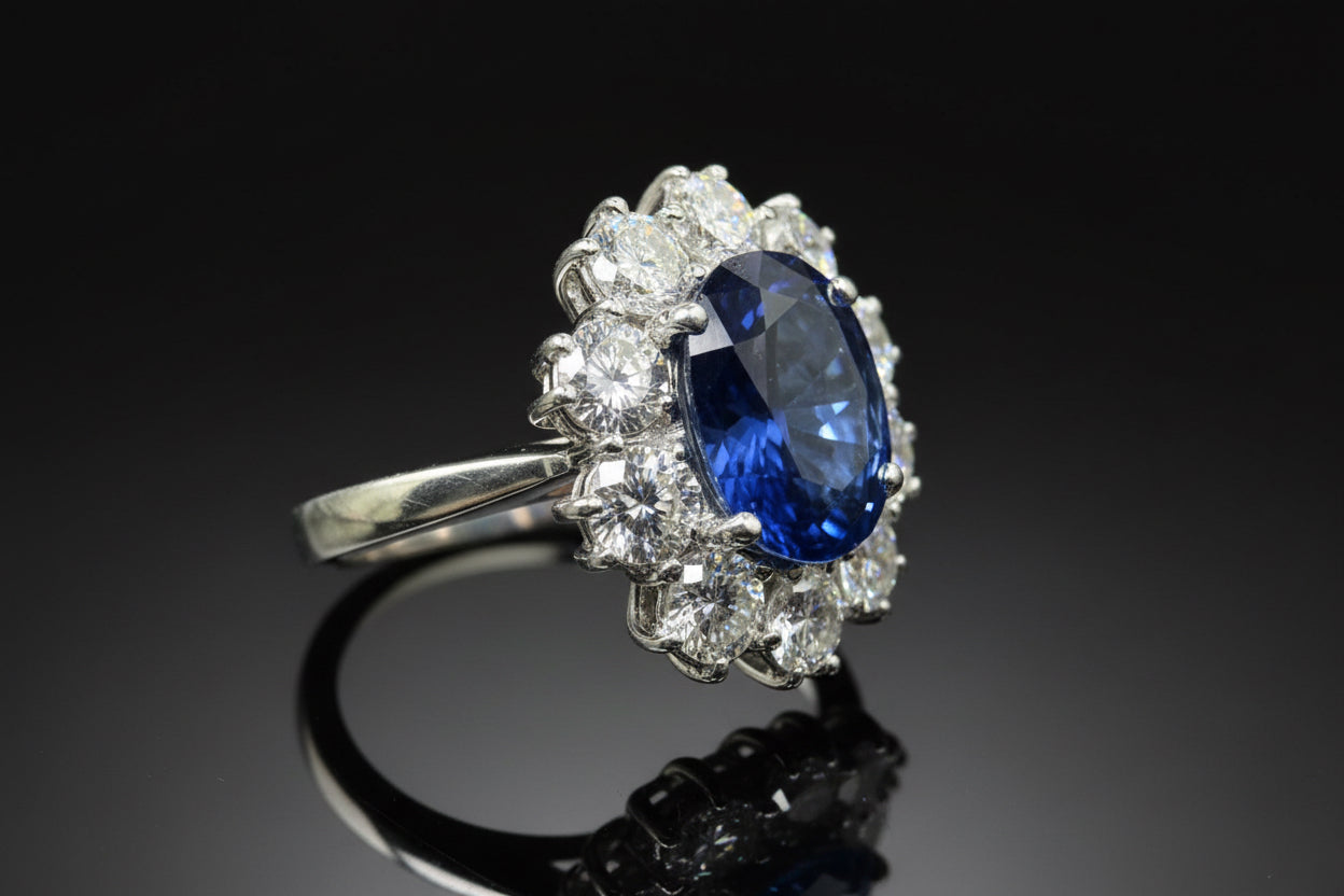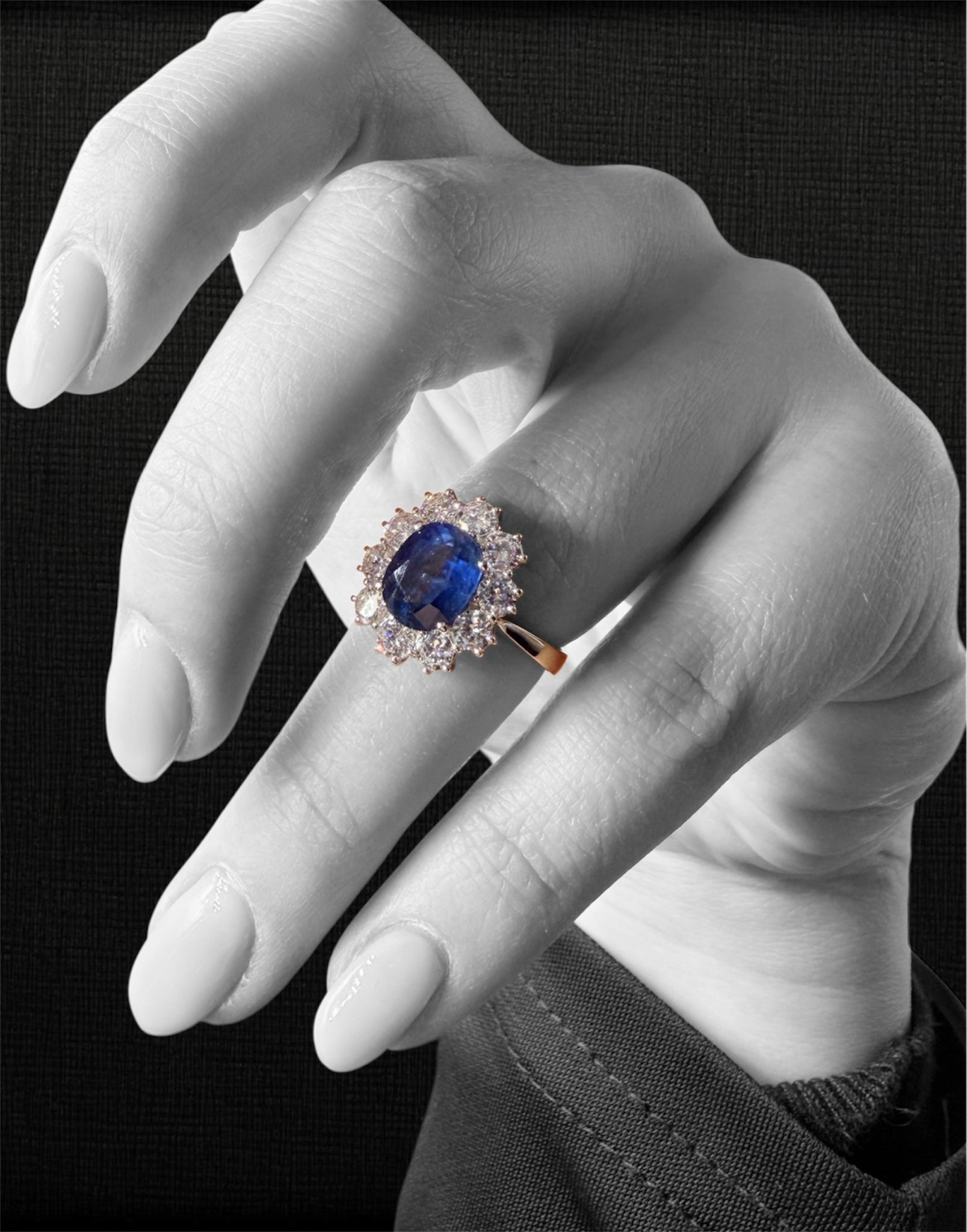 La combinazione tra lo zaffiro blu intenso e lo scintillio dei diamanti crea un contrasto affascinante, mentre la struttura a margherita rappresenta uno dei design più iconici e versatili della gioielleria classica.