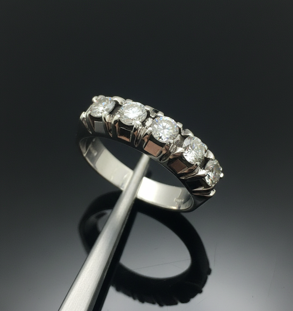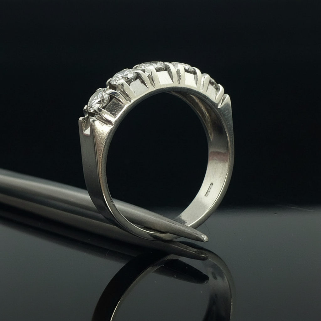 Concediti l'eleganza senza tempo e l'impeccabile maestria dell'Anello Riviere in Oro Bianco, un vero capolavoro degli splendidi anni '70. La sua abbagliante sequenza di diamanti da 0,15 carati incastonati trasuda un'aura raffinata e lussuosa, con un peso totale di 0,75 ct. Questo design incantevole celebra il fascino naturale delle pietre, creando una luminosità unica e sofisticata. Perfetto per chi desidera un pezzo di ispirazione vintage che fonda perfettamente il fascino classico con la raffinatezza moderna. Questo gioiello unico nel suo genere rende omaggio alla raffinatezza senza tempo degli anni '70. Disponibile nella taglia IT 11.