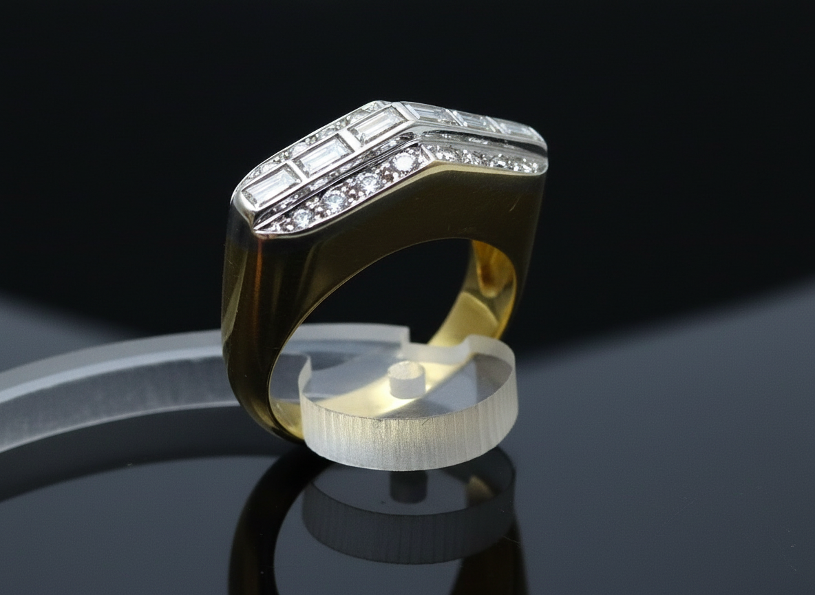 Esplora un'opera d'arte dell'artigianato italiano degli anni '70 con il nostro esclusivo anello "a ponte". Questo straordinario anello, realizzato con maestria in oro giallo e bianco 18K, presenta una raffinata fila di diamanti taglio "carrè", ciascuno del peso di 0,15 carati, per un totale di 0,90 carati. Inoltre, i diamanti circondano elegantemente altri diamanti taglio "brillante" naturali, ciascuno del peso di 0,03 carati, per un totale di 0,24 carati. Con un totale di 1,40 carati di diamanti, questo anello è un'aggiunta affascinante a qualsiasi collezione di gioielli.