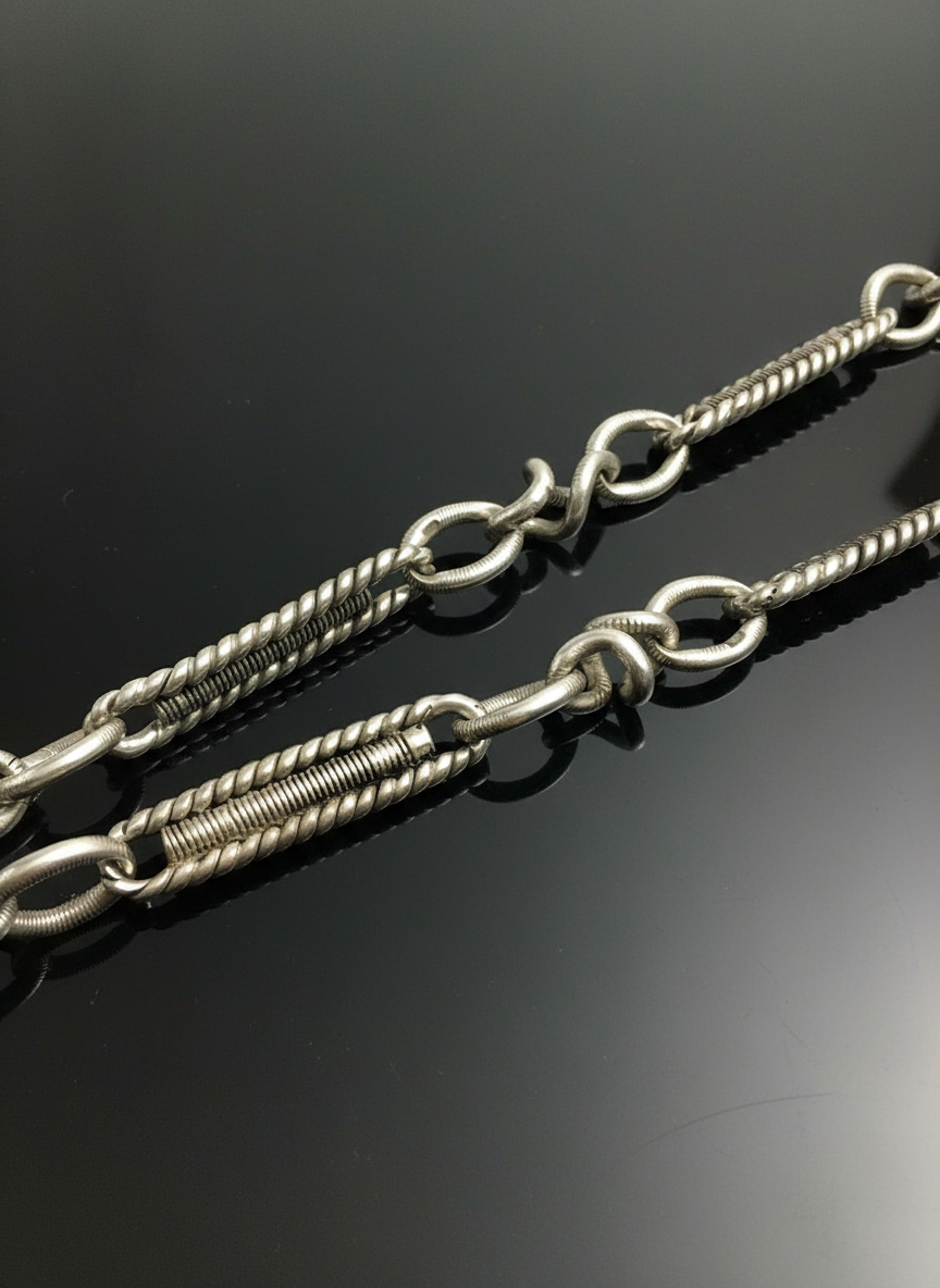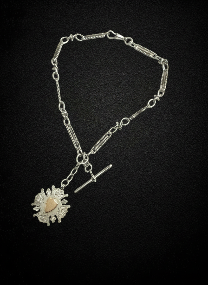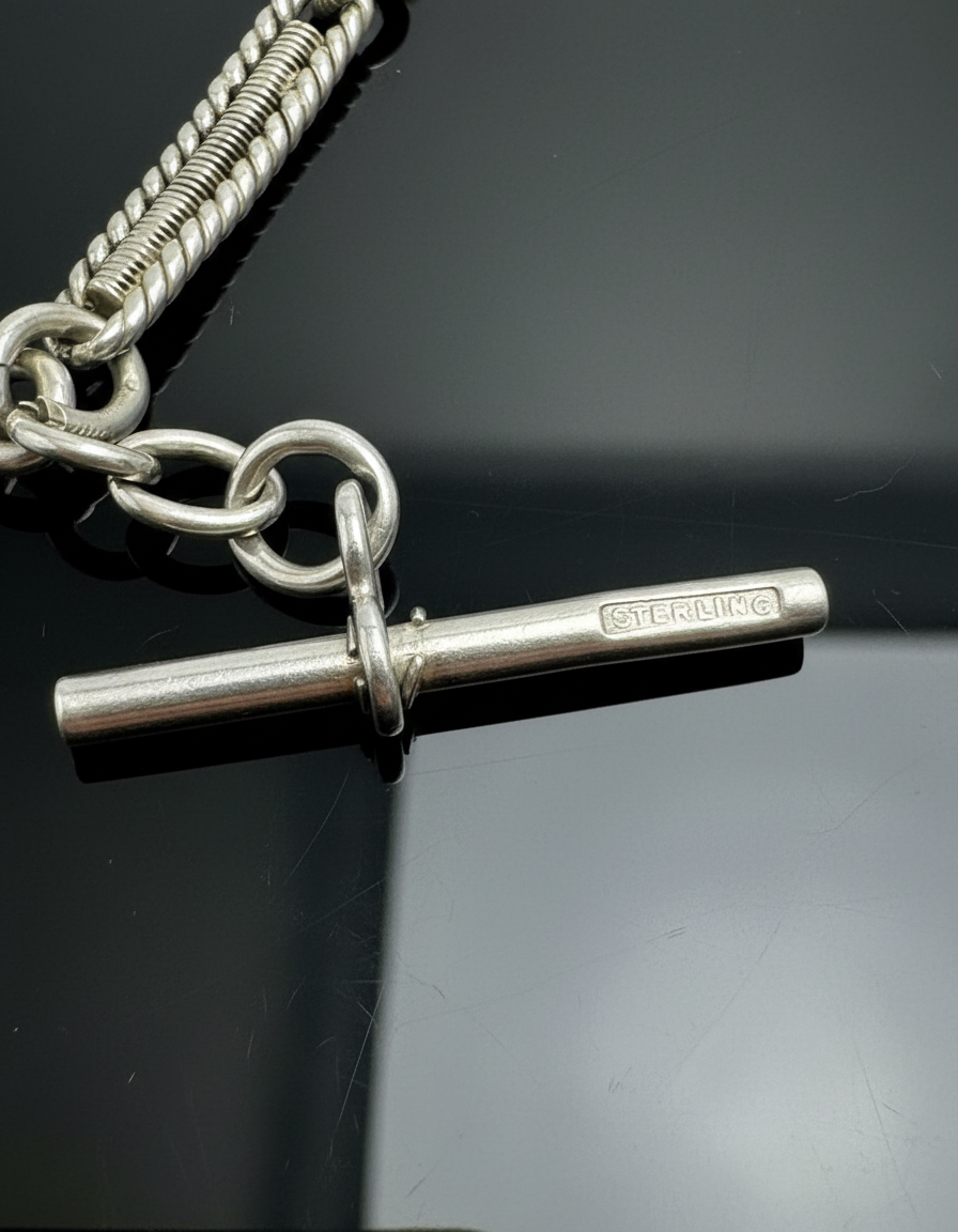 Una raffinata Catena da Orologio in argento sterling di pregevole fattura, arricchita da una maglia elaborata a losanghe, simbolo di eleganza senza tempo e di solidità senza pari. La chiusura è garantita da un moschettone a molla, un dettaglio pratico che preserva lo stile senza rinunciare alla sicurezza.