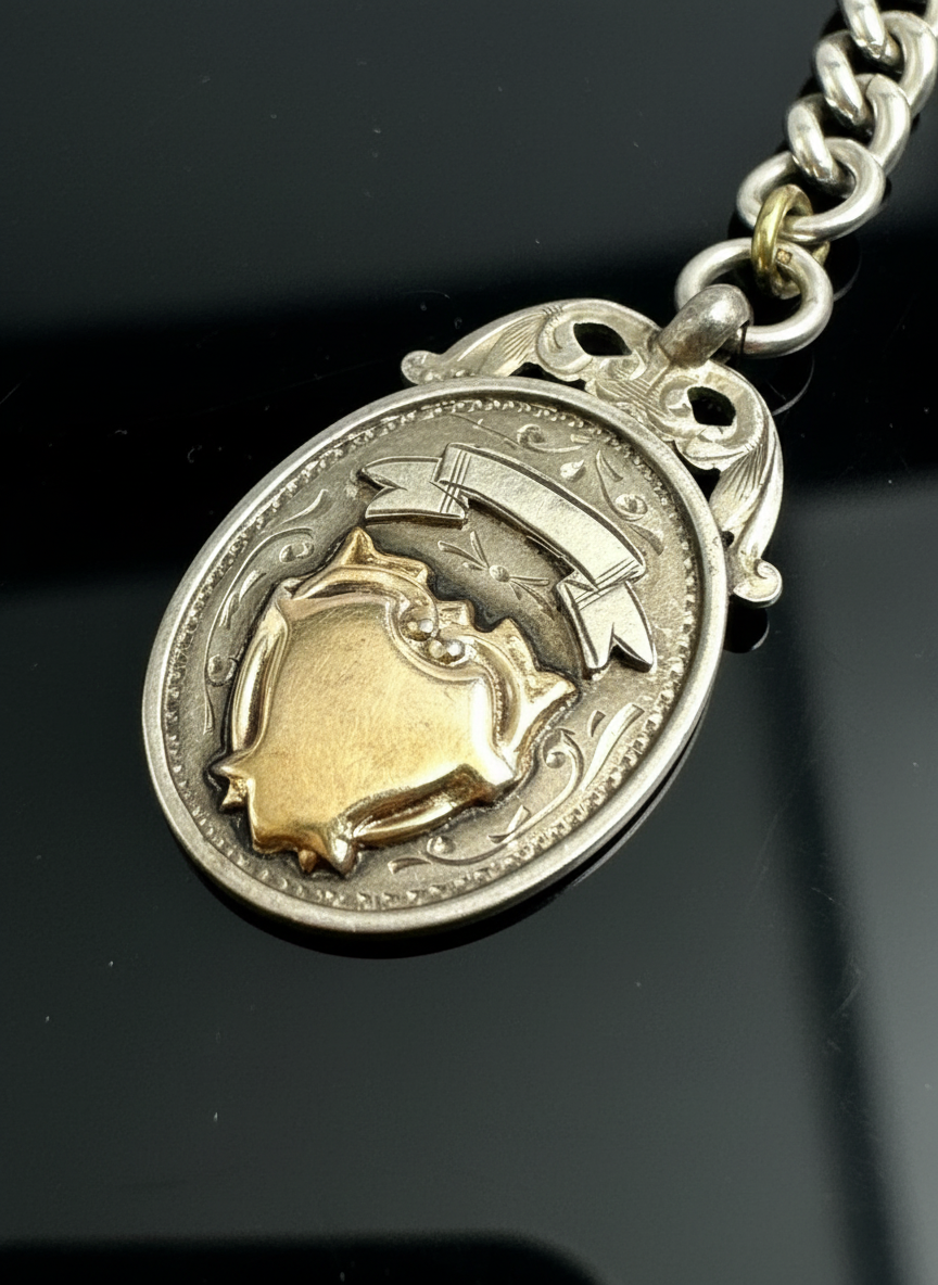 Spicca un pendente a medaglia, riccamente elaborato, che rappresenta il vero fulcro decorativo del pezzo. Il pendente non è solo un elemento estetico, ma anche funzionale, servendo come sigillo, supporto per le iniziali del proprietario e charm decorativo..
