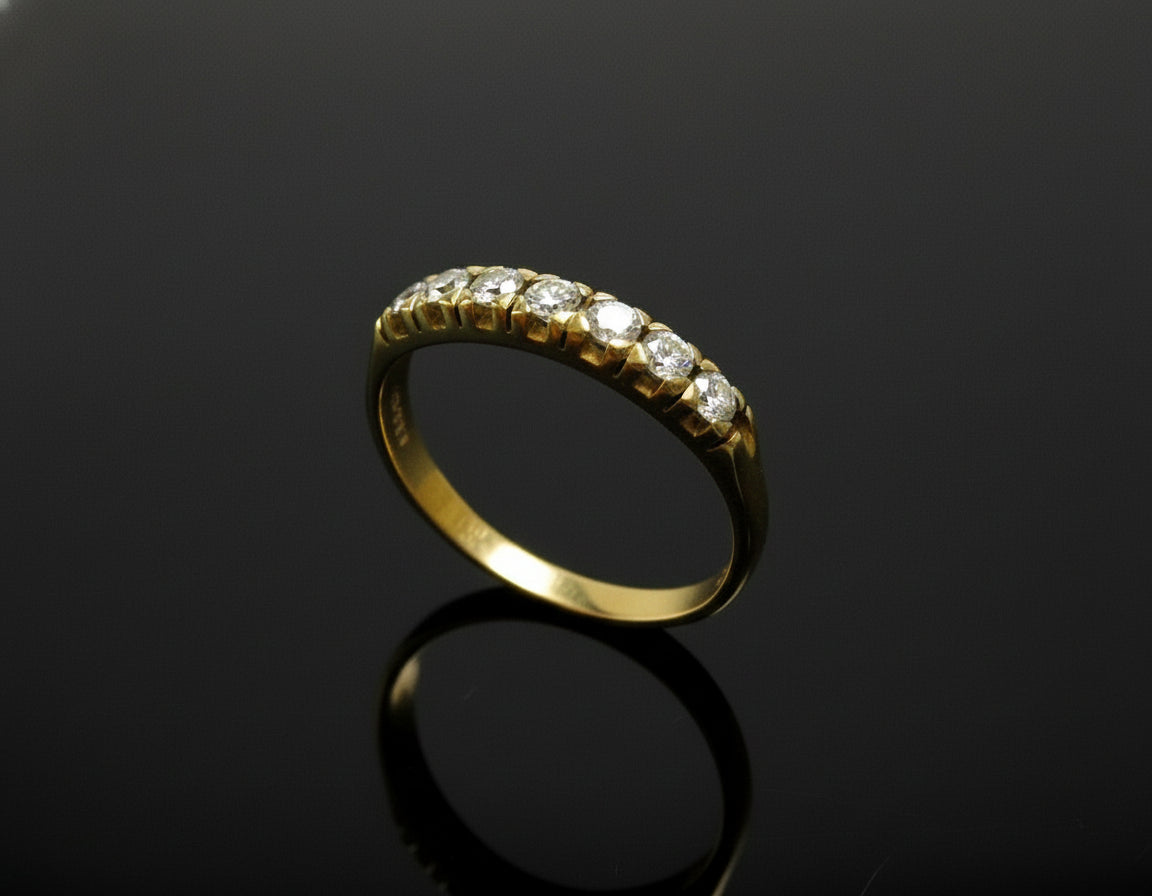 L'anello è impreziosito da sette diamanti, incastonati con maestria in castoni a griffe, che esaltano al massimo la brillantezza e la luminosità di ogni pietra.