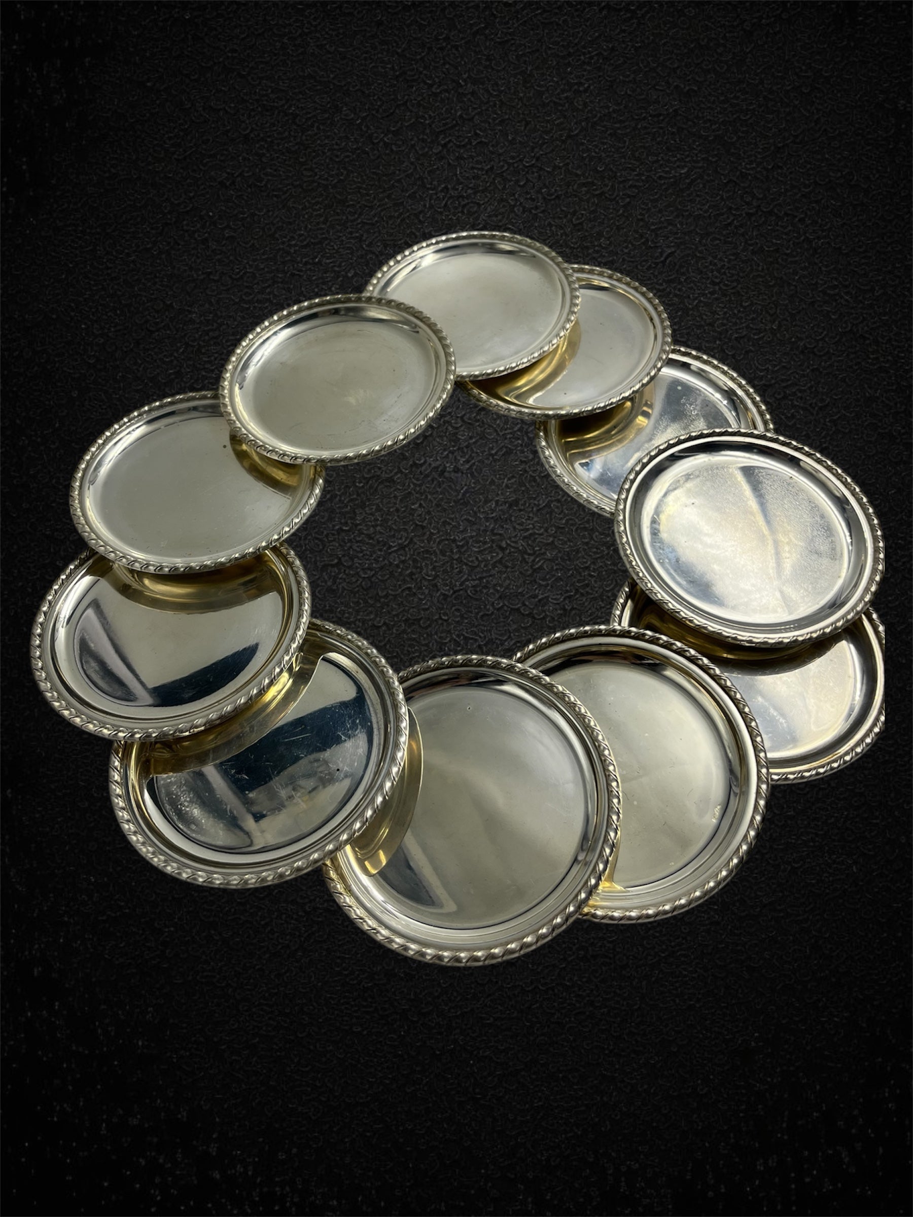 Questi eleganti sottobicchieri sono eseguiti in argento 800 millesimi, e si distinguono per il loro raffinato bordo cordonato, un dettaglio decorativo sobrio ma ricercato, che richiama le linee barocche dello stile San Marco.