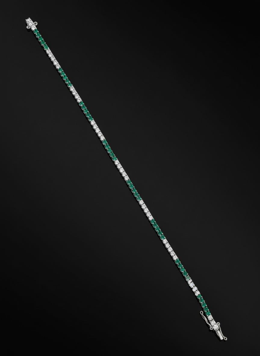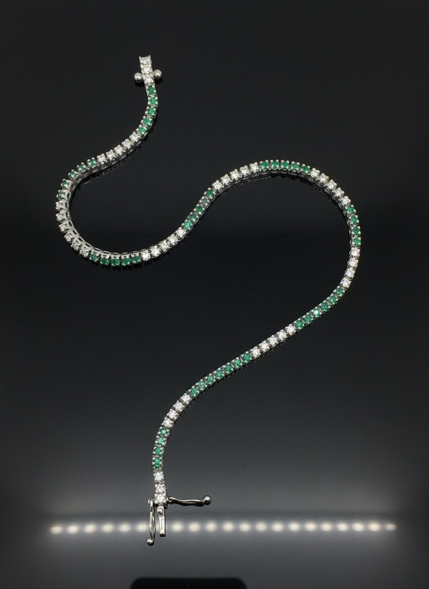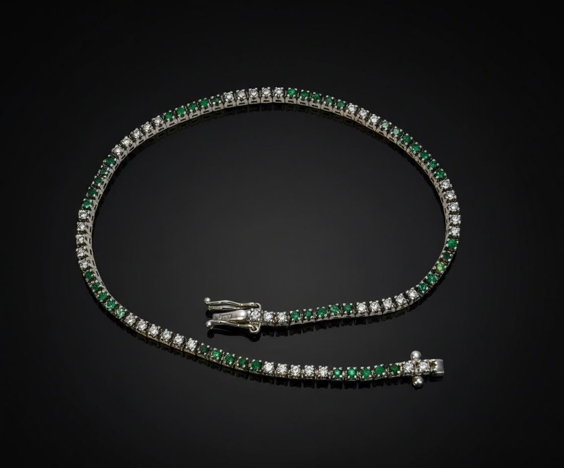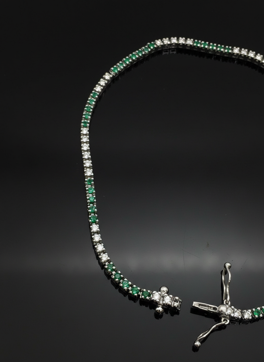 Il raffinato bracciale si distingue per la preziosità delle sue gemme incolori e verdi, che creano un armonioso e luminoso contrasto. Gli 46 diamanti naturali, rotondi e tagliati con perfezione, ammontano a un peso complessivo di circa 0,46 carati (0,01 carati ciascuno). Allo stesso modo, i 44 granati tsavorite di forma rotonda e taglio brillante, pesando circa 0,44 carati in totale (0,01 carati ciascuno), conferiscono al bracciale una tonalità verde vivace che richiama la freschezza della natura, valorizzandone la luminosità.