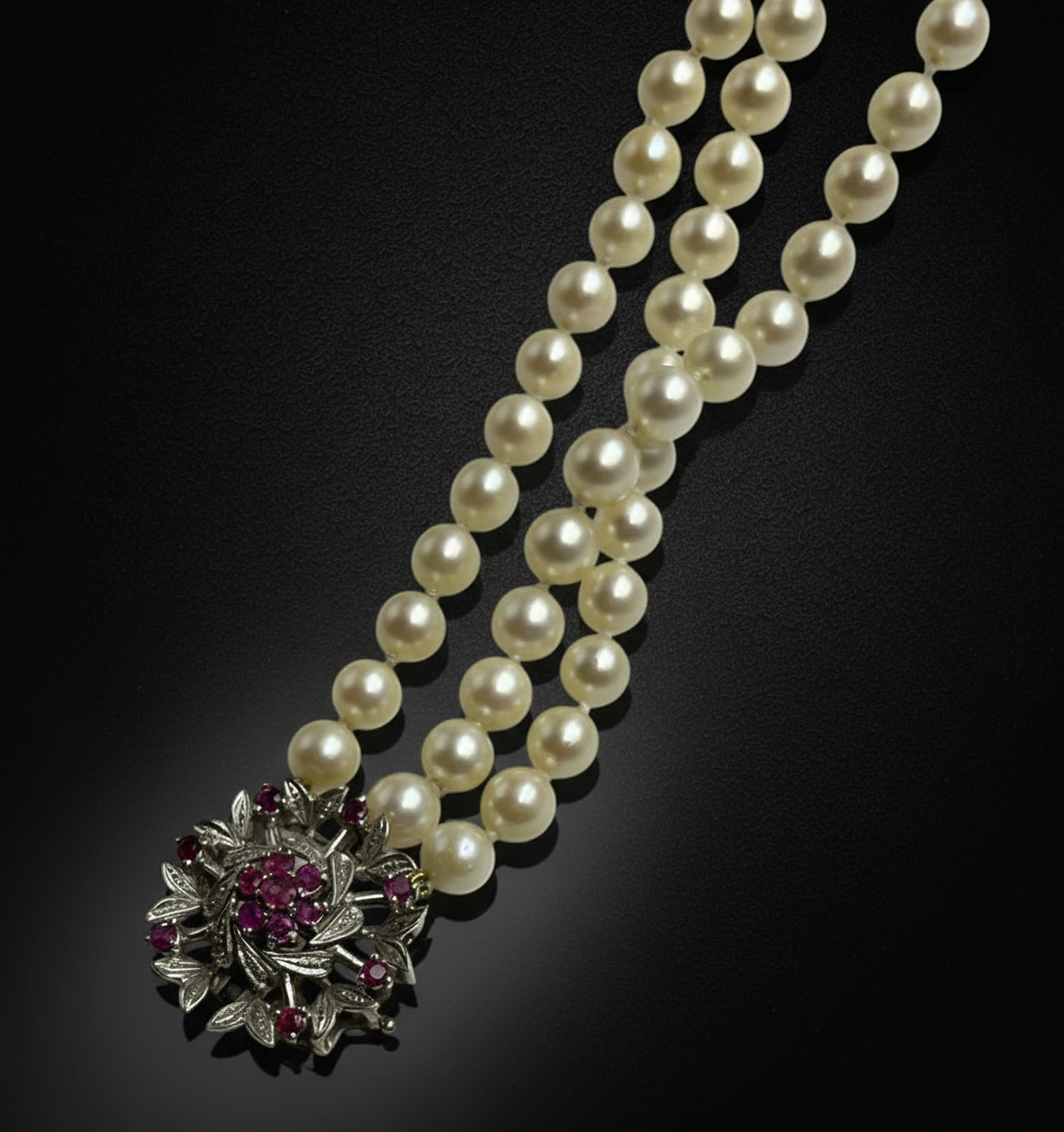 18 kt white gold clasp with no. 15 pink strings of pink pearls, ruby ​​variety, with single average weight of 0.05 ct
