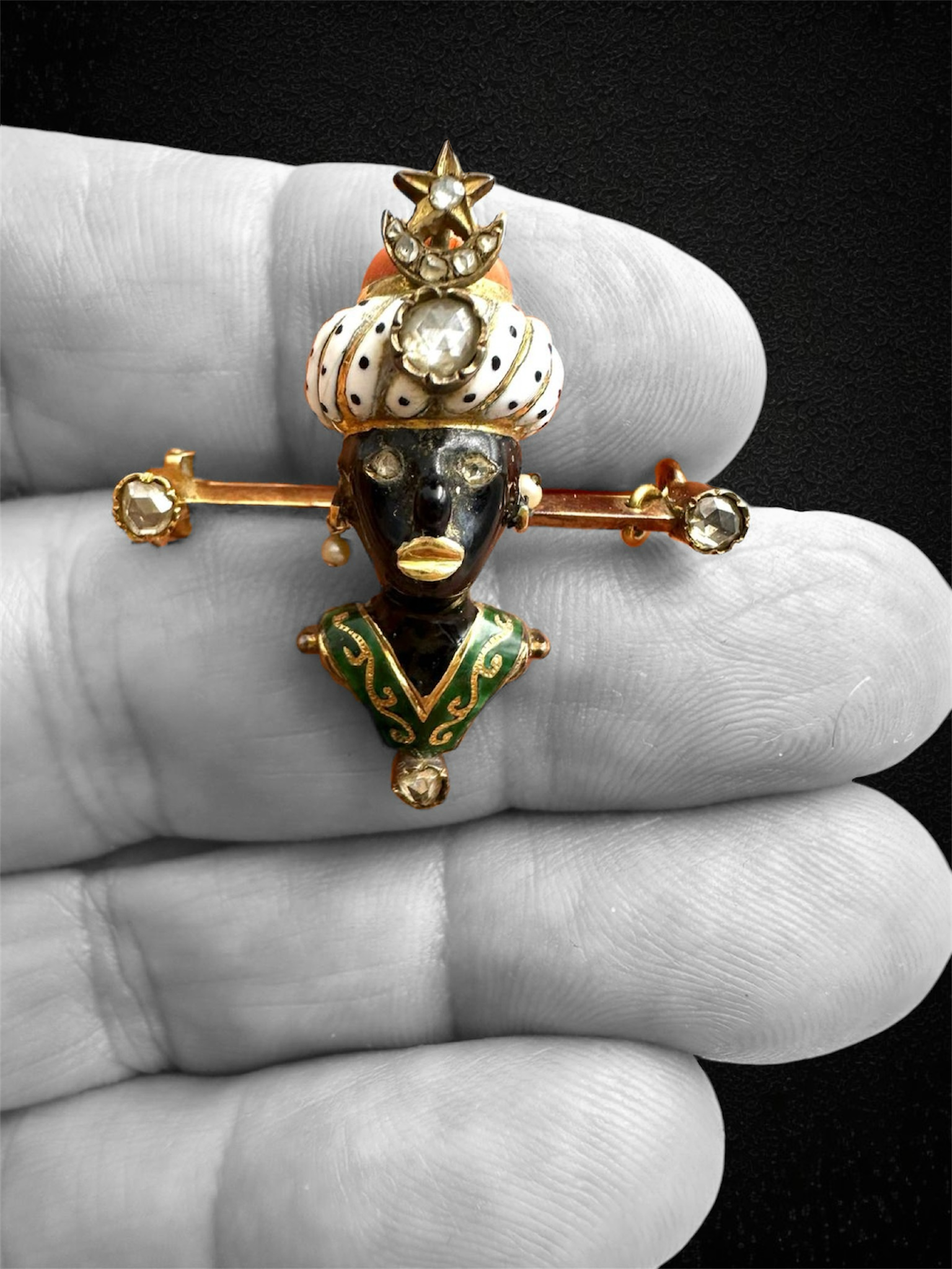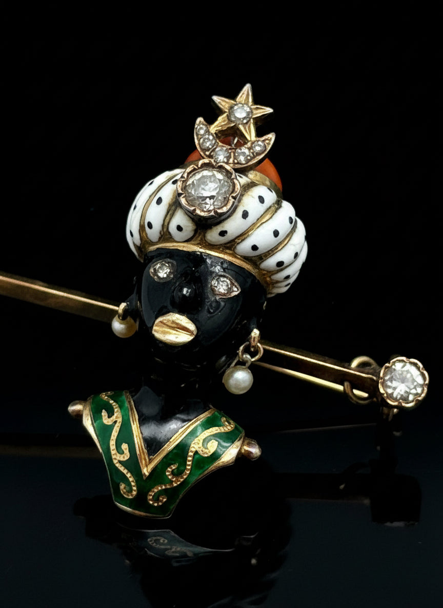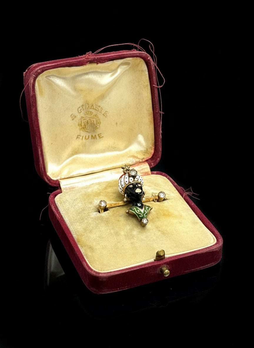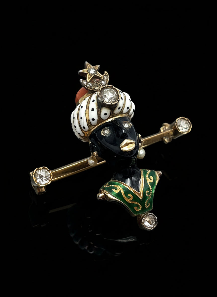 Rare Polychrome Enamels Gold Pin Bar with "Moretto" from the Dalmatian workshop of goldsmith artist A. Gigante.