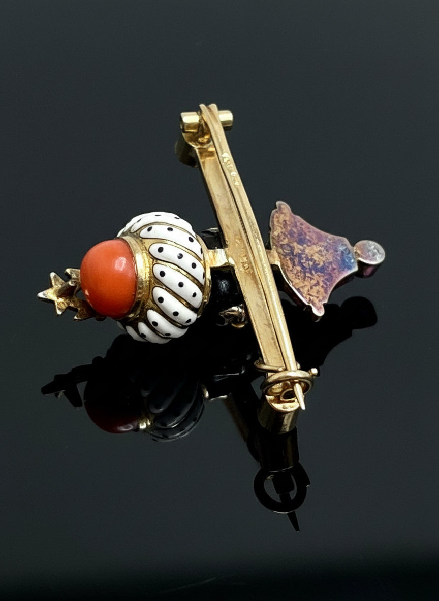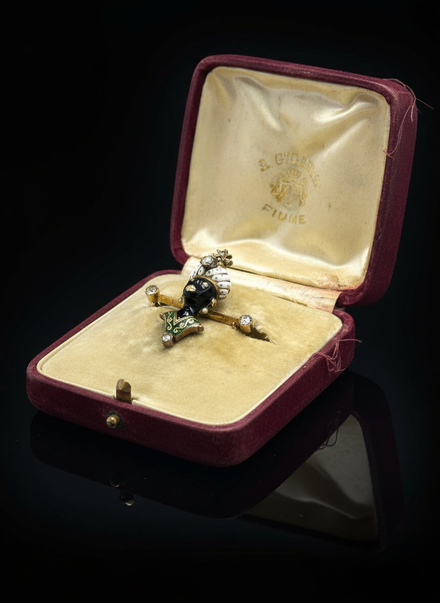 Spilla in oro con smalti policromi con "moretto", firmata Agostino Gigante