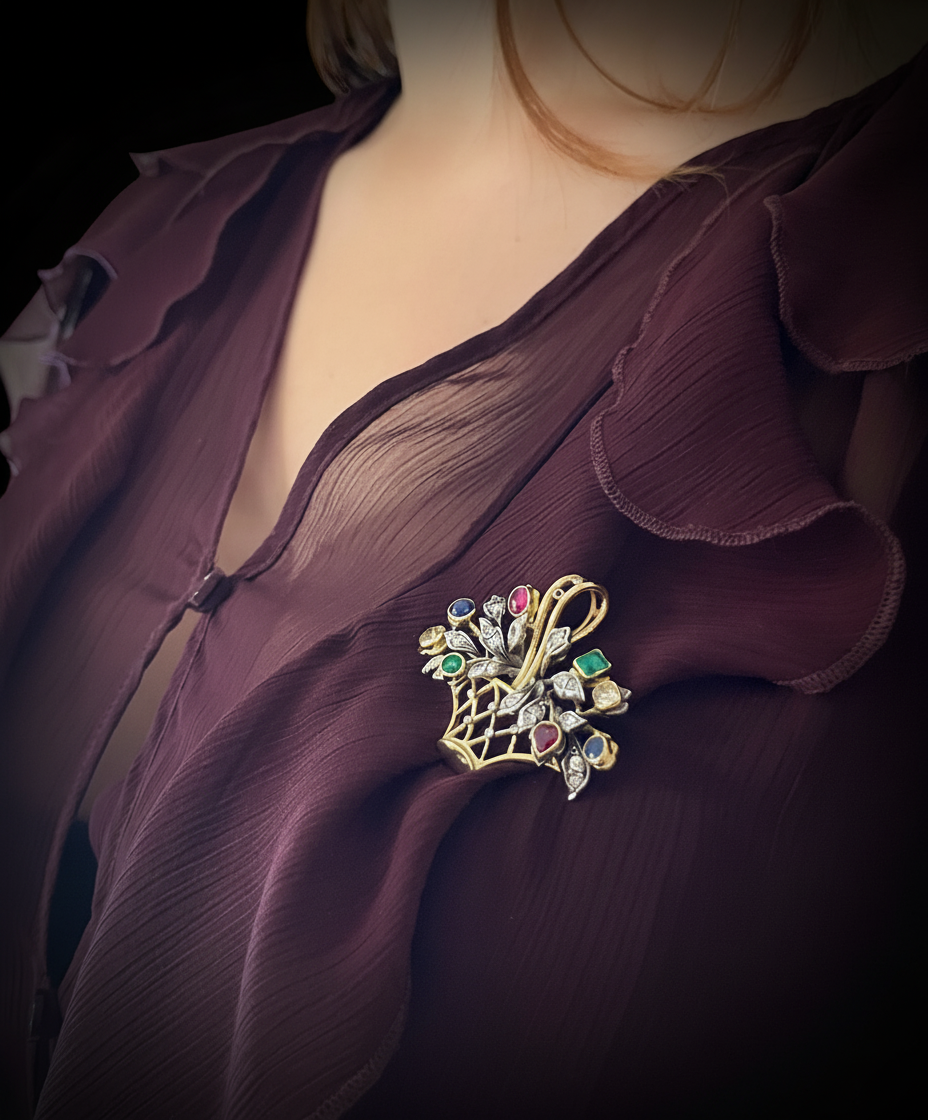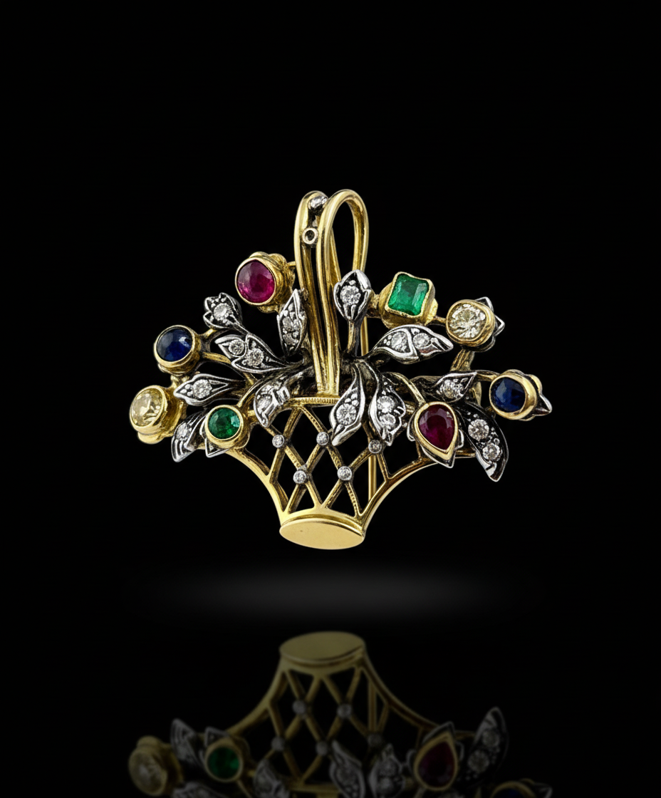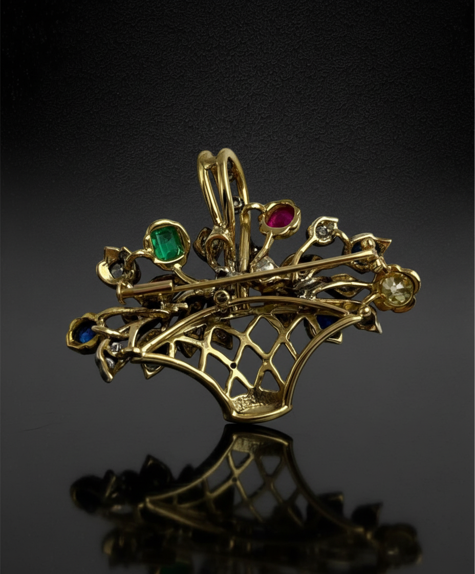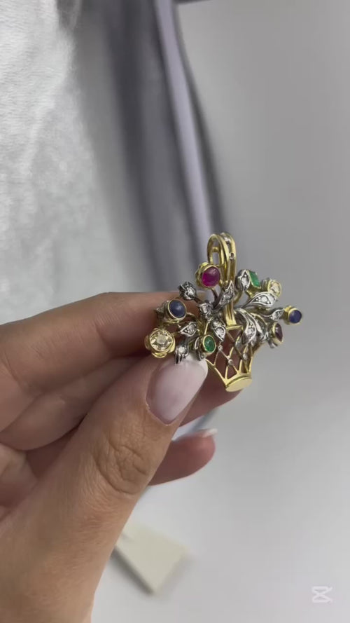 Un'eleganza senza tempo si rivela in questa eccezionale spilla-ciondolo italiana degli anni '60, lavorata con abile artigianalità in oro giallo e bianco 18 carati. Il gioiello, finemente traforato, raffigura un delicato cestino colmo di fiori, un tributo alla grazia e alla bellezza della natura interpretato con raffinatezza orafa. I petali dei fiori sono incastonati con preziosi diamanti, zaffiri intensi, rubini e smeraldi vellutati, creando un bouquet scintillante di luce e colore. Perfetta sia come spilla che come pendente, questa creazione vintage incarna l'eccellenza della gioielleria italiana del dopoguerra.