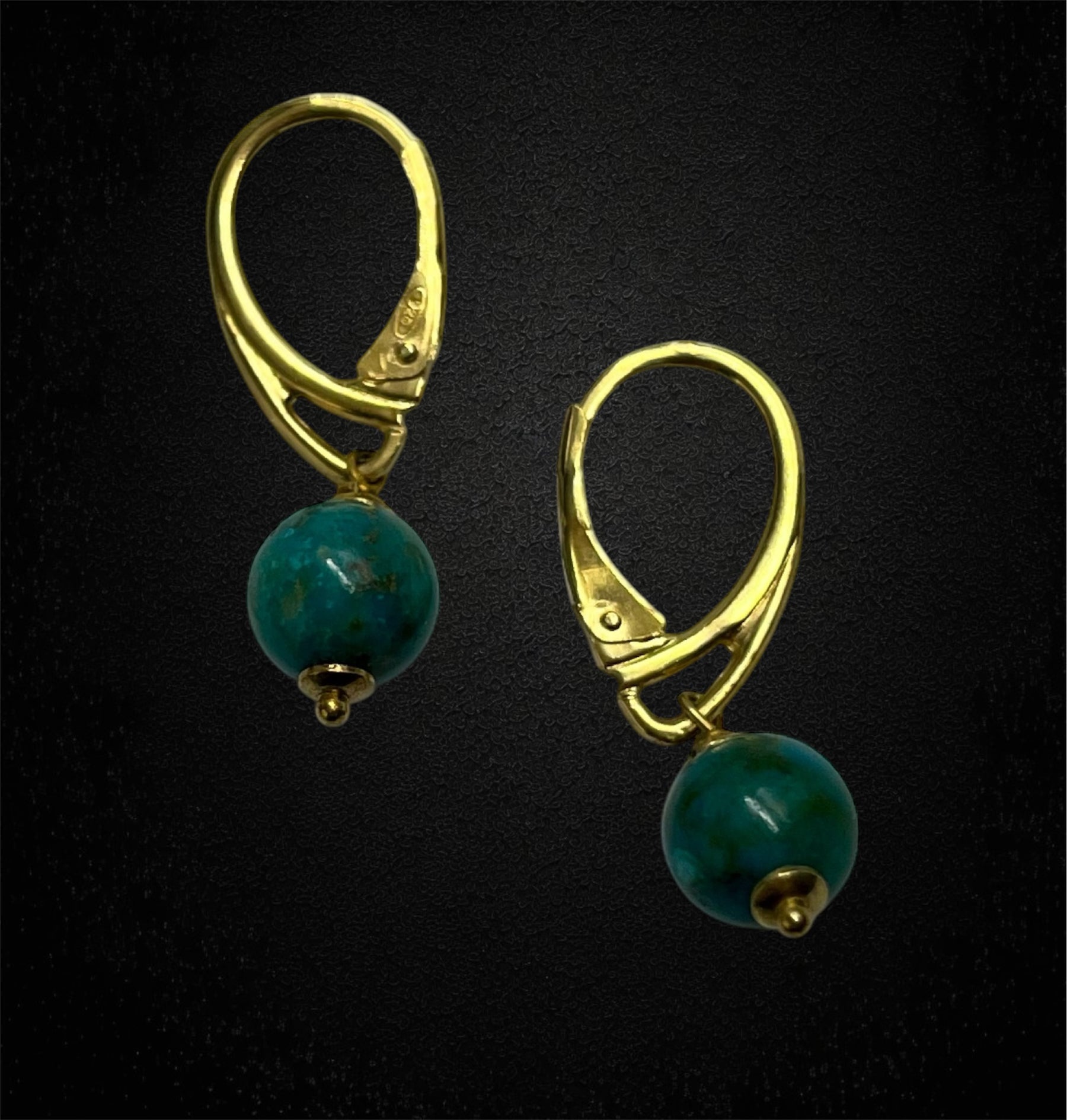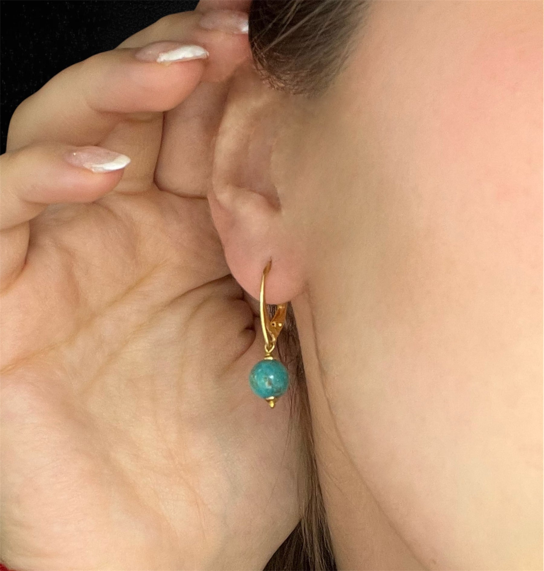 Ogni orecchino è composto da una perla di turchese, incastonata con un filo passante che permette un movimento fluido e delicato. Le perle, con il loro caratteristico colore turchese, aggiungono un tocco di freschezza e luminosità, creando un contrasto armonioso con l'argento dorato.