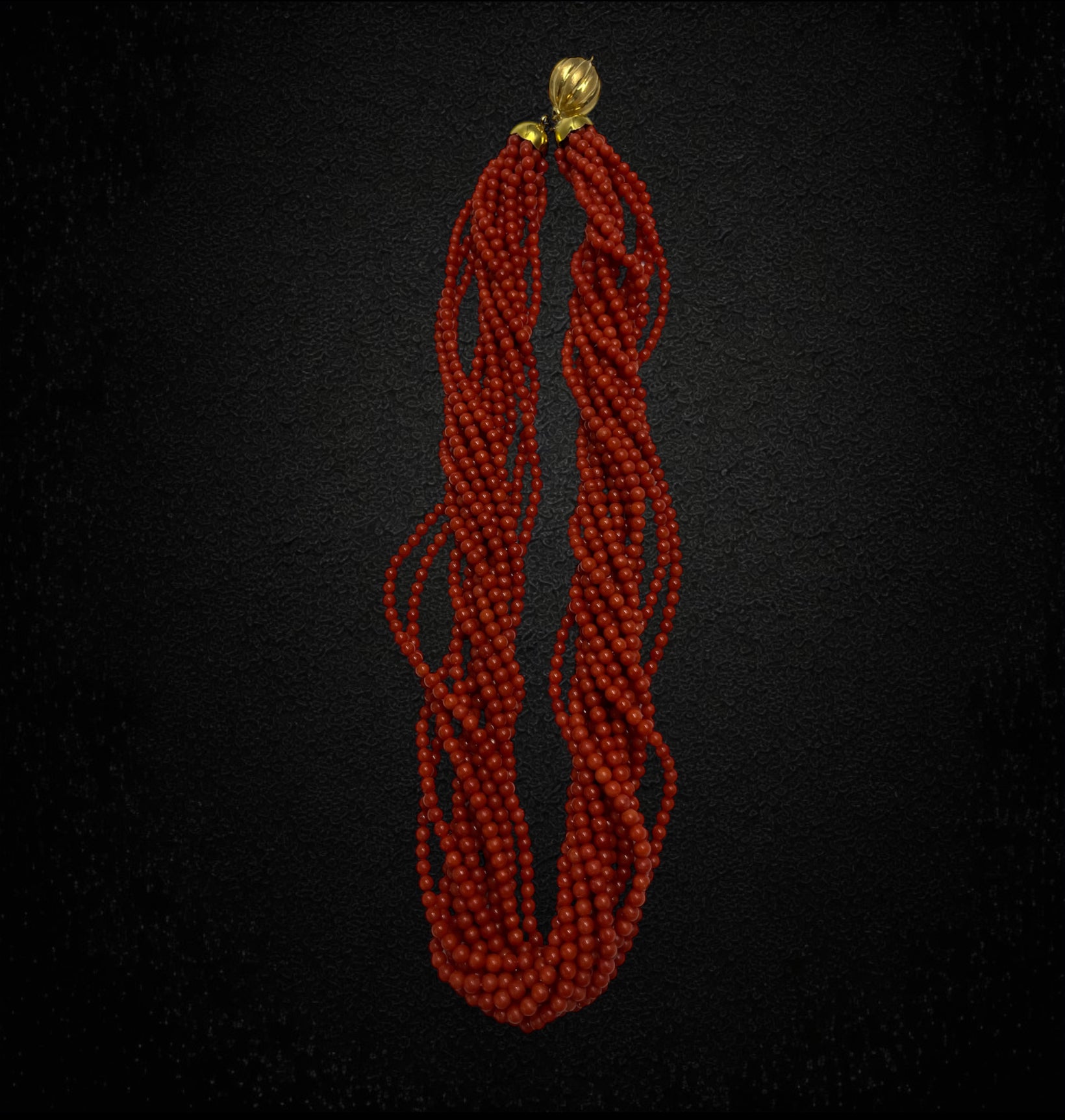 La Collana in corallo multifilo rappresenta un raffinato esempio di gioielleria italiana, creato alla fine del XX secolo.
