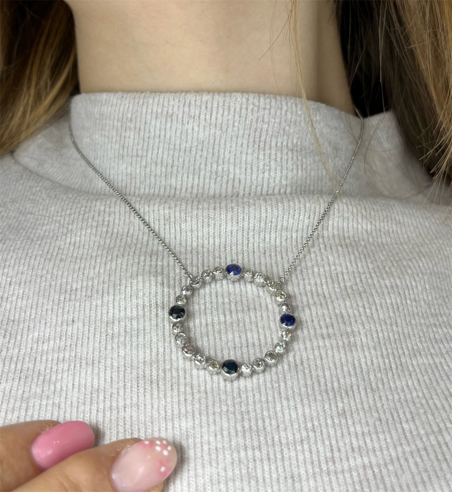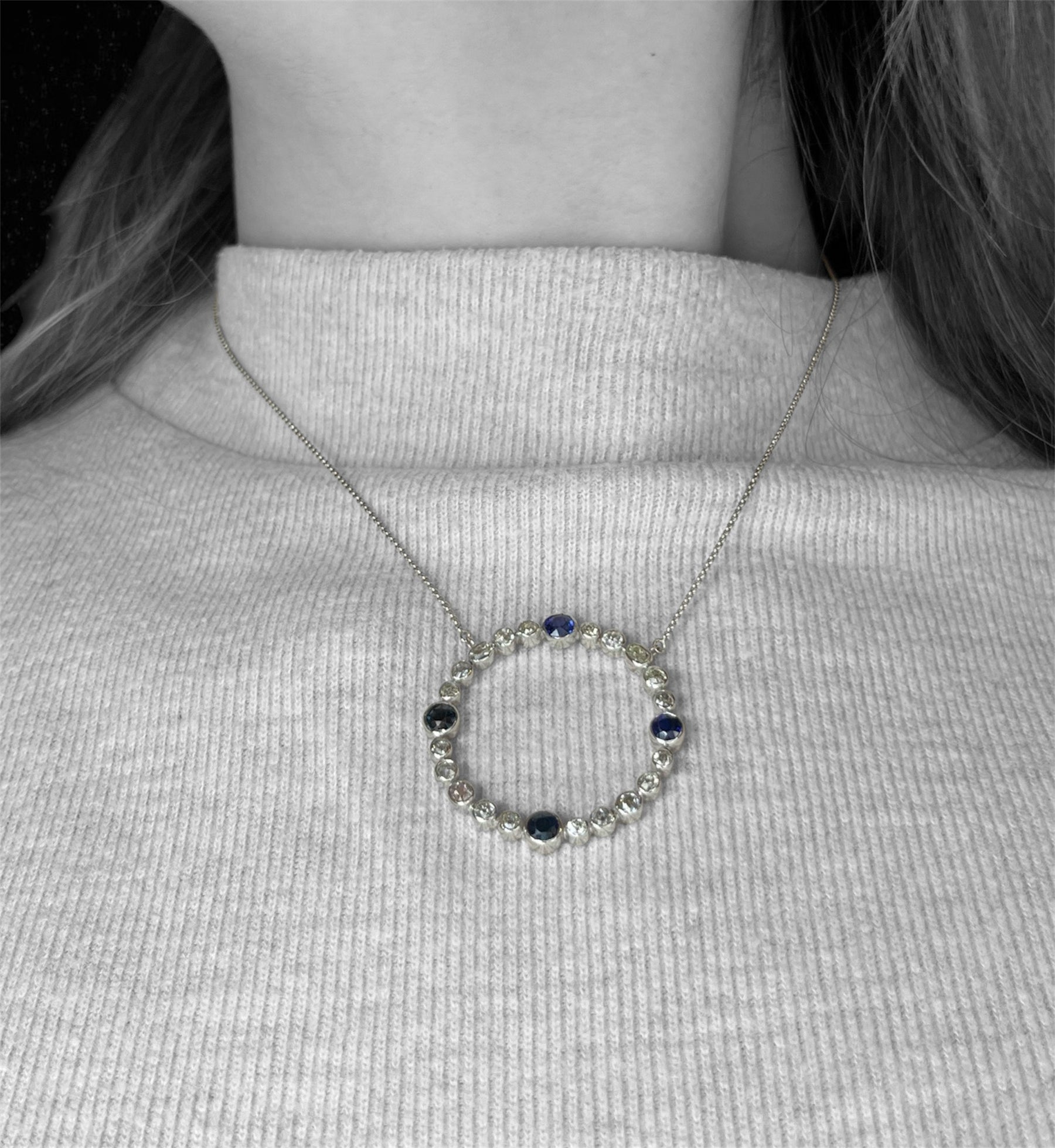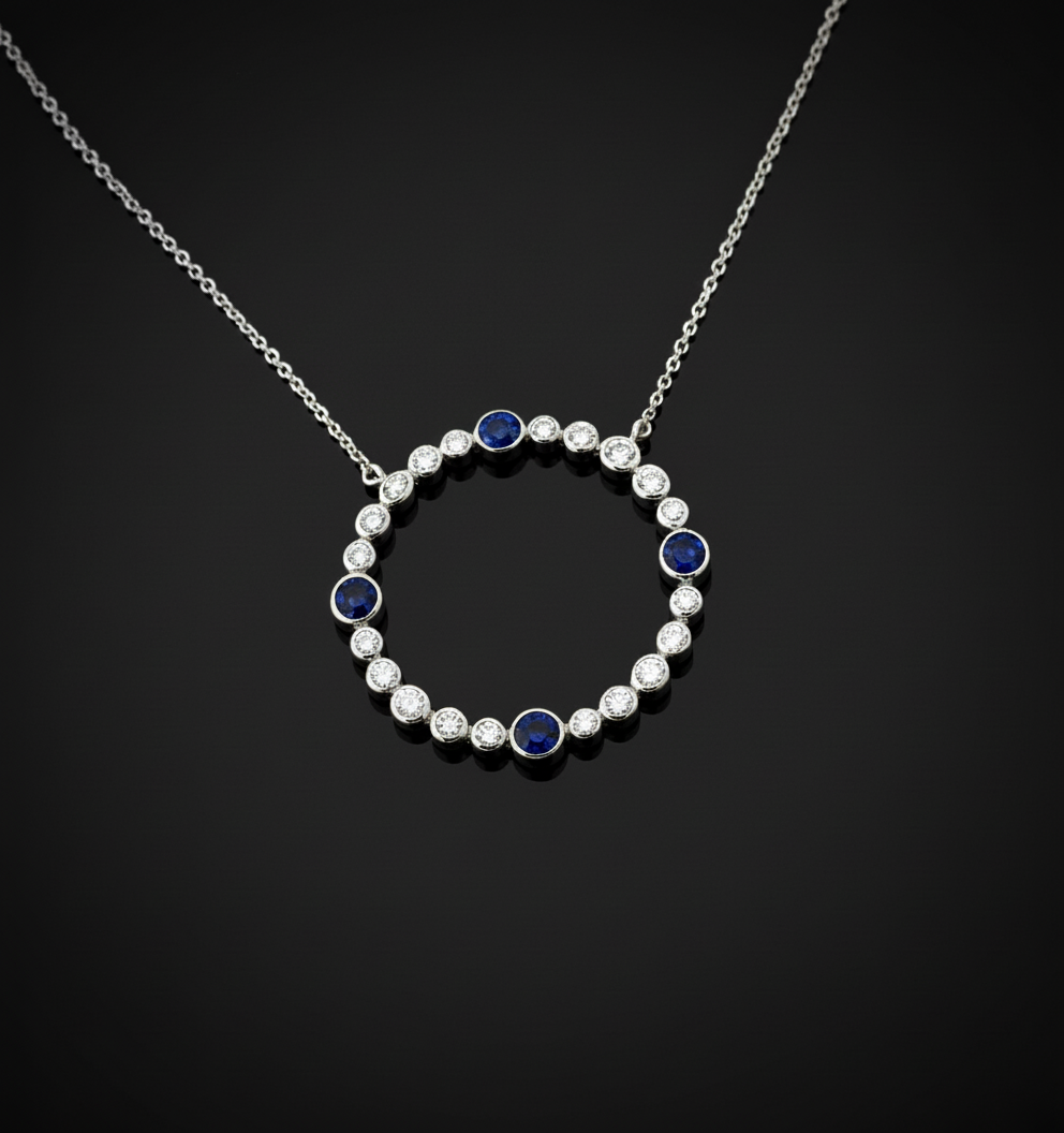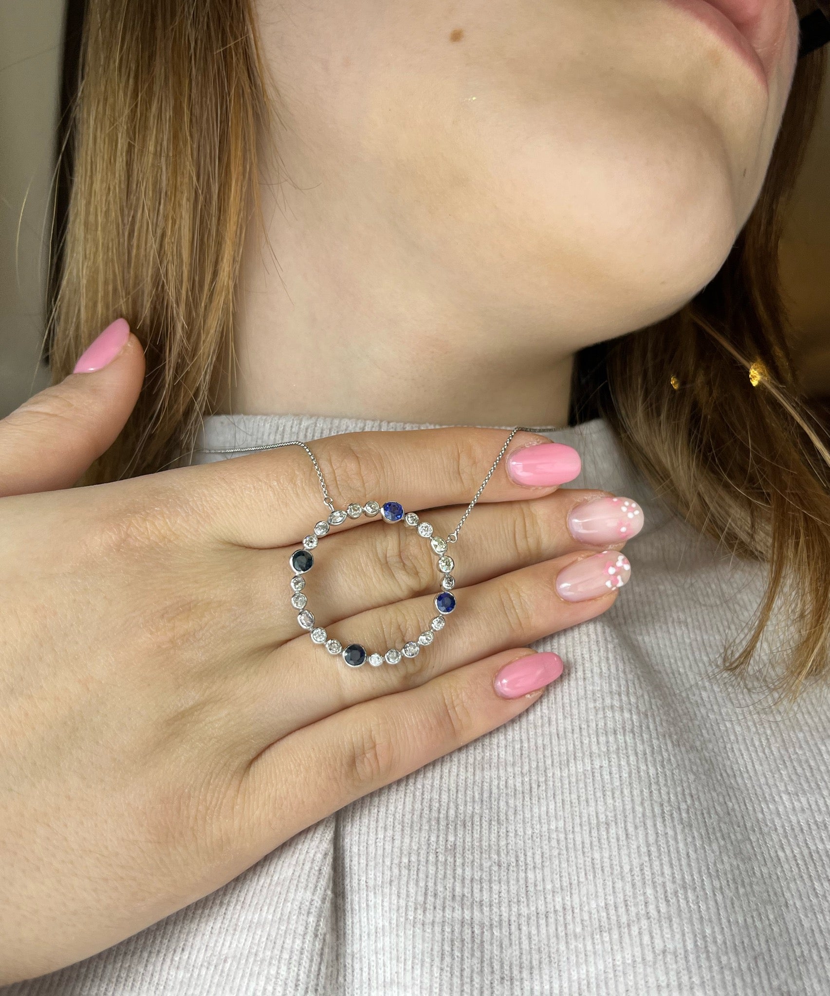 Crafted with 18K rhodium-plated white gold, this refined pendant features 20 "old European" cut natural diamonds and 4 deep blue sapphires.
