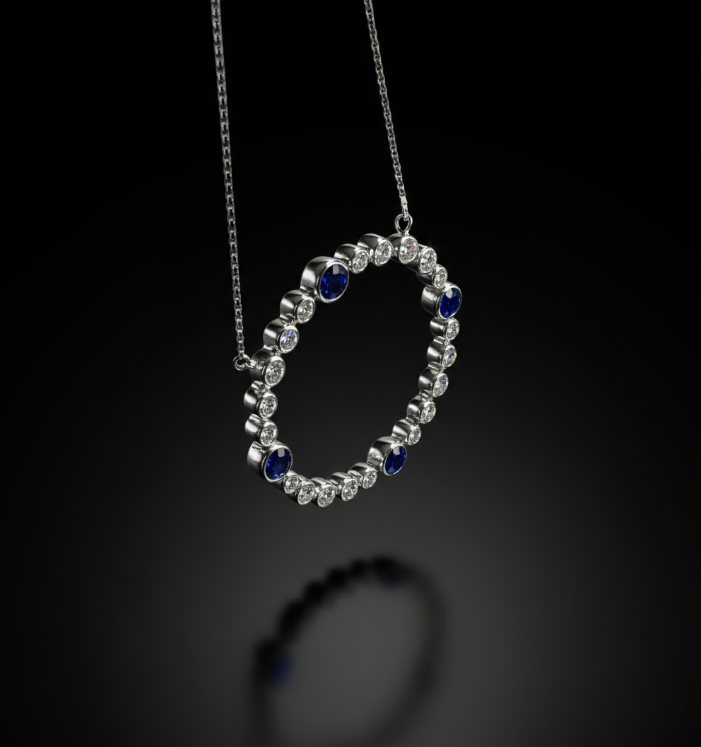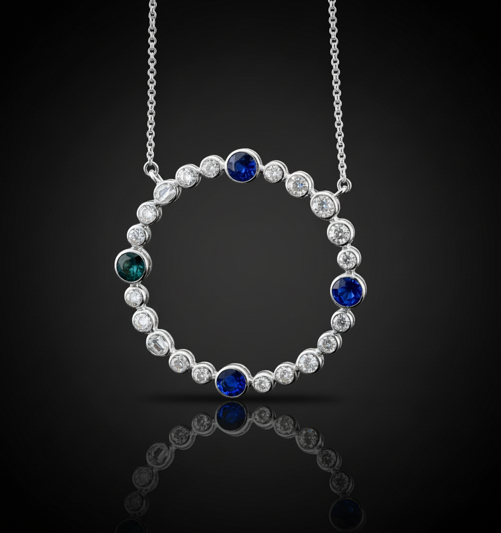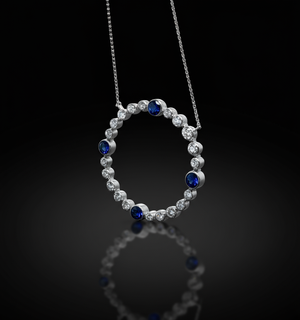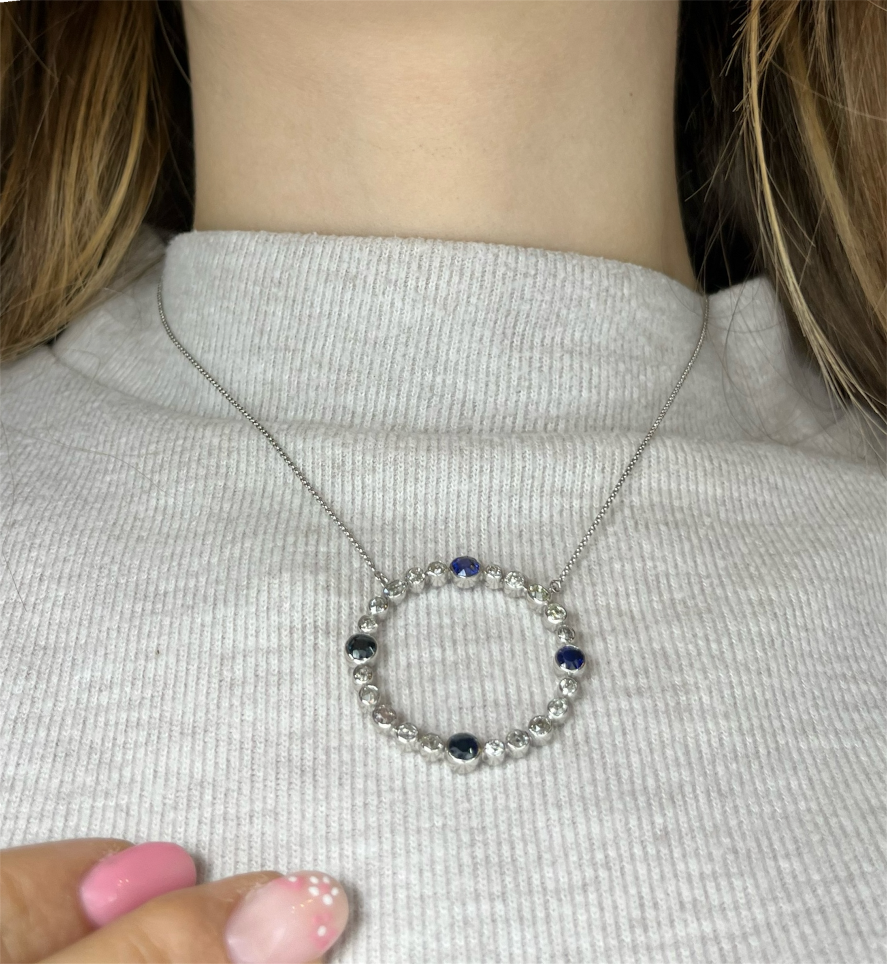 Crafted with 18K rhodium-plated white gold, this refined pendant features 20 "old European" cut natural diamonds and 4 deep blue sapphires.
