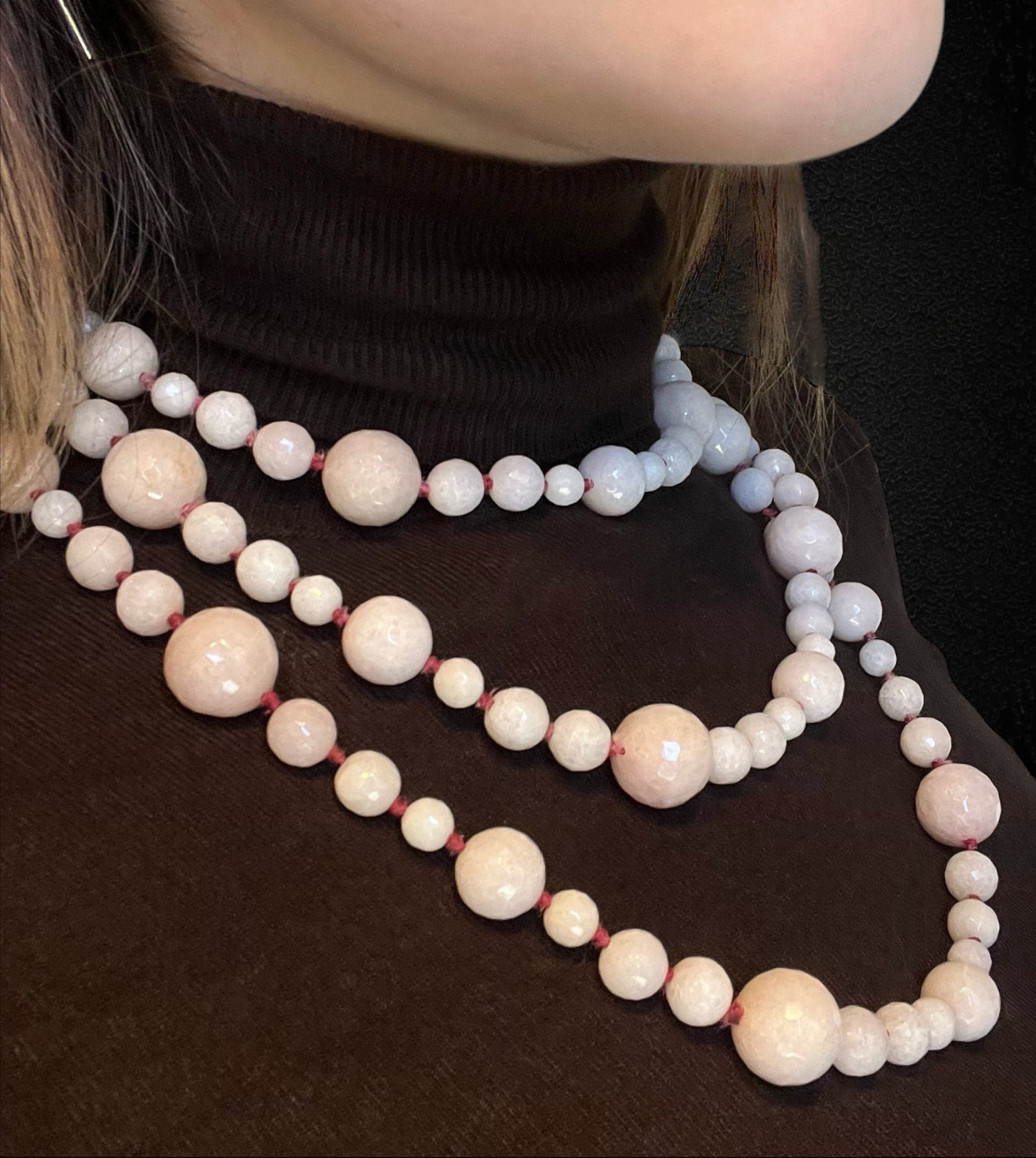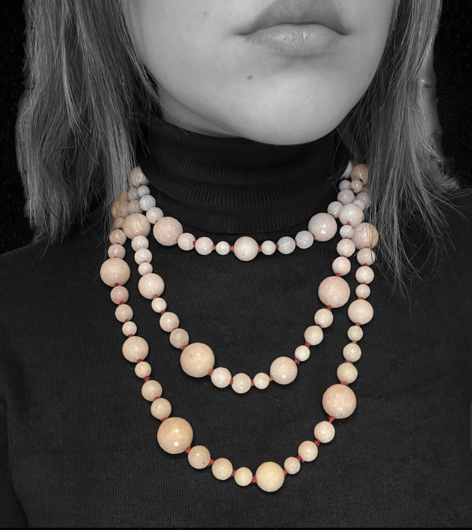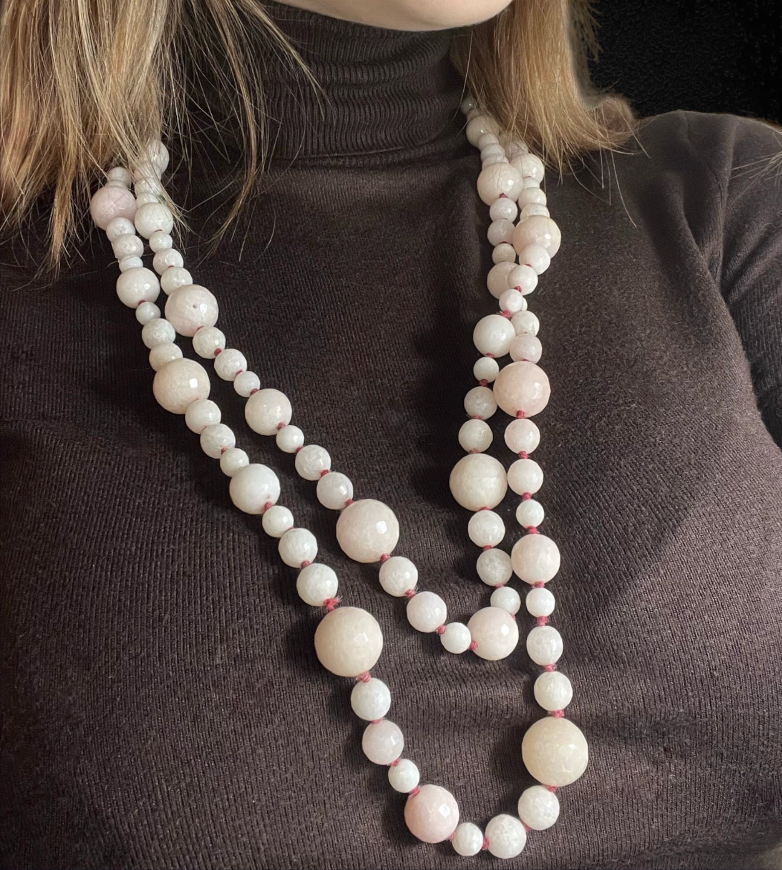 La collana in quarzo rosa è un gioiello elegante e delicato, composta da perle sfaccettate che riflettono la luce in modo affascinante. Le perle di quarzo rosa sono di forma sferica, ma con una superficie sfaccettata che le rende ancora più luminose e sofisticate. La collana presenta perle di diverse dimensioni, disposte in un pattern armonioso, con quelle più grandi alternate a perle più piccole, creando un effetto di contrasto sottile e raffinato. Le perle sono intervallate da piccole distanze, che aggiungono movimento e leggerezza al design complessivo. Il quarzo rosa, con la sua tonalità tenue e rosata, conferisce un aspetto romantico e sereno, rendendo questa collana ideale per ogni occasione speciale o per aggiungere un tocco di classe a un look quotidiano.