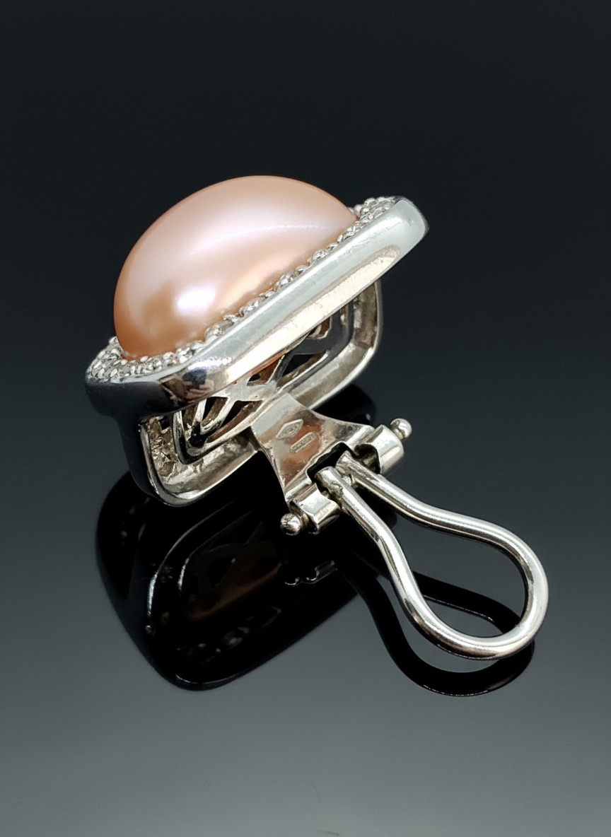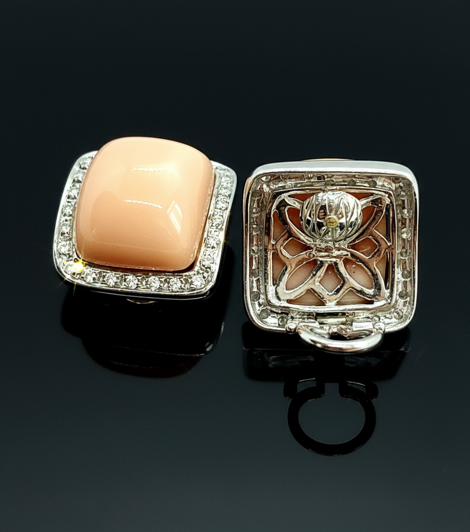Exquisite "Peau d'ange" coral and diamonds earrings, crafted in 18K white gold and boasting a total weight of 13.42 grams. Adorned with approximately 1.15 carats of dazzling diamonds, these square-shaped earrings measure 1.5x1.15 cm. With Italian production dating back to the XXth century, these earrings are in impeccable condition. Elevate your style with this stunning piece of fine jewelry.