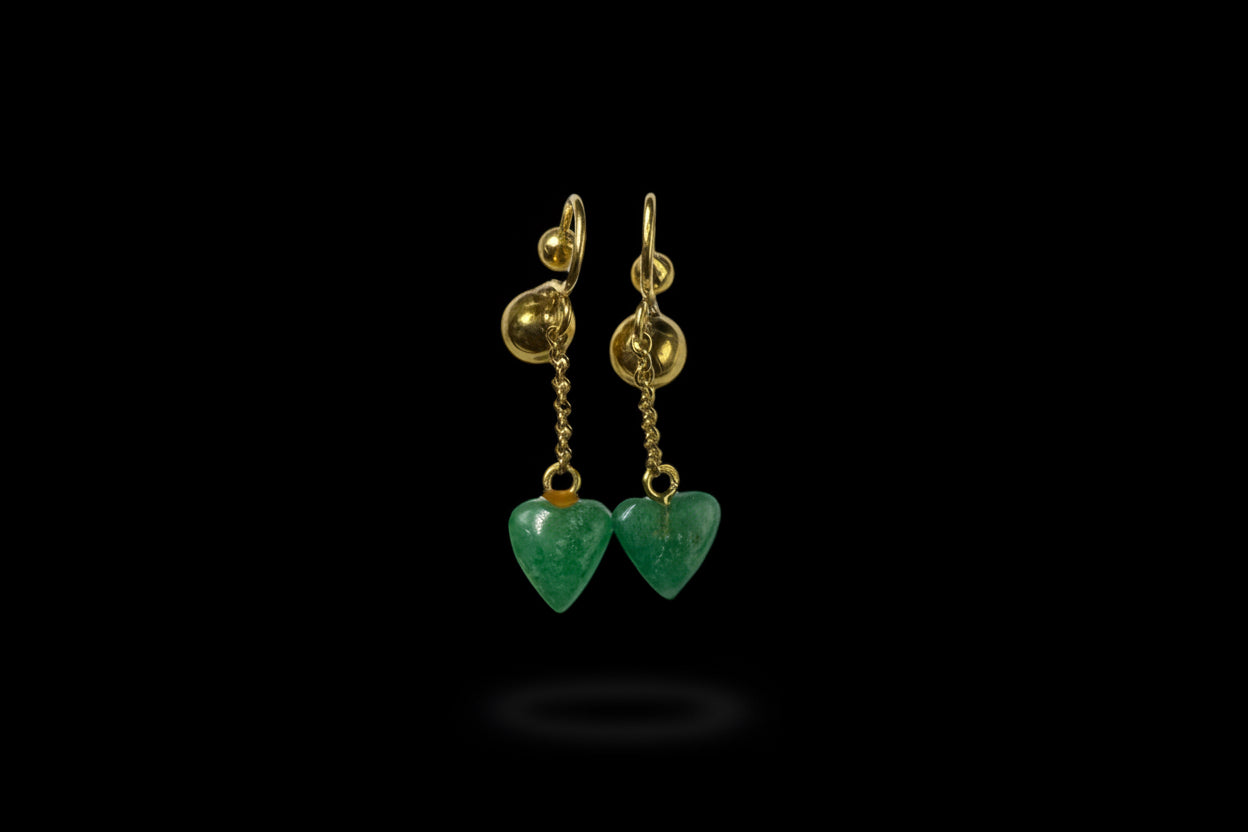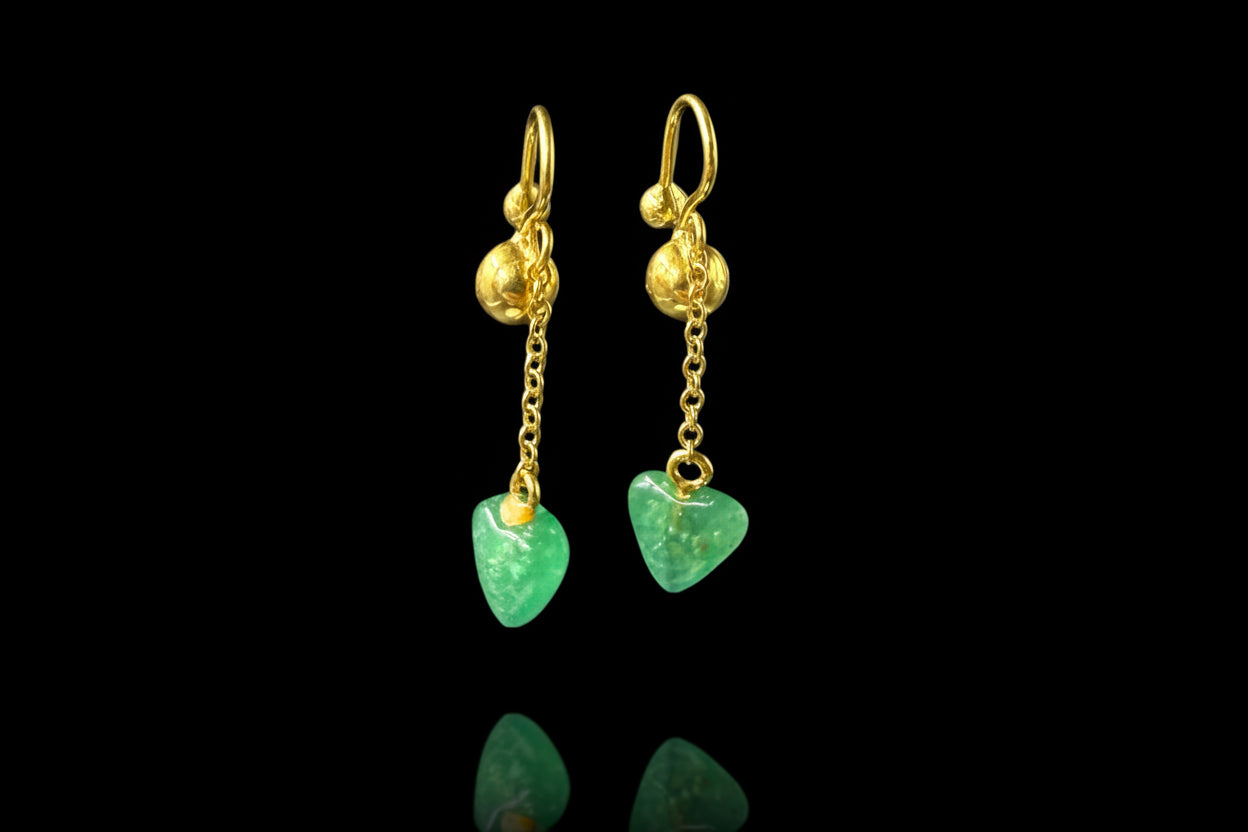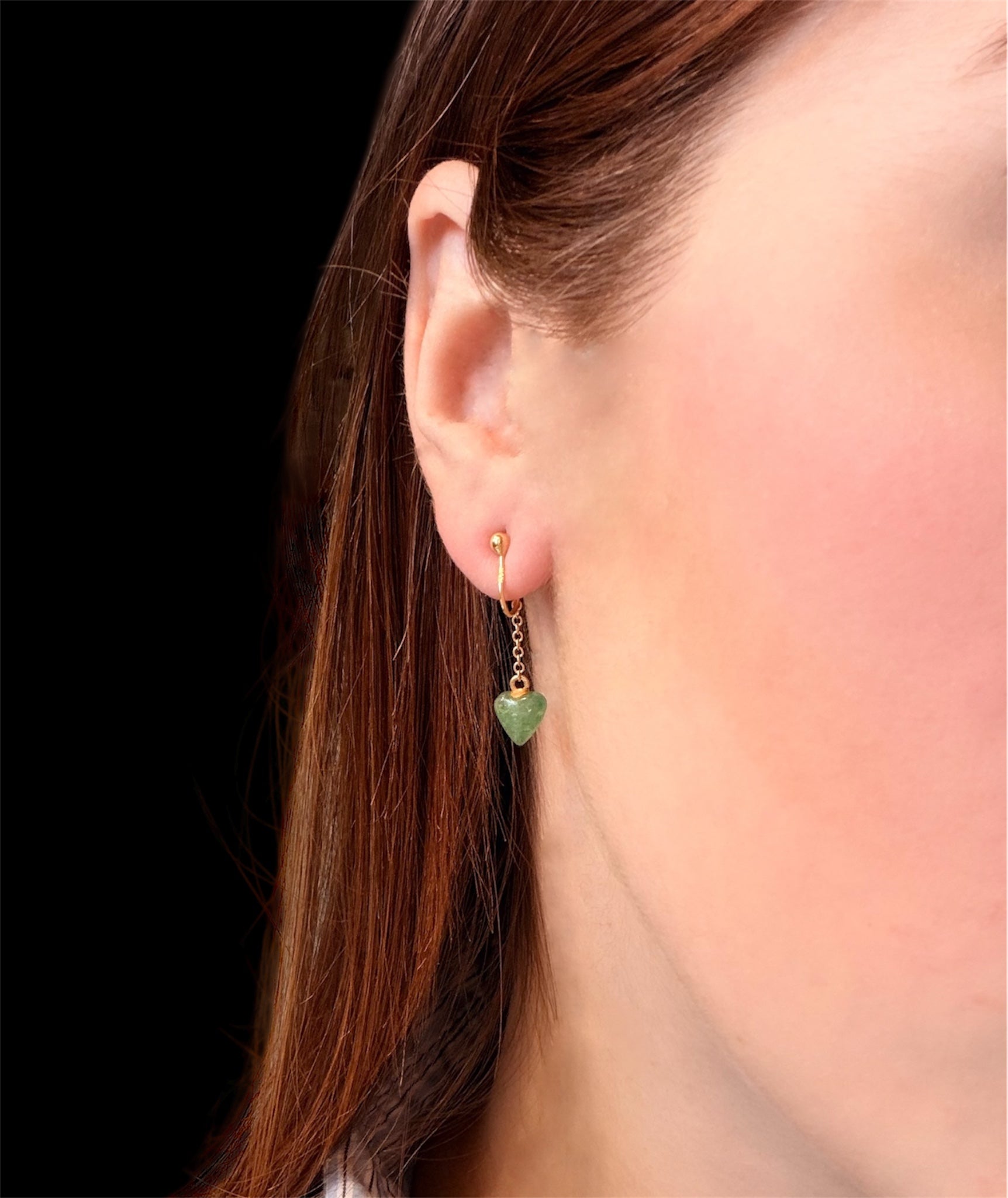 Dal morsetto parte una sottile catenella che accompagna il movimento con leggerezza, culminando in un grazioso cuore di crisoprasio. La tonalità verde brillante della pietra dona freschezza e luminosità al gioiello, creando un piacevole contrasto con il calore dell’oro giallo.