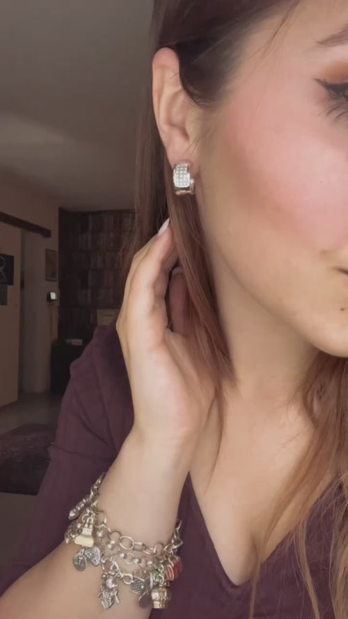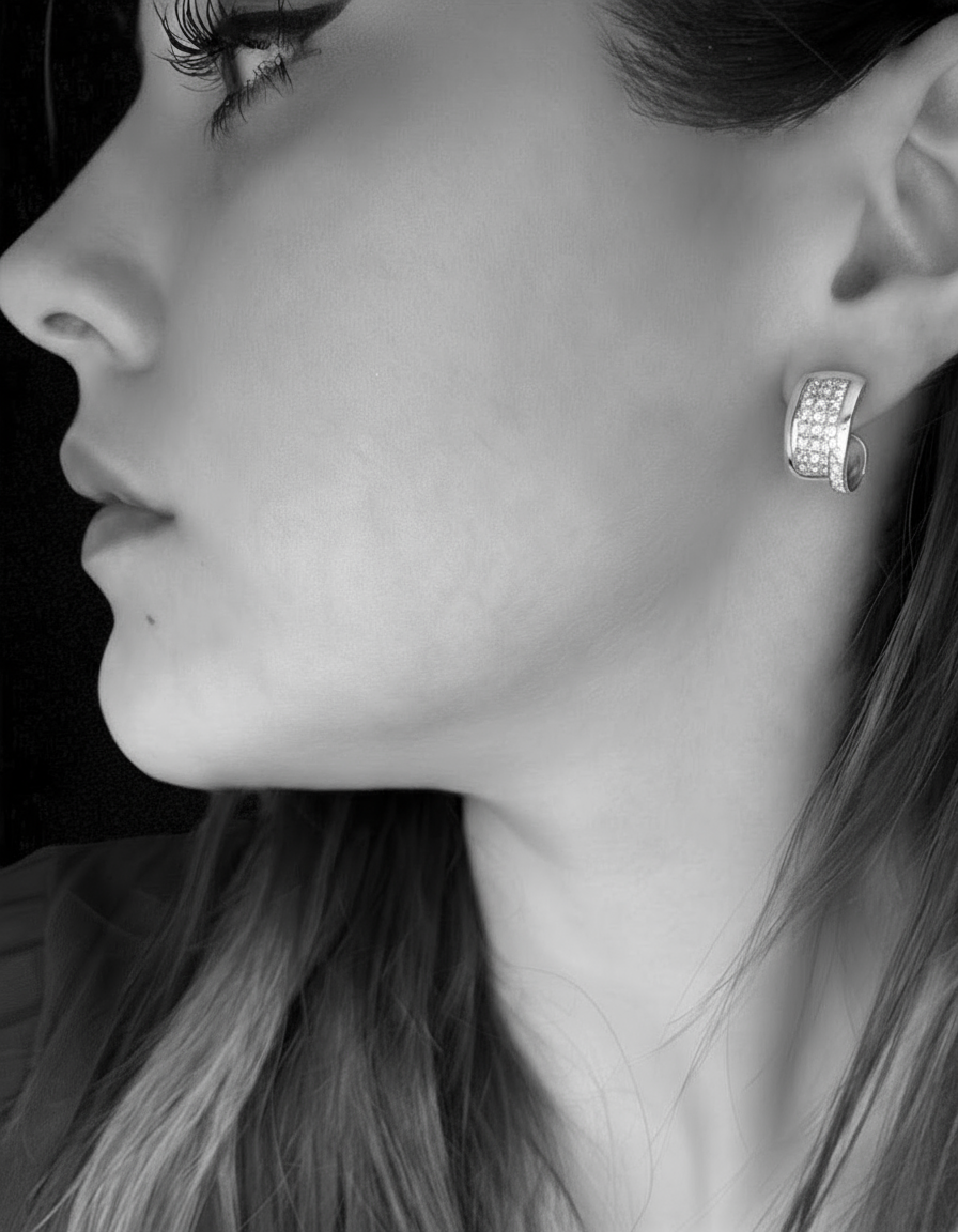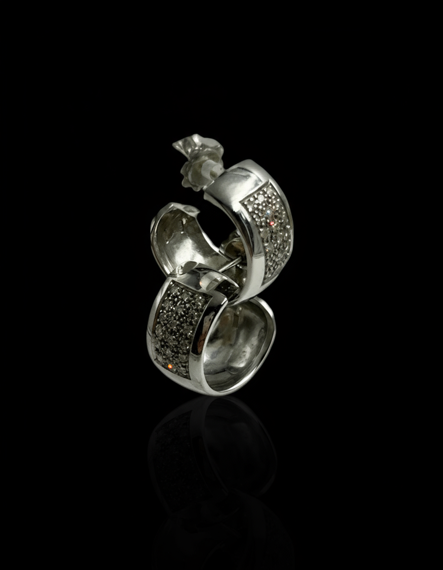 Tre file di diamanti naturali, per un totale di circa 0,50 carati per orecchino, arricchiscono la superficie con una scintillante sinfonia di luce. La disposizione geometrica delle gemme esalta la pulizia del design, donando profondità e carattere alla struttura compatta e avvolgente.