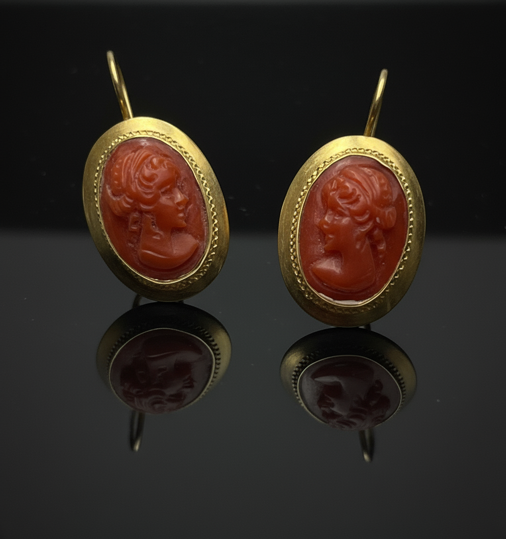 Ogni orecchino è impreziosito da un raffinato cammeo in corallo, finemente inciso per raffigurare un volto femminile di ispirazione classica. I dettagli minuziosi del profilo, dall’acconciatura ai tratti armoniosi, evocano l’arte scultorea romana, donando un fascino antico e sofisticato.