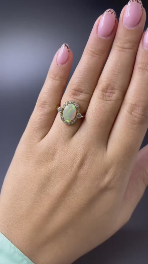 Elegantemente artigianale in Italia, questo anello a margherita in oro giallo 18 carati è un gioiello perfetto per chi cerca esclusività e raffinatezza. Il protagonista è un opale arlecchino di circa 1 carato, che con riflessi cangianti e iridescenze uniche si avvolge di luce. Una corona di 18 diamanti naturali taglio brillante, ciascuno di 0,02 carati, incornicia la pietra centrale con un delicato scintillio, mentre due diamanti aggiuntivi da 0,10 carati ai lati del castone aggiungono equilibrio e ulteriore brillantezza al design.