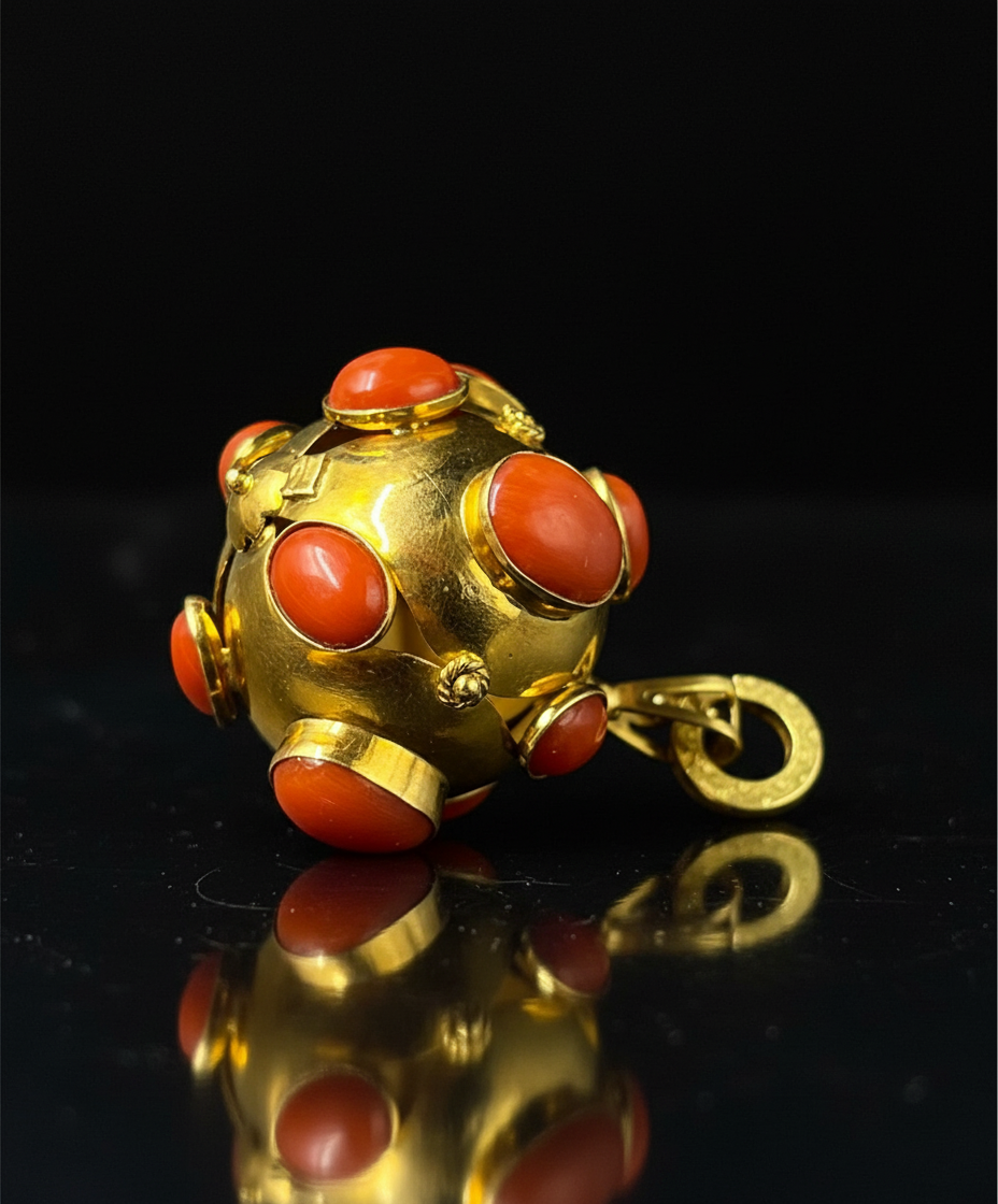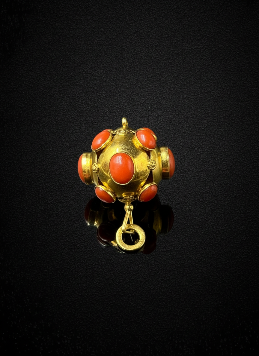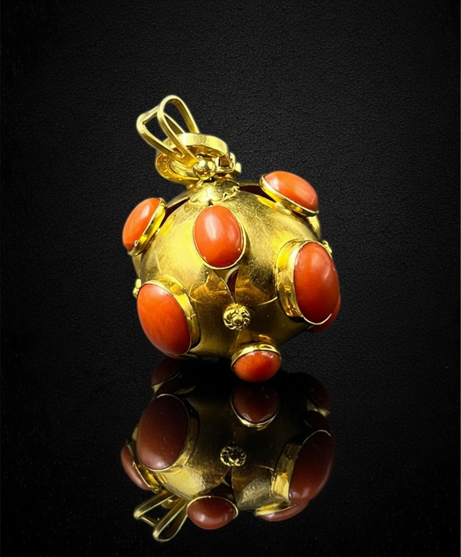 Lussuoso ciondolo "Mina" in oro giallo 18 carati, una creazione artigianale della maestria orafa italiana degli anni Sessanta. Il design è impreziosito da pregiati inserti in corallo naturale, lavorati a cabochon con raffinato gusto per un tocco di colore e morbidezza alla composizione.