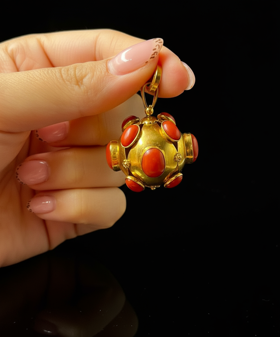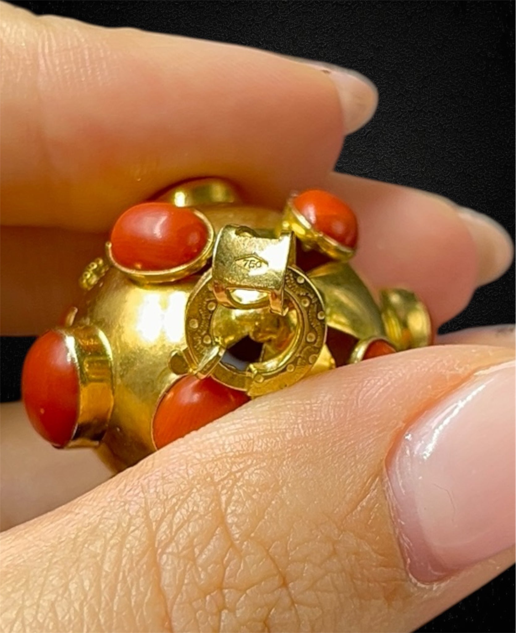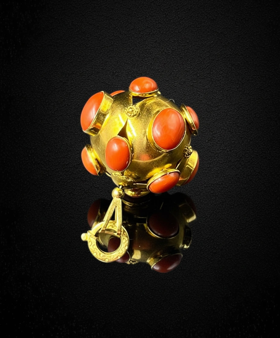 Lussuoso ciondolo "Mina" in oro giallo 18 carati, una creazione artigianale della maestria orafa italiana degli anni Sessanta. Il design è impreziosito da pregiati inserti in corallo naturale, lavorati a cabochon con raffinato gusto per un tocco di colore e morbidezza alla composizione.