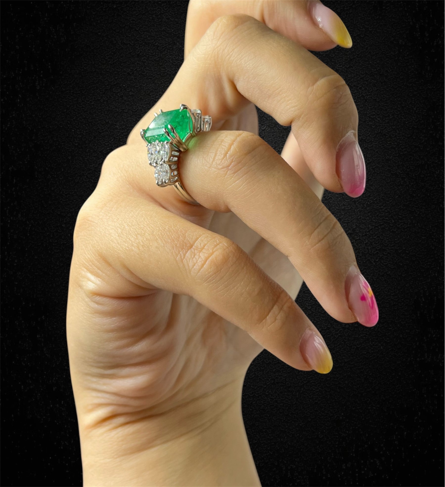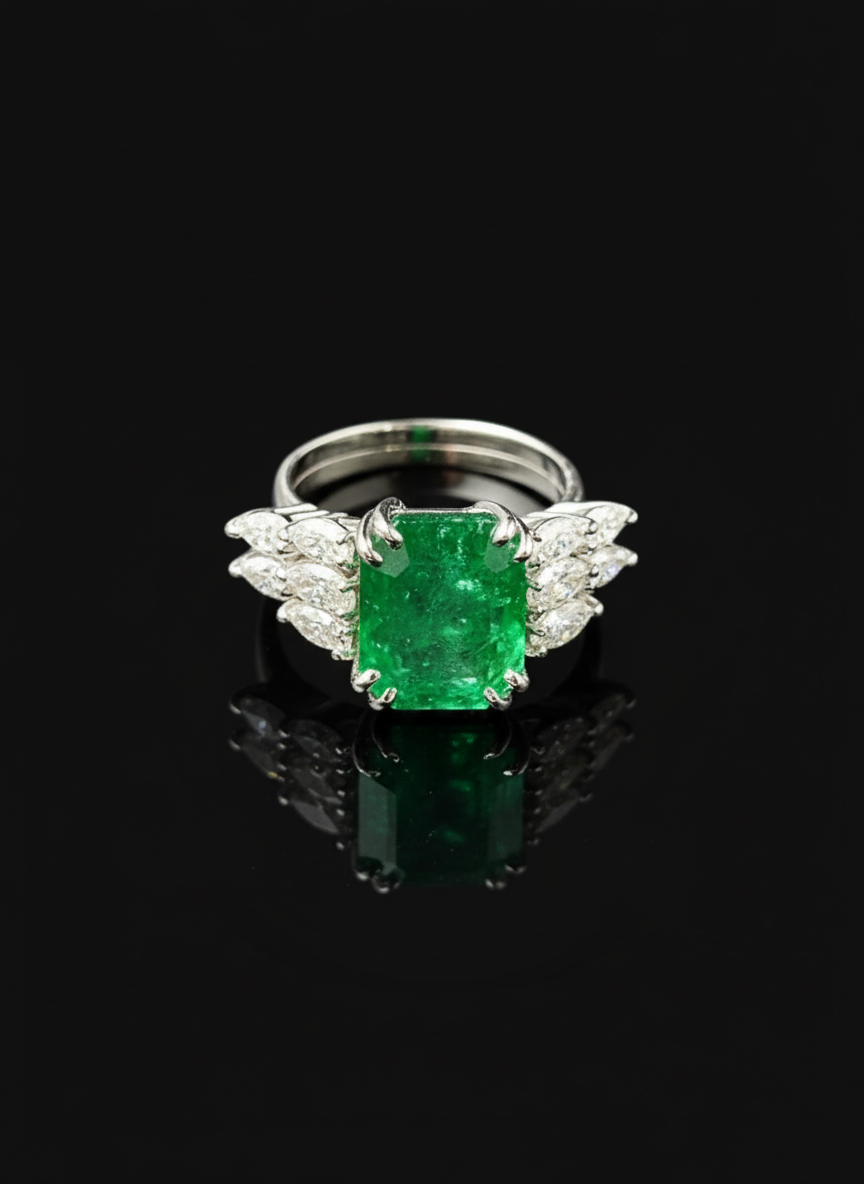Realizzato con amore artigianale, questo anello è un gioiello unico che cattura lo sguardo e racconta una storia di eleganza senza tempo. Al centro, uno splendido smeraldo dal verde intenso simboleggia l'amore eterno e la rinascita, incorniciato da 10 diamanti taglio marquise che amplificano la luminosità e il contrasto cromatico, creando un gioco di riflessi unico e incantevole. Un pezzo unico e prezioso, perfetto per celebrare i momenti più importanti della vita come un fidanzamento, un anniversario o un regalo indimenticabile. La pietra centrale è uno smeraldo naturale taglio rettangolare con un peso di 6,87 ct e un colore vslbG 5/5. Il contorno è composto da n.10 diamanti taglio marquise dal peso di ct. 1,25, colore H.