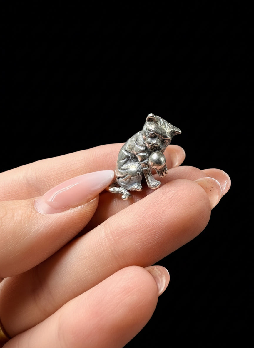 Un gattino che gioca con la palla in argento 925, realizzato con estrema cura e precisione, è un pezzo da collezione che cattura tutta la vivacità e la dolcezza felina. La scultura, realistica nei dettagli, mostra il micio in un atteggiamento giocoso: zampe delicate che afferrano la pallina, corpo agile e sguardo curioso, rendendo la scena piena di movimento e vita.