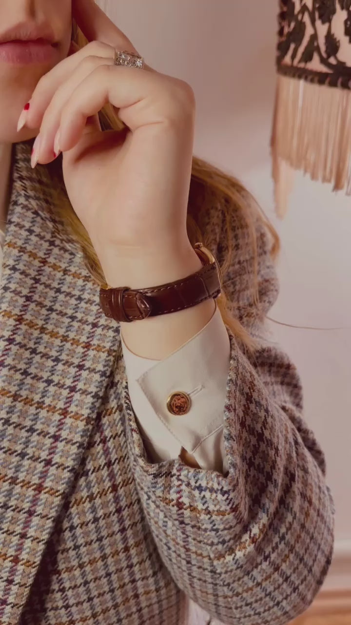 Il cinturino è realizzato in pelle marrone, con una lunghezza di 22 cm, ideale per adattarsi a diverse dimensioni di polso. Il peso complessivo dell'orologio è di 34,5 grammi.