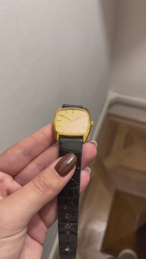 La cassa di forma, realizzata in oro giallo 18 carati, misura 34 x 38 mm e incarna l'eleganza discreta tipica dei timepiece vintage di questa epoca.