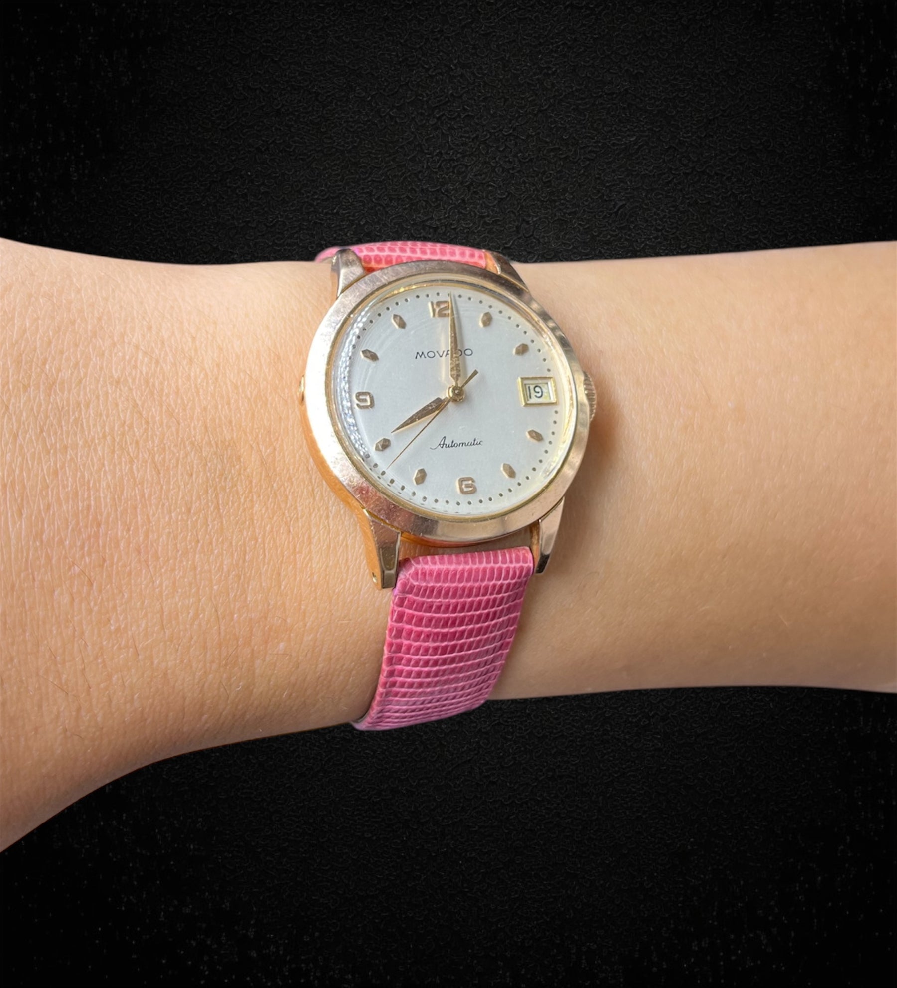Movimento: Movado calibro 224A, automatico, 17 rubini, 18.000 alternanze/ora, riserva di carica circa 40 ore