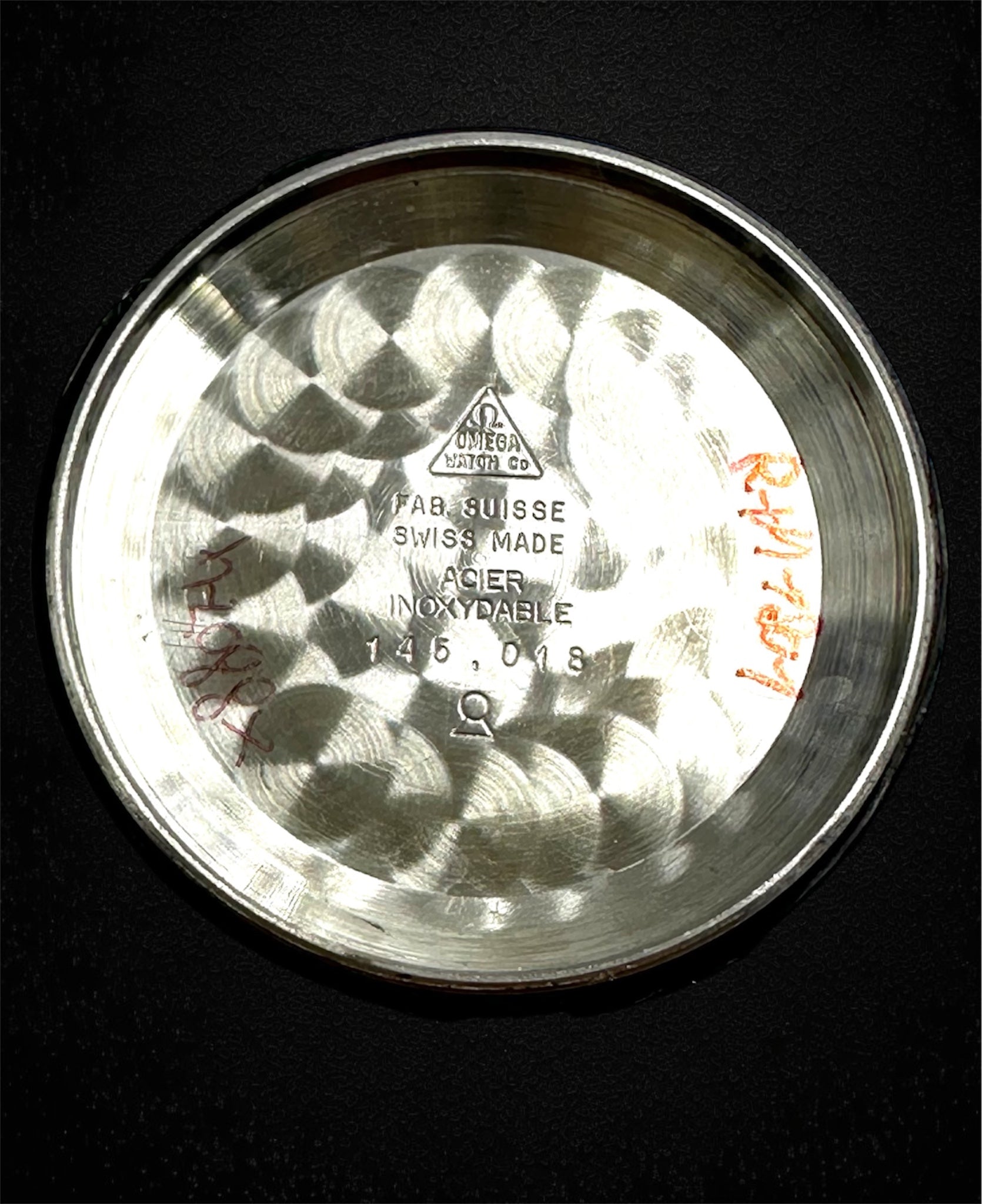 🔹 Cassa: acciaio inossidabile placcato oro 20 micron con finitura lucida, dotata di fondello a vite. I pulsanti rotondi controllano il cronografo con precisione: il pulsante superiore avvia e ferma la misurazione, mentre quello inferiore azzera i contatori. La cassa è firmata Omega Watch Co, Fab. Suisse e riporta il numero di referenza 145.018 , oltre alla corona originale con logo Omega e al vetro firmato Omega.