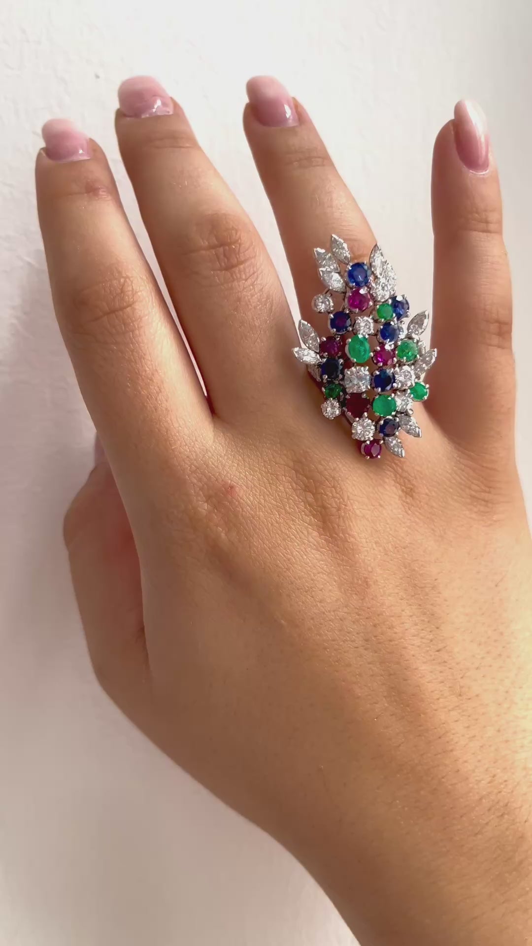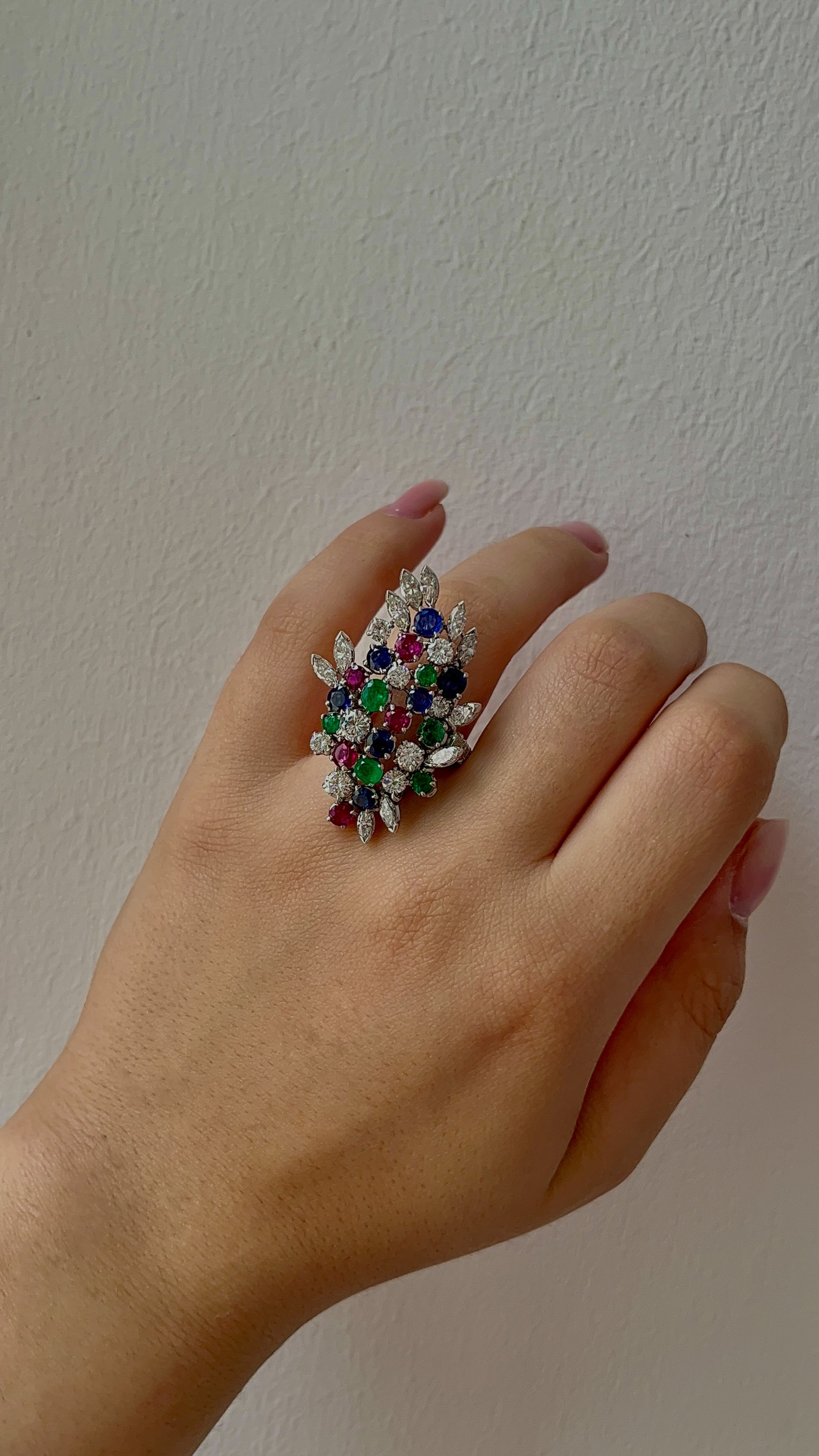 This huge and gorgeous platinum ring is adorned with diamonds (4.00 ct), emeralds (1.20 ct), rubies (1.10 ct), and sapphires (2.00 ct). Get ready to make a statement with this stunning piece of jewelry.