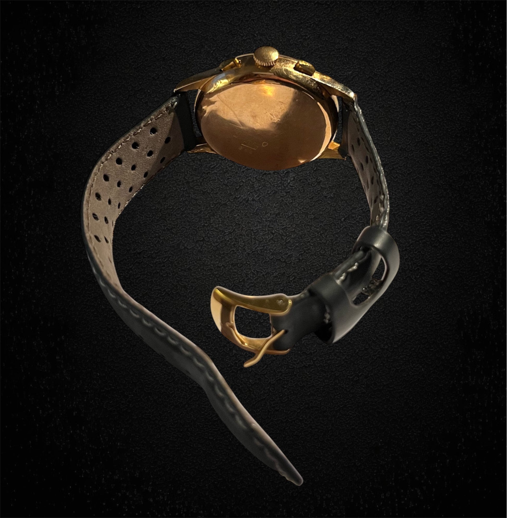 Con contatore dei secondi e contatore dei minuti, questo cronografo vanta meccaniche perfette e pulsanti leggermente usurati ma ancora efficienti.