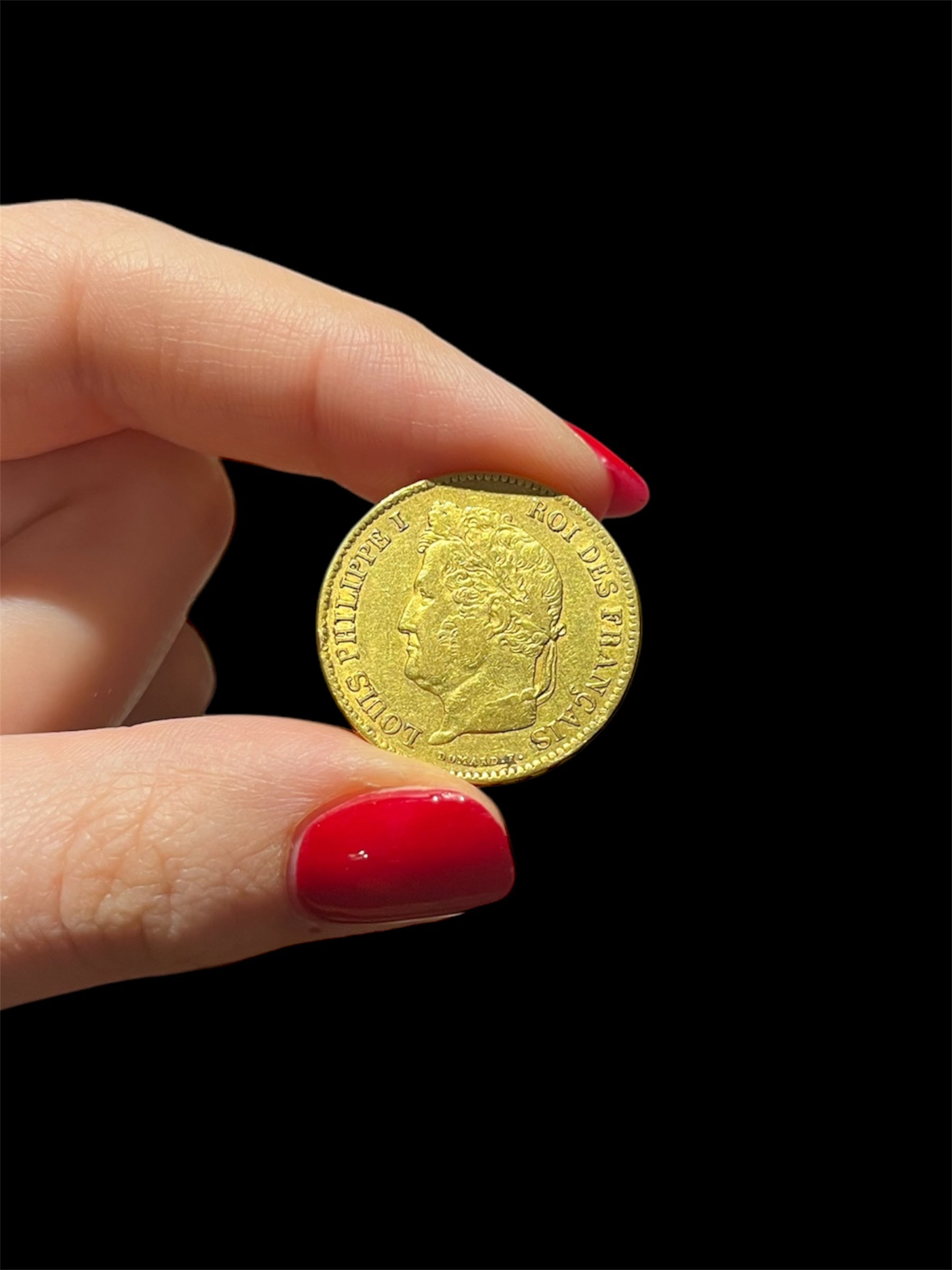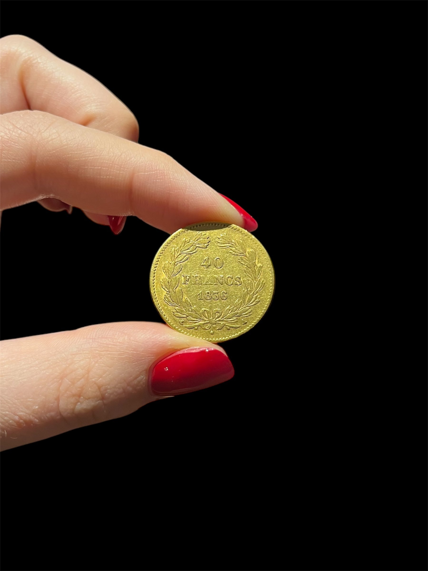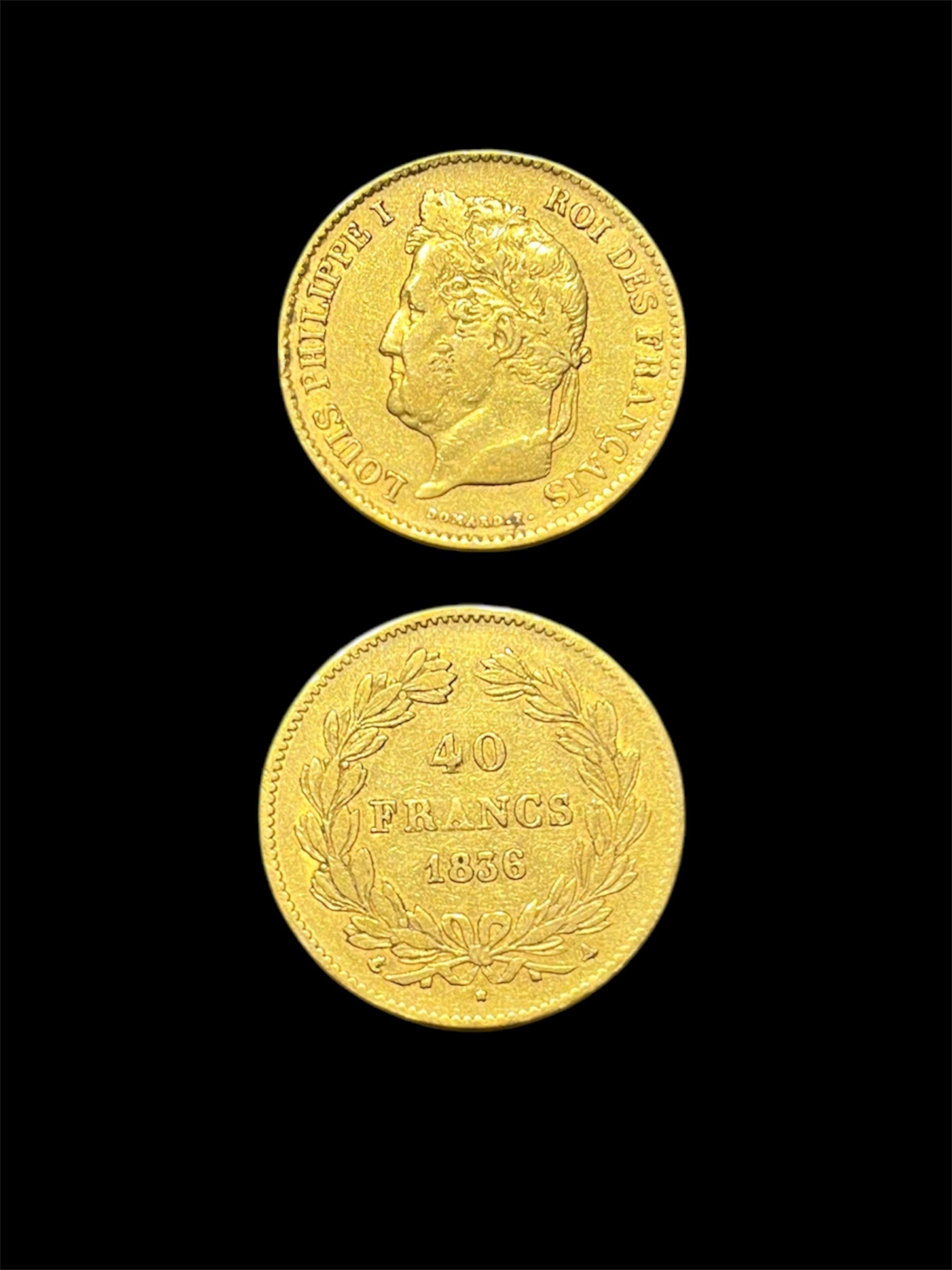 La composizione del rovescio segue uno stile classico ed equilibrato, con un'incisione raffinata che esalta il prestigio della moneta d’oro da 40 franchi, uno dei tagli più significativi del periodo della Monarchia di Luglio.