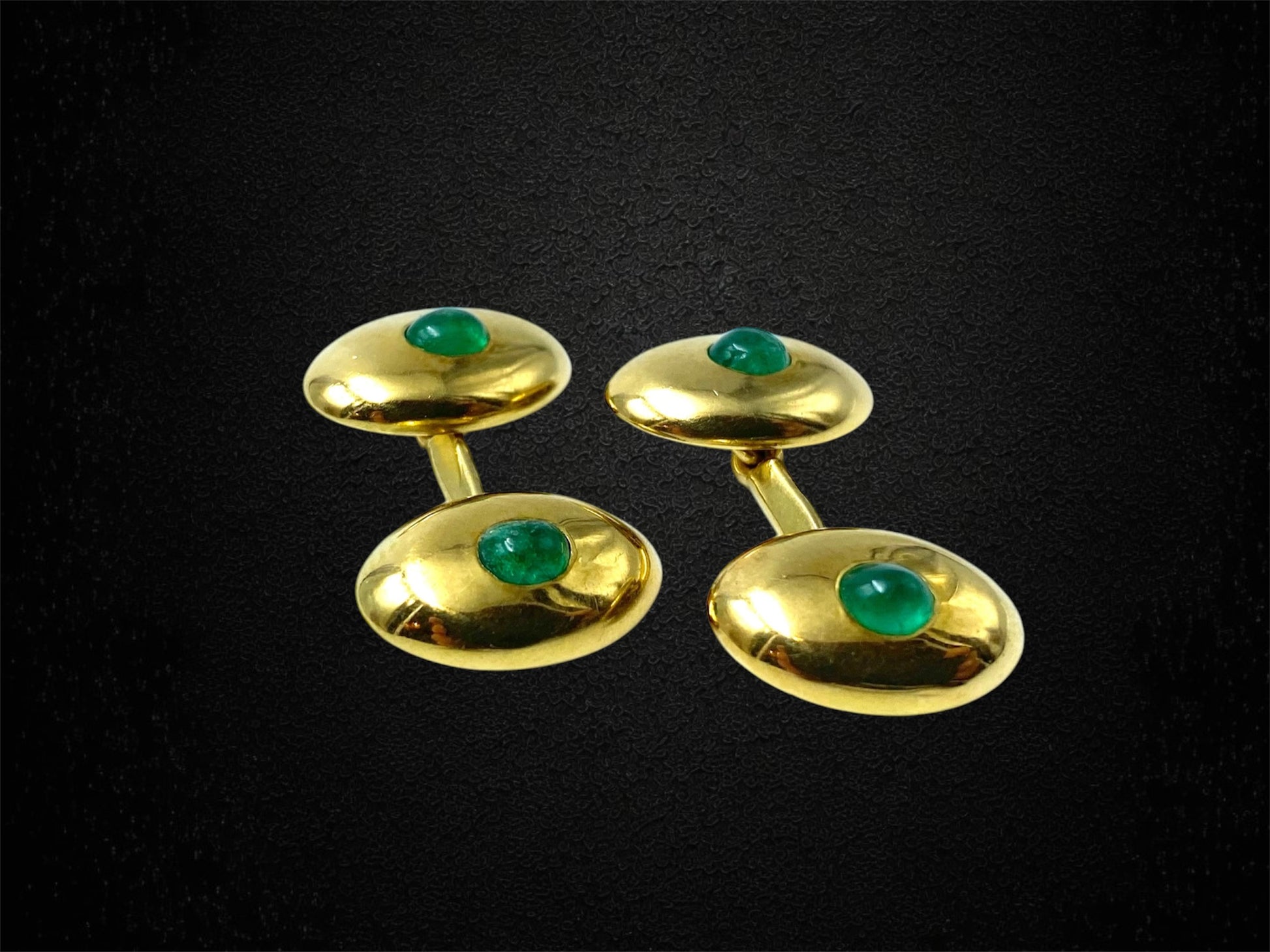 Add a touch of elegance to your attire with these stunning Cabochon emerald cufflinks. Crafted with 18 kt yellow gold and adorned with natural emeralds, each weighing 0.25 ct. The total carat weight of the emeralds is 1.00 ct. These unisex cufflinks were made in Italy in the 1940s, showcasing timeless style and craftsmanship. Elevate your look and make a statement with these exquisite cufflinks.
