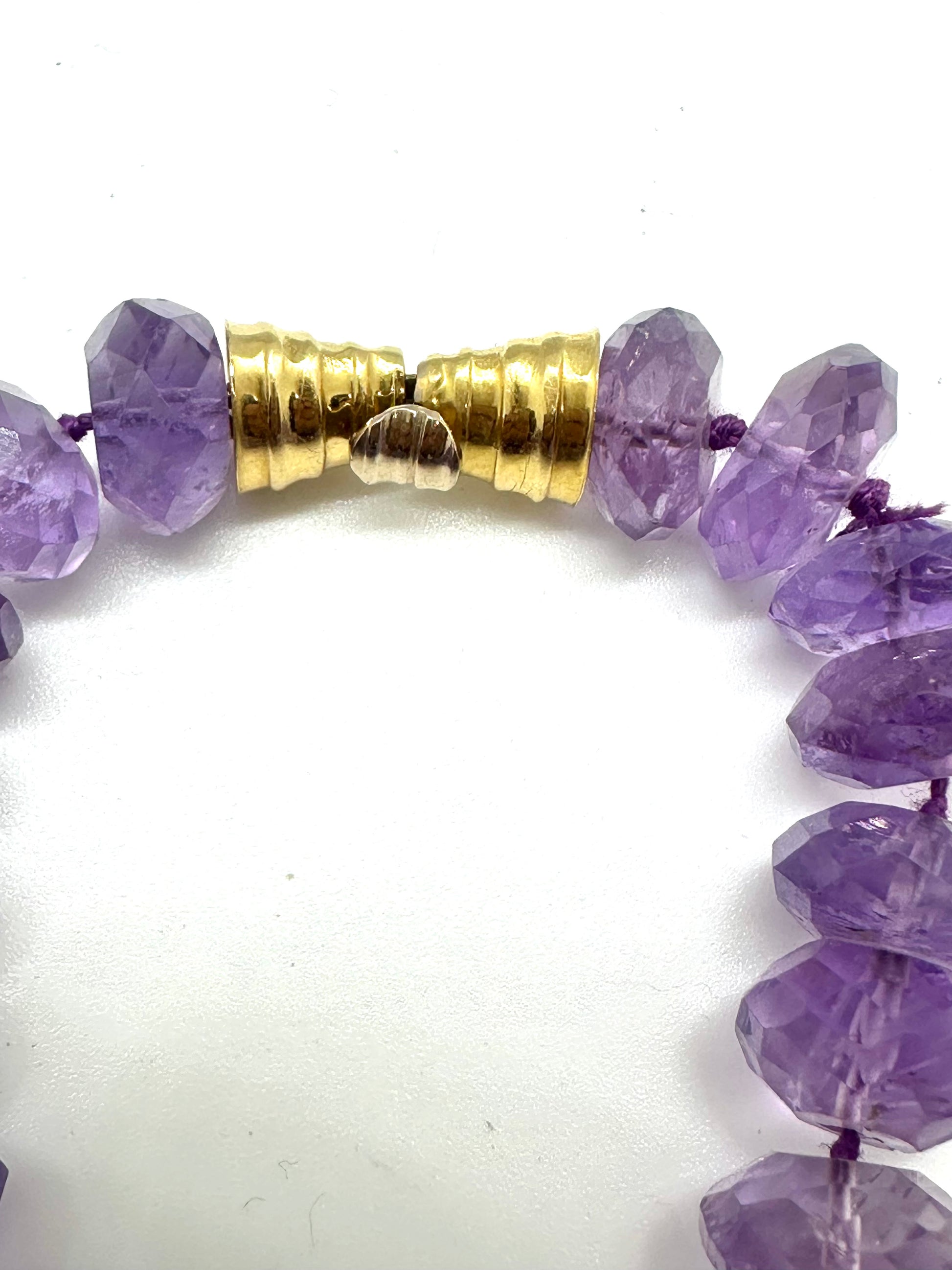 La chiusura in oro giallo 18 carati, finemente rifinita a mano, non solo assicura comfort e sicurezza, ma aggiunge un elemento di lusso e raffinatezza. La calda tonalità dell’oro si armonizza perfettamente con il viola intenso delle ametiste, creando un equilibrio cromatico di rara bellezza. Ogni dettaglio, dalla disposizione delle pietre alla lavorazione della chiusura, testimonia la cura e l’abilità dell’artigianato italiano.