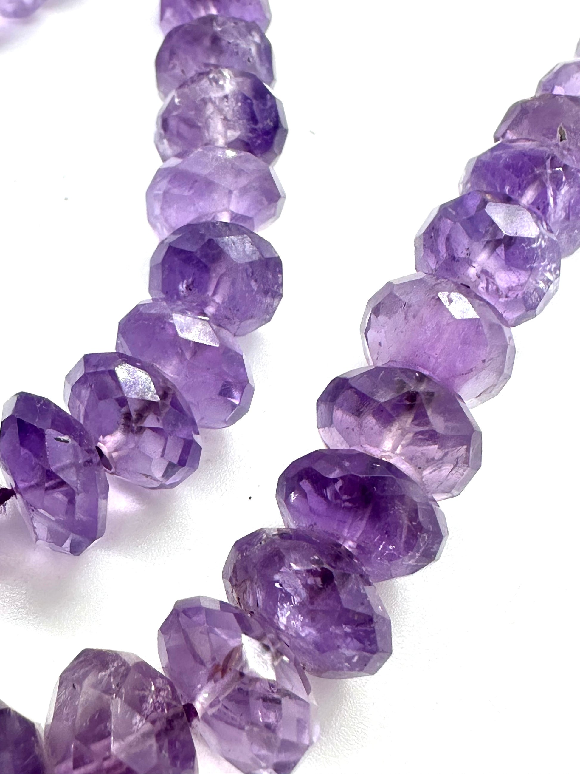 Questa straordinaria collana è un gioiello senza tempo che celebra l'eleganza della natura e la maestria artigianale. Composta da una successione di sfere sfaccettate di ametista, ogni pietra, accuratamente selezionata, cattura e riflette la luce con grazia, rivelando le tonalità profonde e vellutate del viola, tipiche di questa gemma preziosa. Le sfaccettature sapientemente lavorate esaltano la purezza del colore e donano un tocco di luce iridescente ad ogni movimento, conferendo alla collana un fascino magnetico e sofisticato.