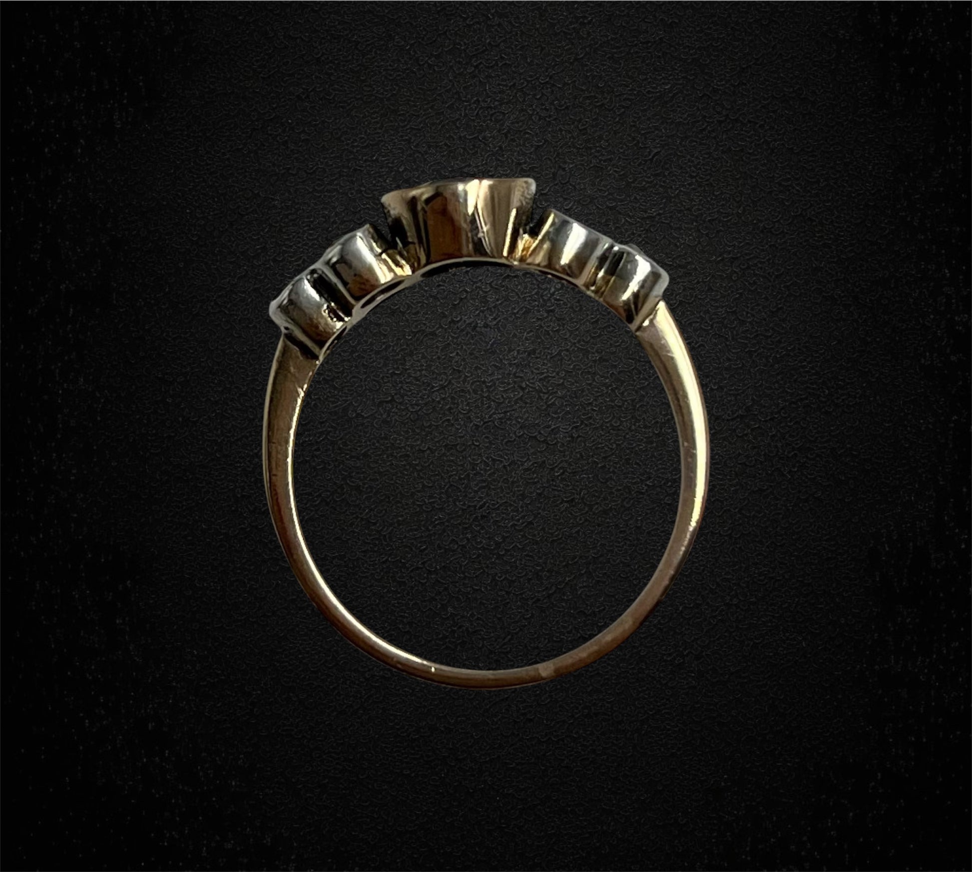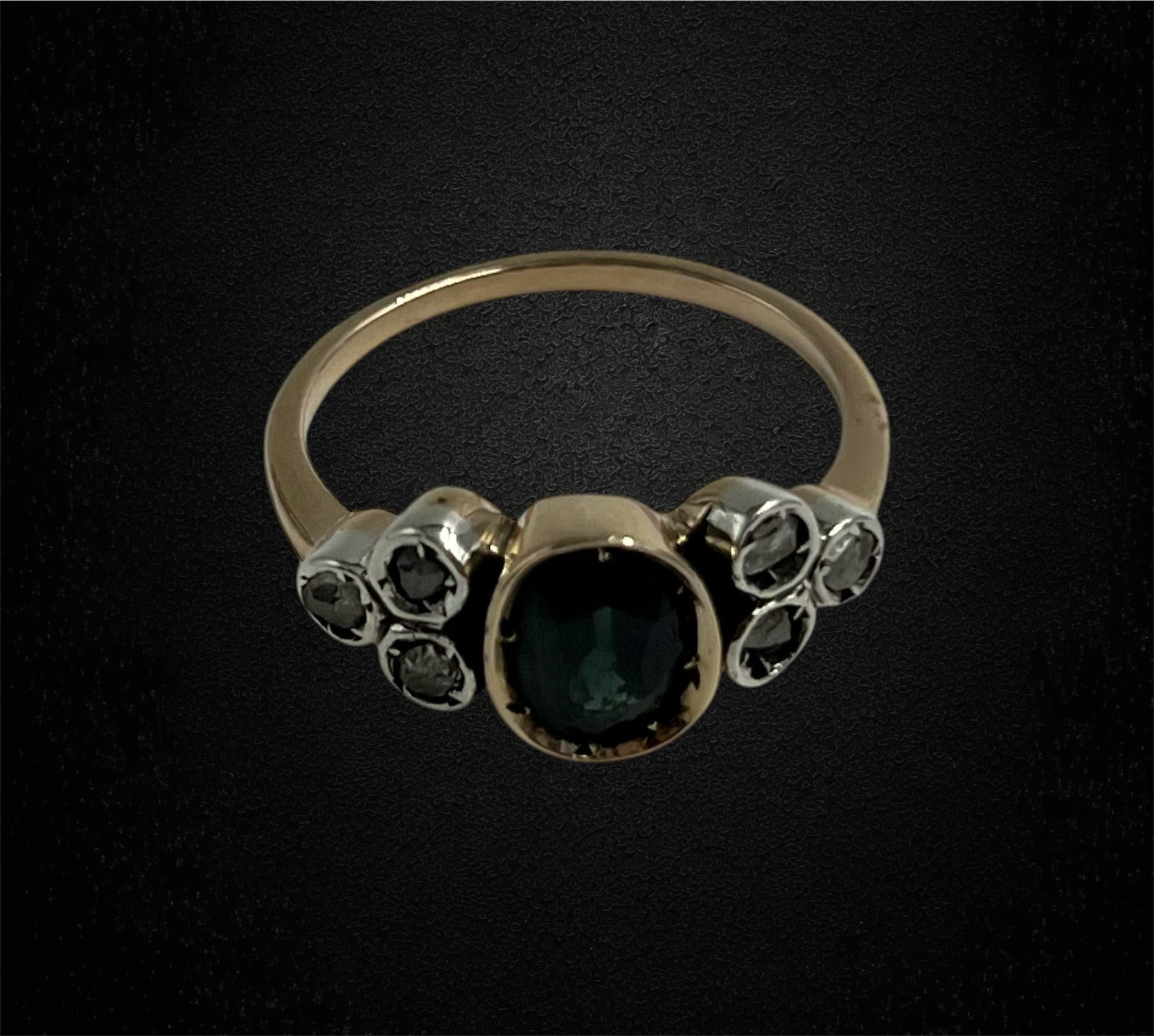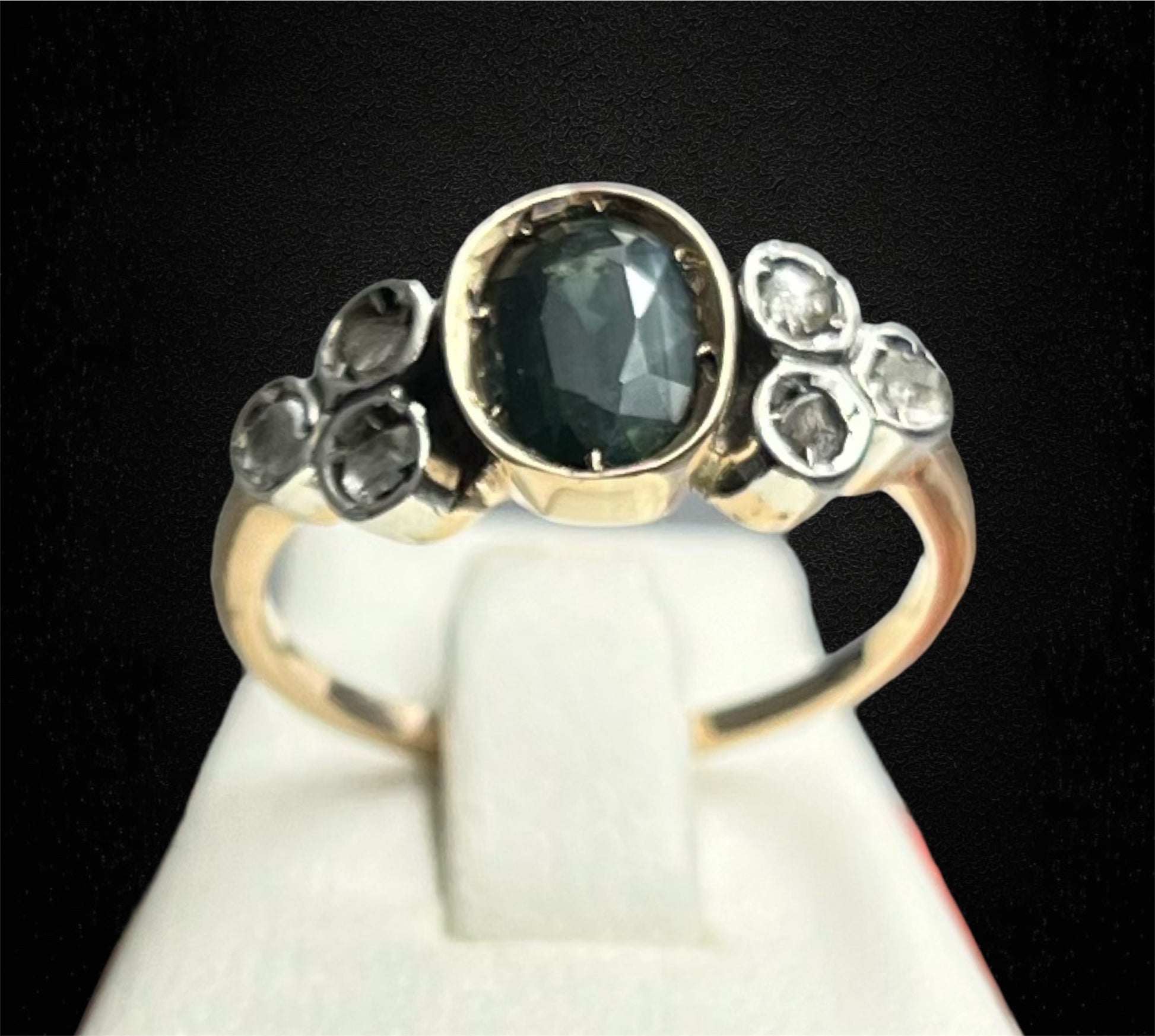 Su entrambi i lati dello zaffiro, si trovano tre castoni disposti a fiore, ognuno contenente un diamante taglio a rosa, che conferisce brillantezza e luce al gioiello, creando un affascinante contrasto con la profondità del zaffiro. I castoni superiori sono realizzati in argento, una scelta che esalta ulteriormente la bellezza delle pietre, mentre il fusto in oro giallo completa la composizione con una base calda e solida.