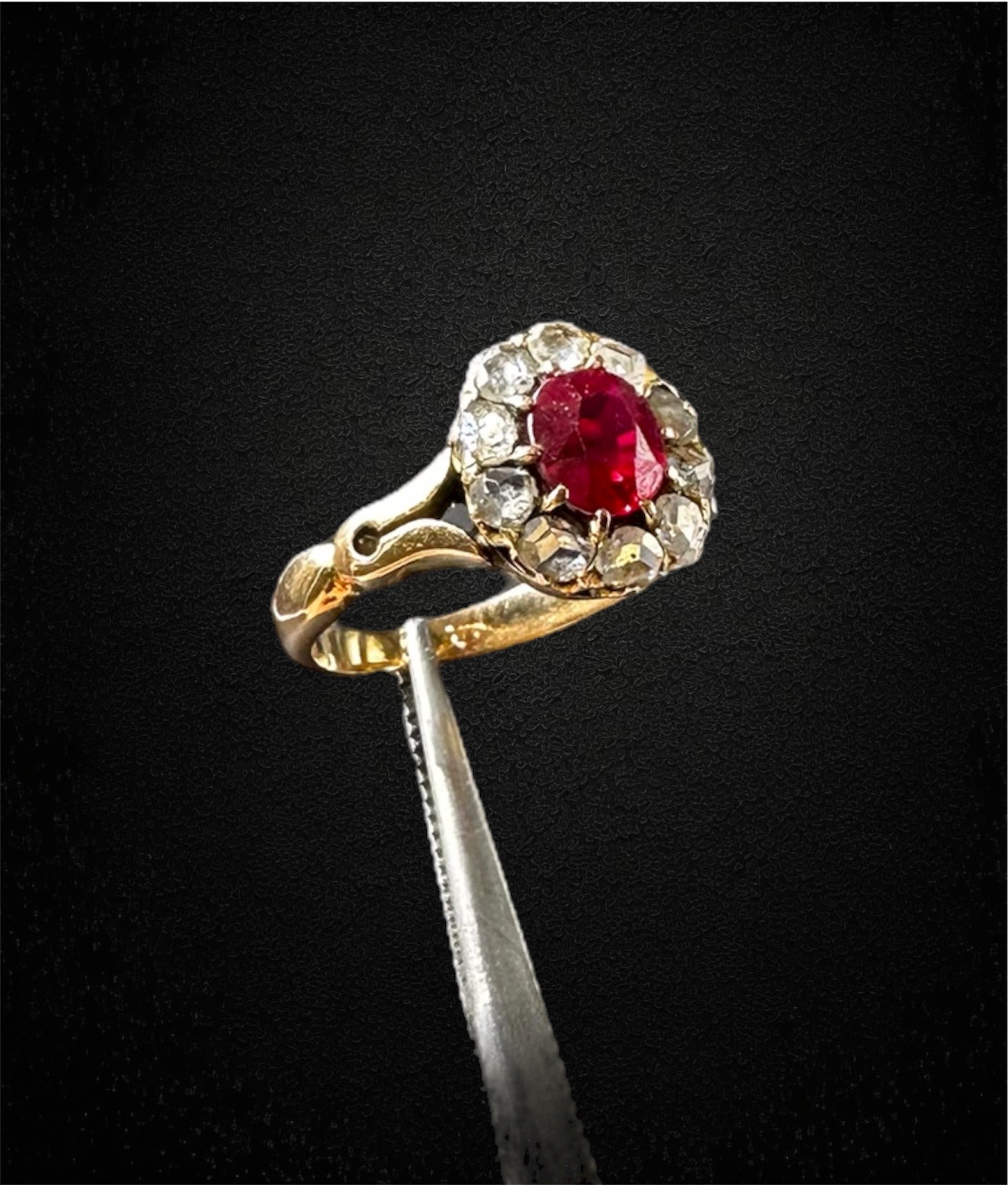 Al centro, protagonista assoluto, un rubino naturale dal colore rosso intenso (ct. 0,70) irradia calore e passione, simbolo eterno di amore profondo. Attorno a esso, dieci diamanti tagliati a huit/huit (ct. tot. 0,50) diffondono una luce soffusa e romantica, incastonati con cura in una struttura leggera e ariosa, ricca di dettagli finemente cesellati.