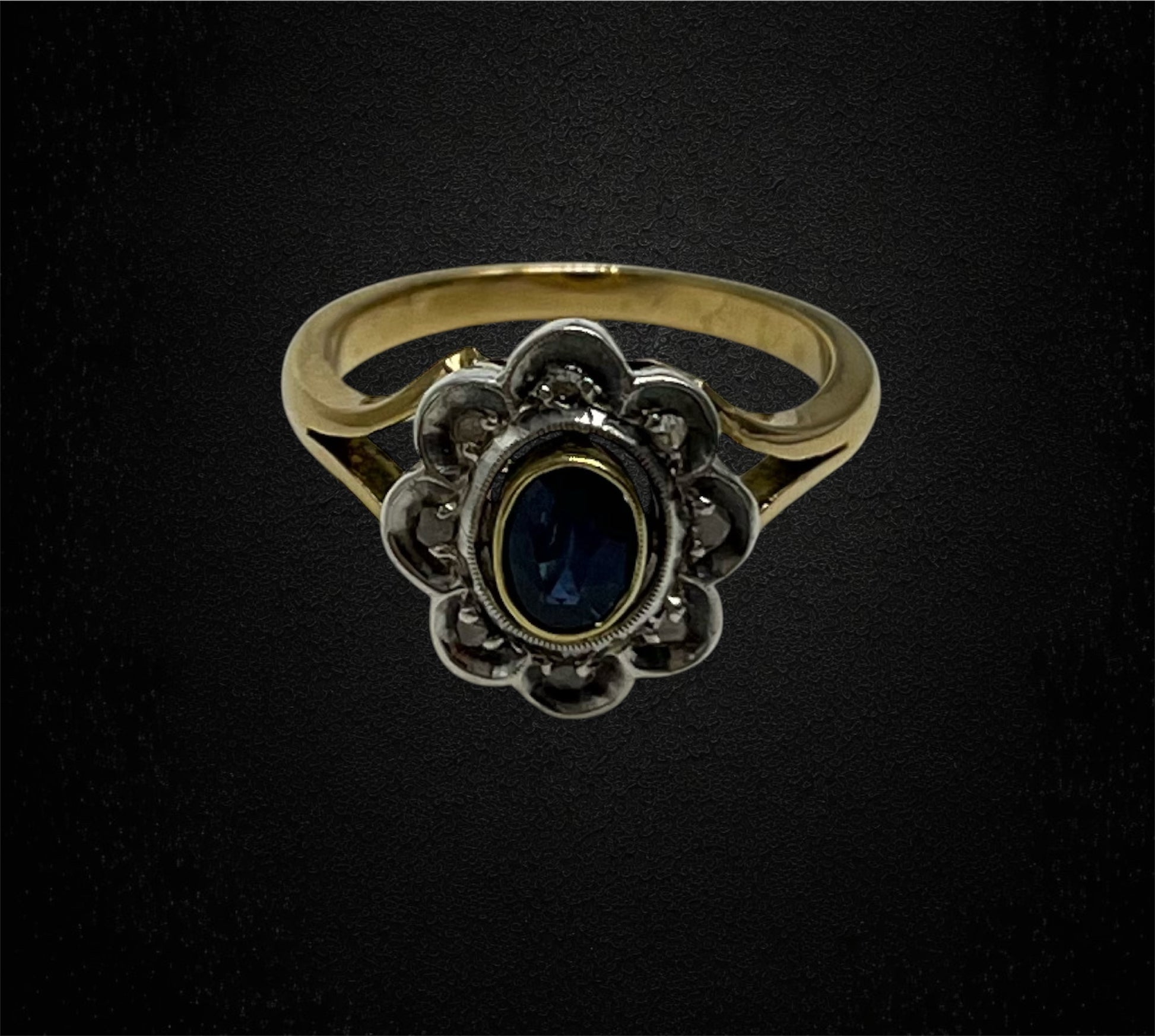 Intorno allo zaffiro, un delicato contorno di 8 diamanti taglio a rosa dona luminosità e brillantezza al gioiello, creando un gioco di luci che esalta ulteriormente la pietra centrale.
