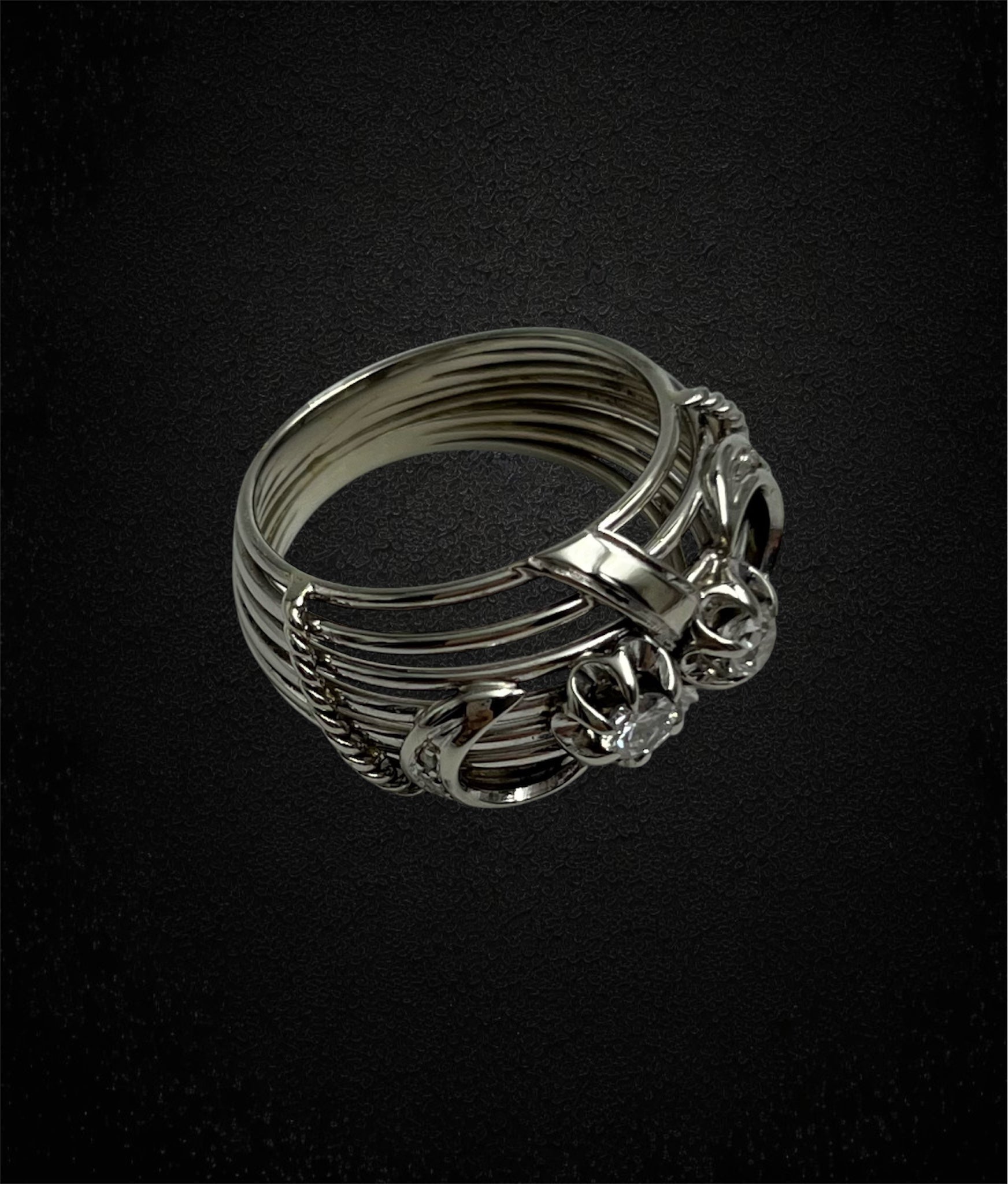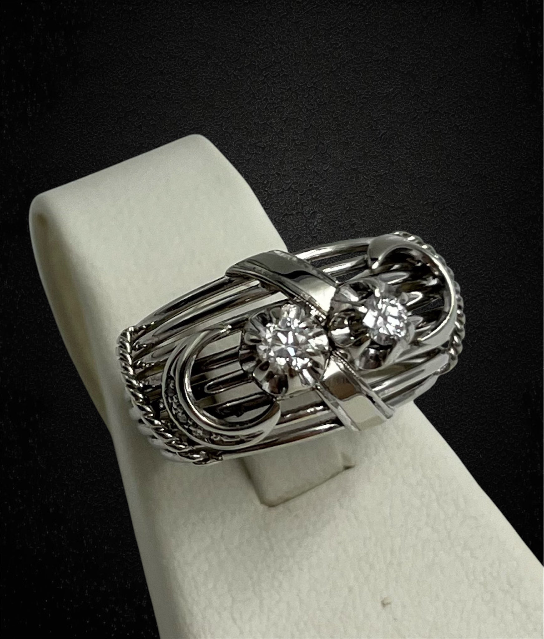Elegante anello in oro bianco 18K, dalla lavorazione sofisticata e artigianale, tipica della gioielleria italiana degli anni ’50.