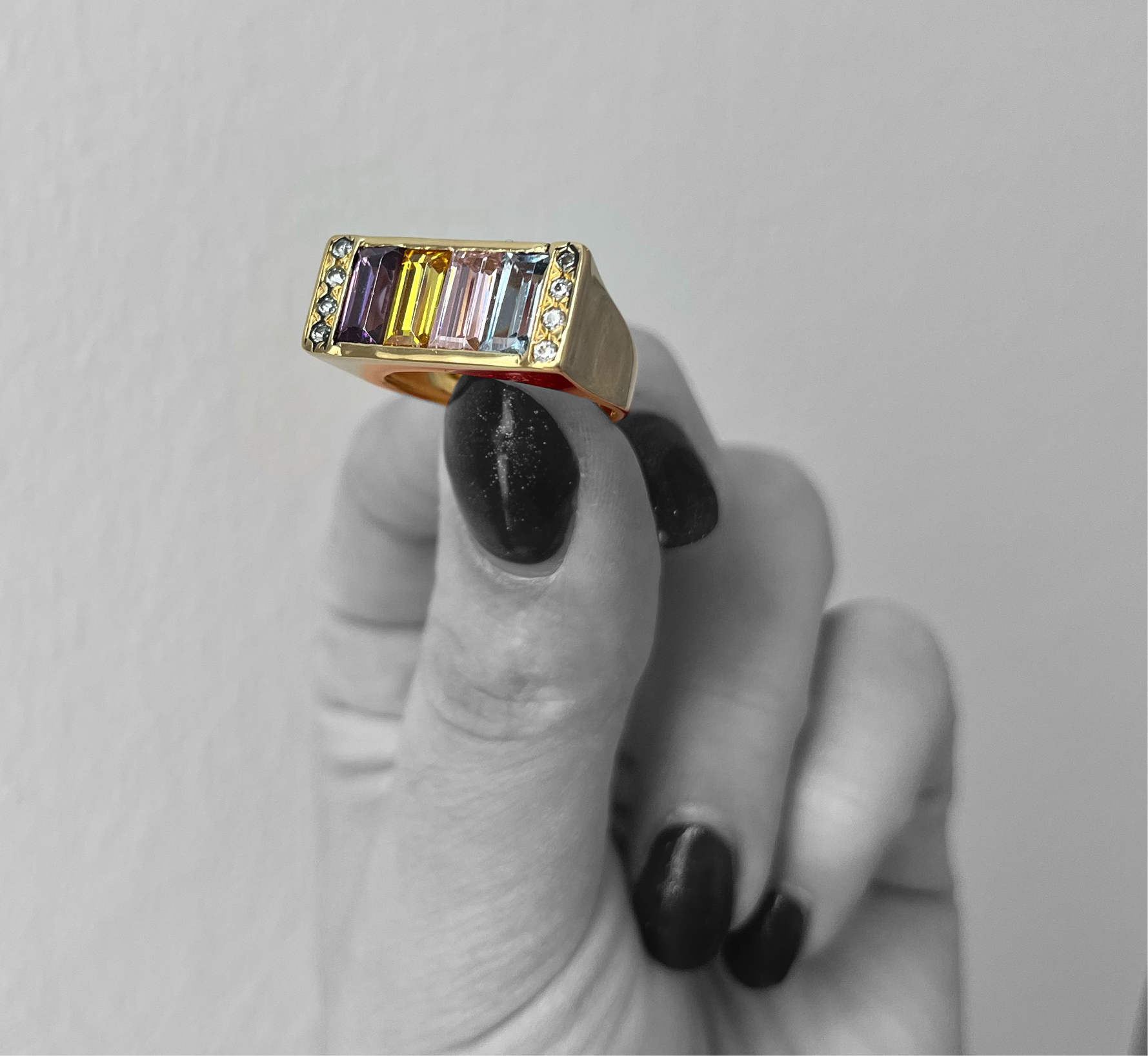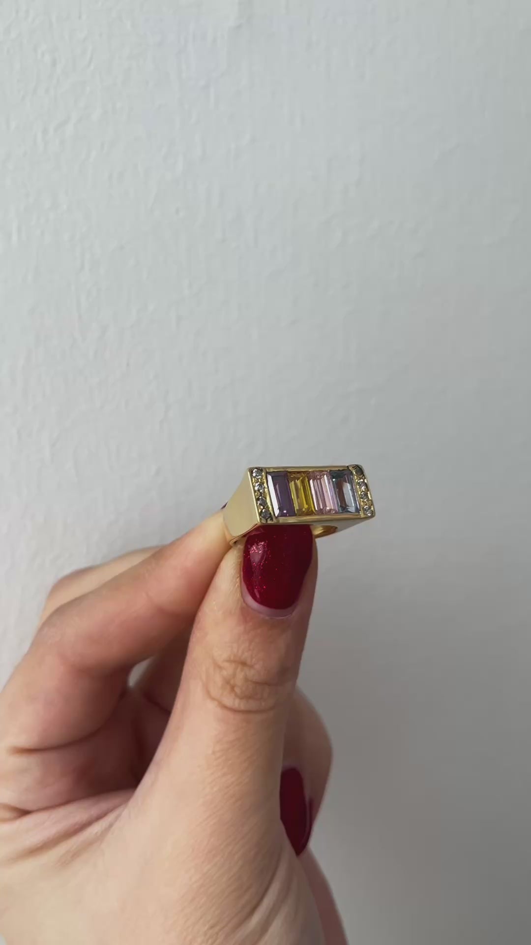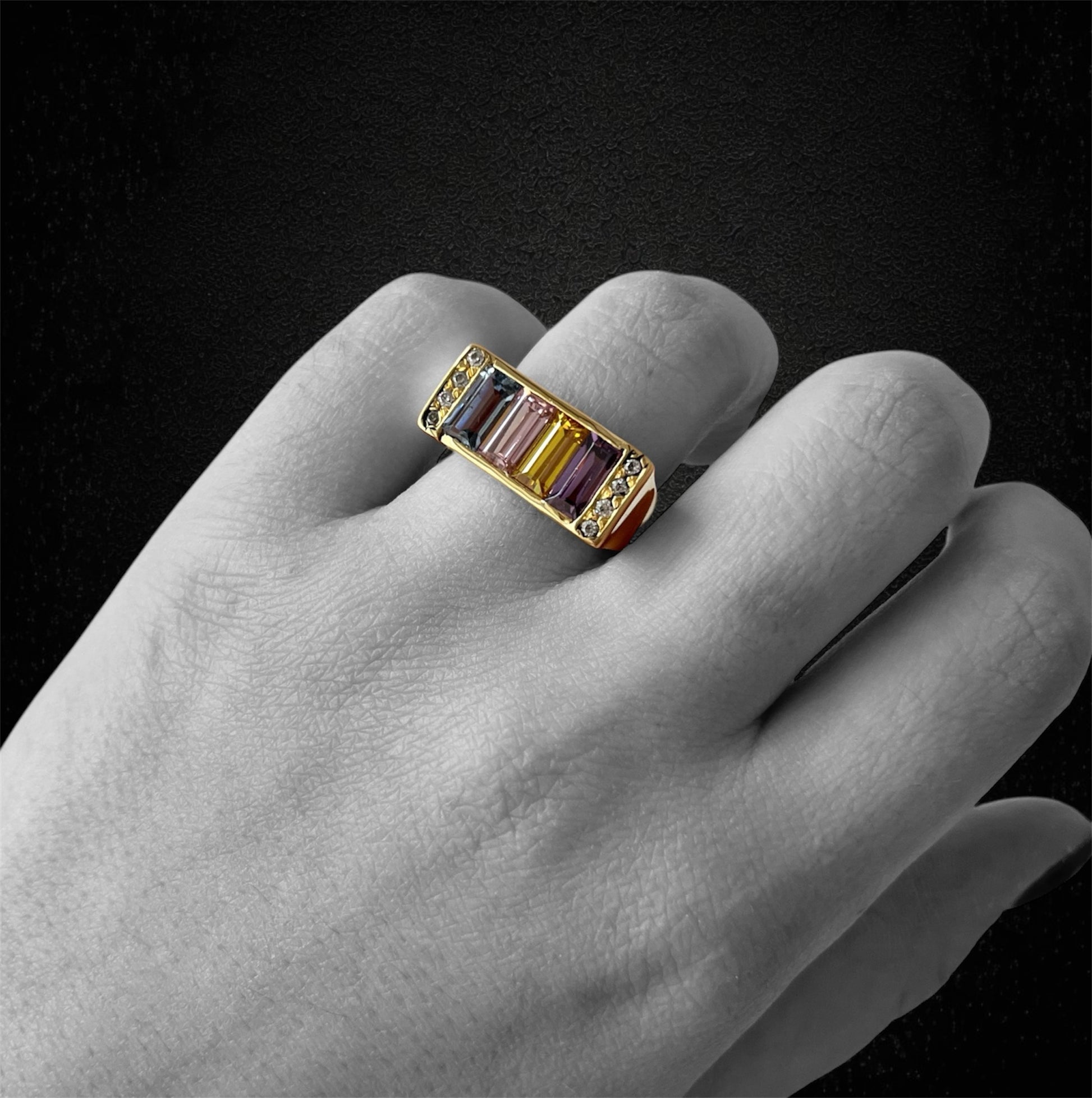 Un anello di straordinaria eleganza, realizzato in oro giallo 18K con un design a ponte che cattura l'essenza dell'artigianato italiano. Questo gioiello unico è impreziosito da pietre multicolori di taglio rettangolare, sapientemente incastonate per creare un'armonia cromatica affascinante. A completare il design, otto diamanti di taglio brillante che aggiungono luminosità e raffinatezza.