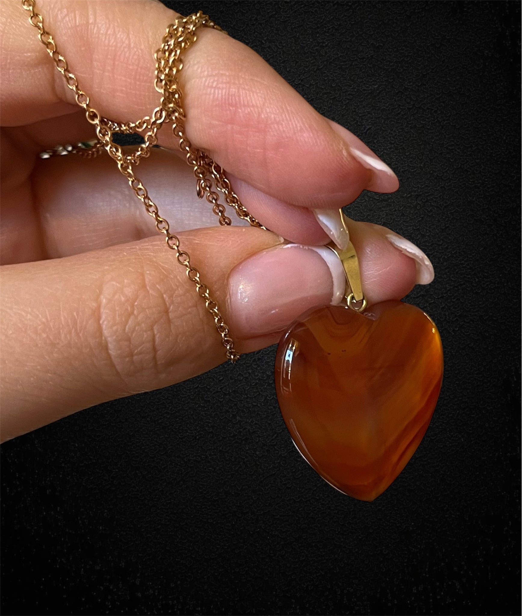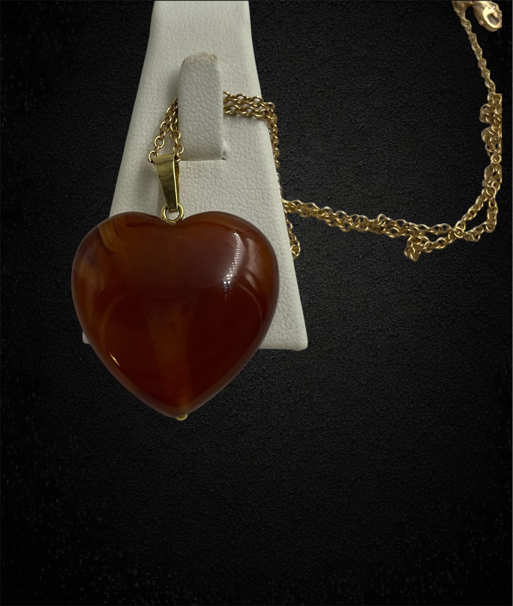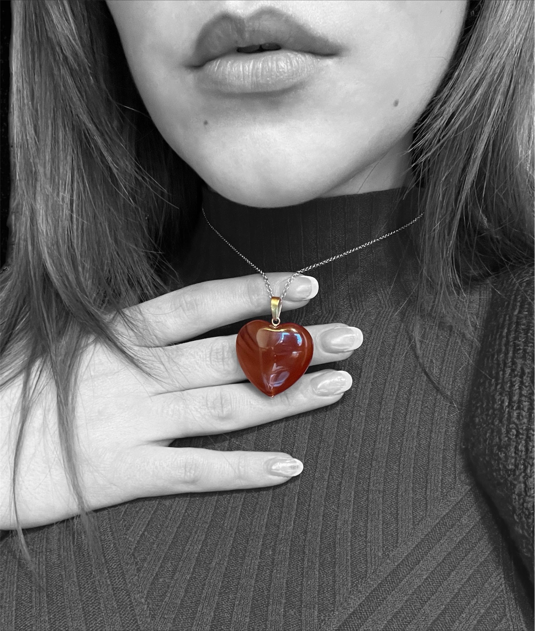 Ciondolo a forma di cuore, realizzato in corniola di un caldo e avvolgente tono arancione, impreziosito da un castone in oro giallo 18K che ne esalta la bellezza naturale. La pietra, con la sua superficie liscia e lucida, emana una luce delicata, mentre il raffinato montaggio in oro giallo crea un contrasto perfetto, evidenziando la tonalità unica della corniola.