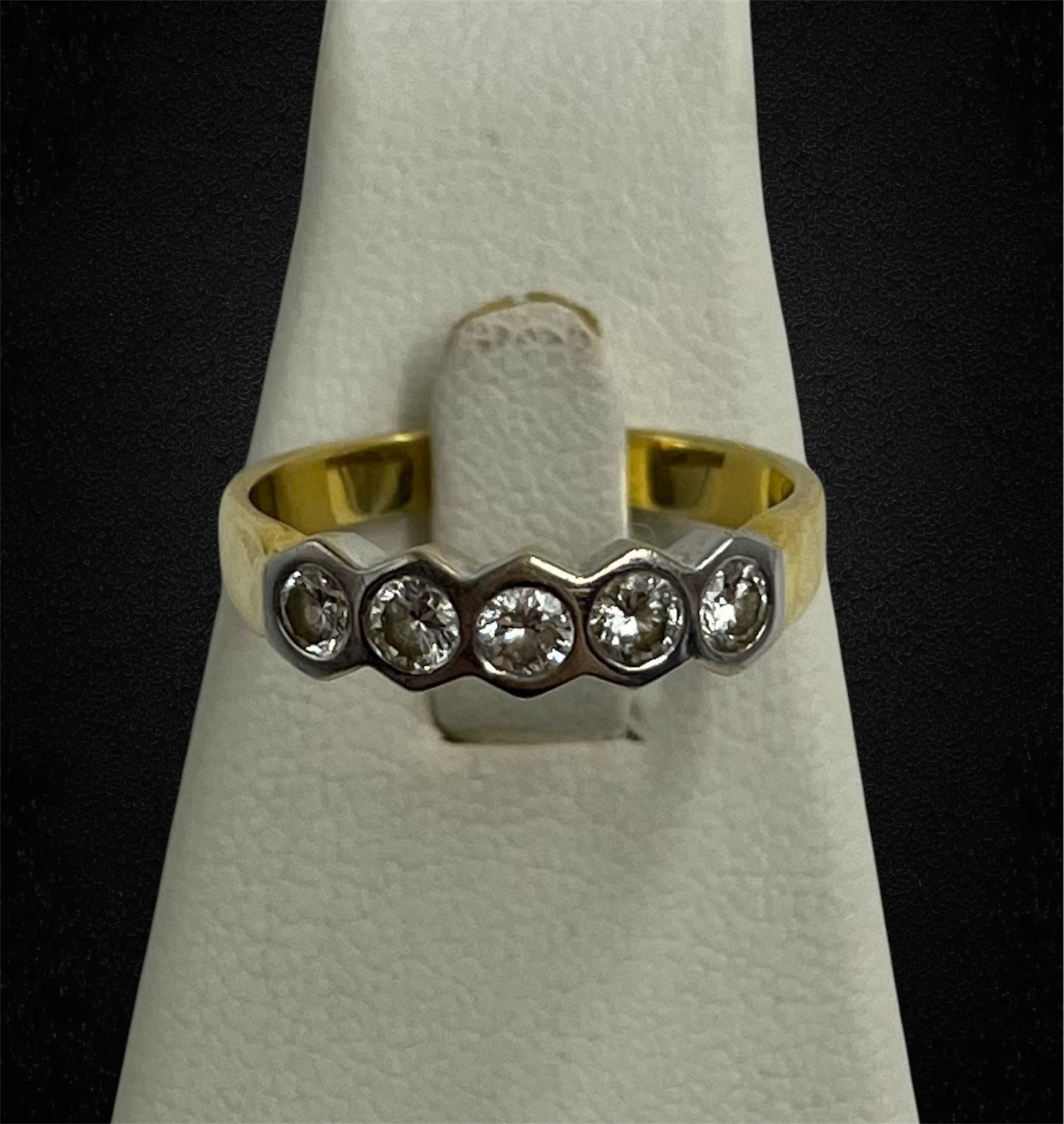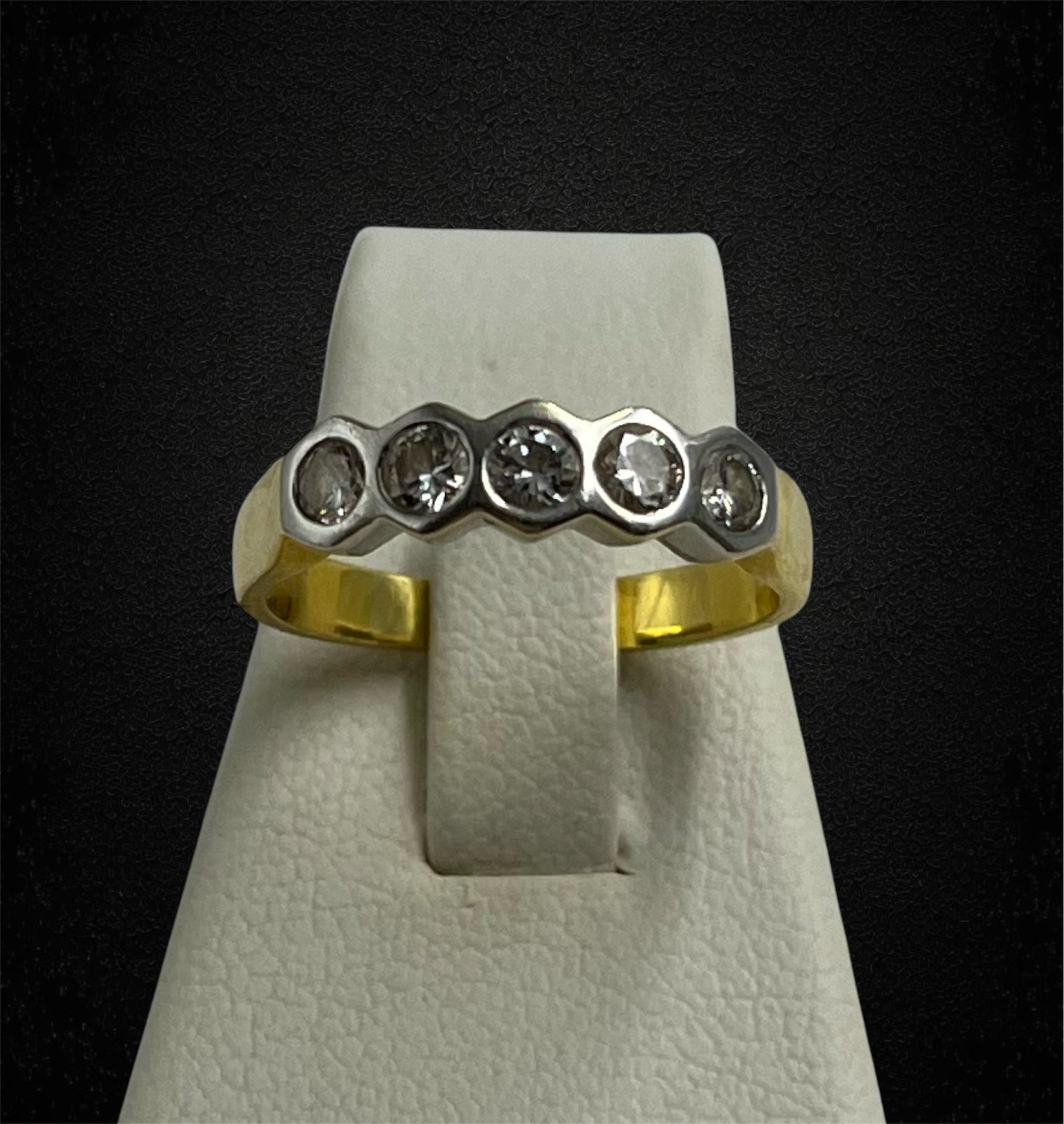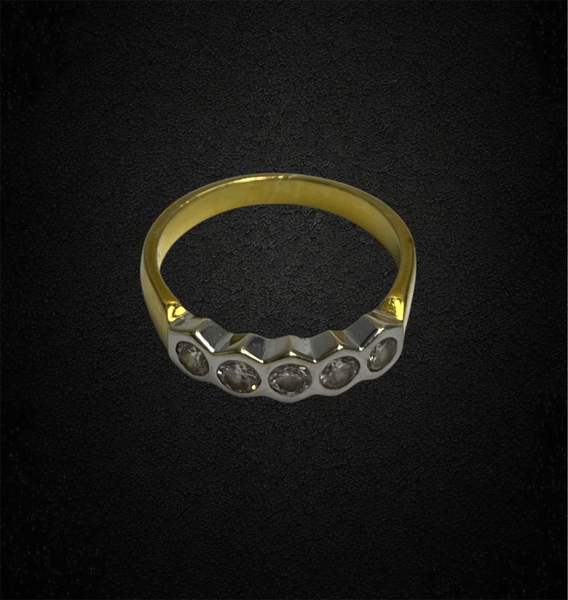 Esalta la bellezza senza tempo con questo raffinato anello a riviere, un gioiello di straordinaria eleganza e manifattura italiana. Realizzato in oro giallo 18K, questo capolavoro di alta gioielleria si distingue per i suoi castoni superiori in oro bianco, che accolgono con grazia cinque diamanti naturali tagliati a brillante.