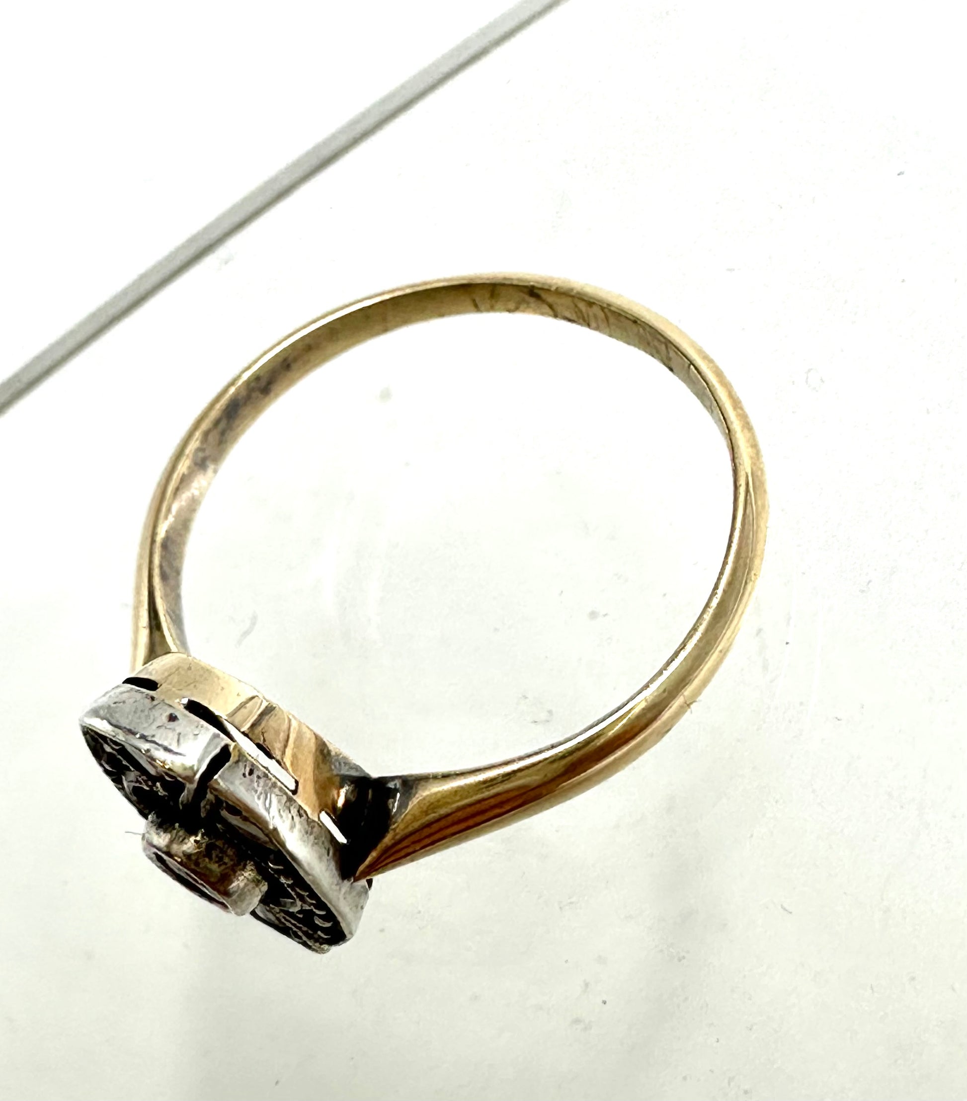 Crafted with a yellow gold band and a silver top setting, it features a central rose-cut diamond (approx. 0.05 ct) surrounded by a halo of rose-cut diamonds.