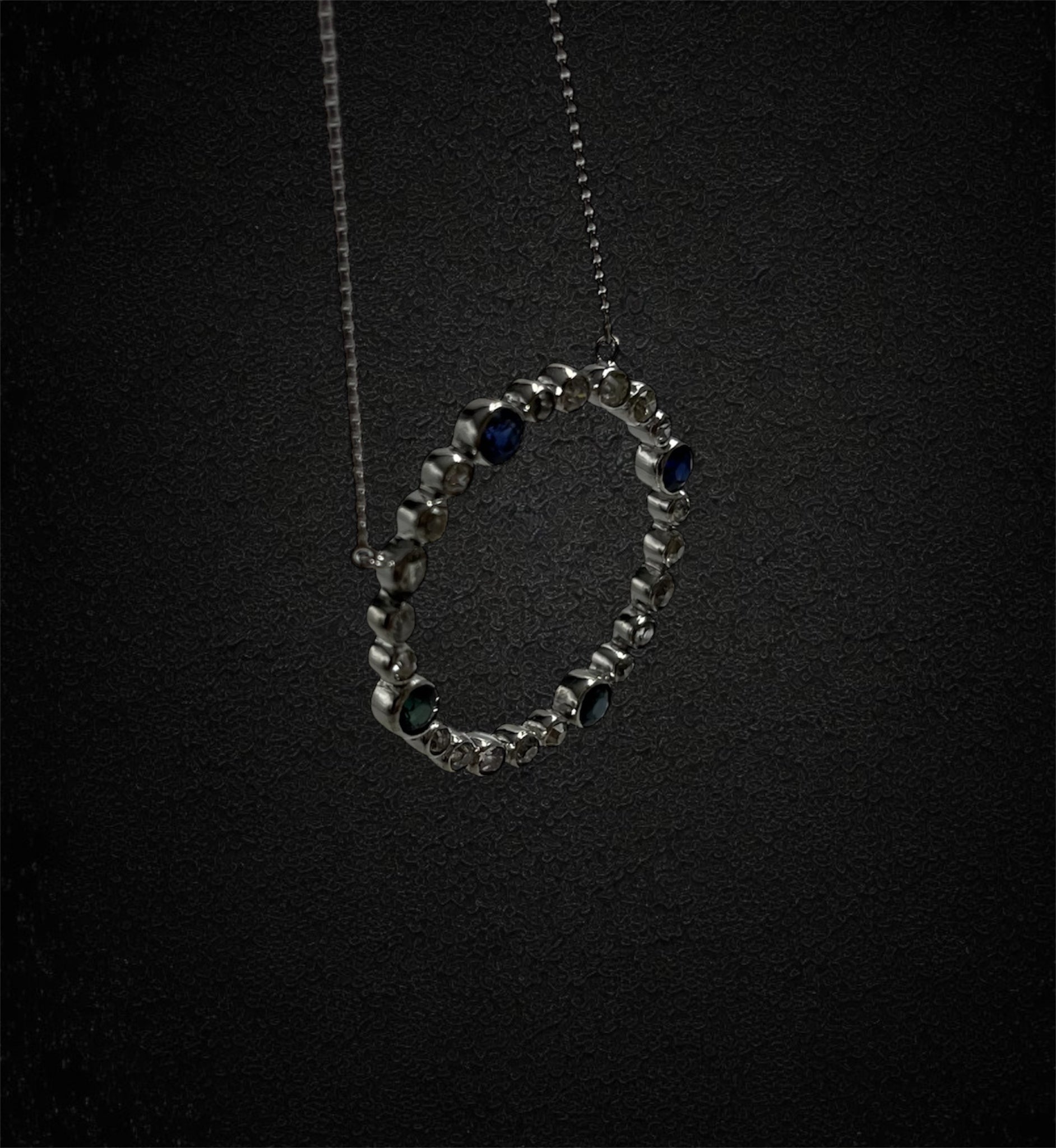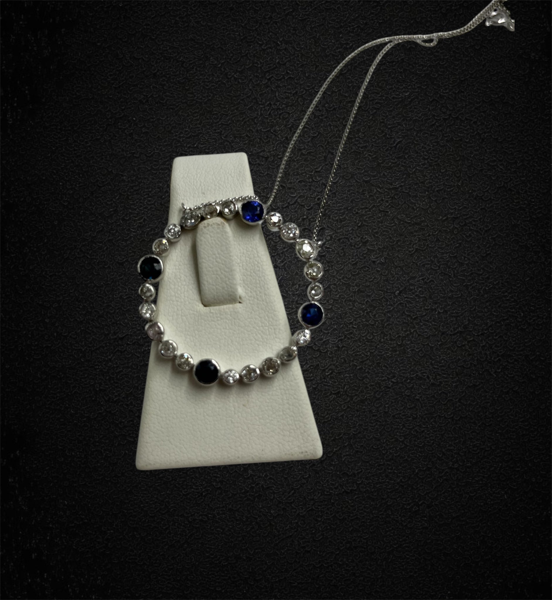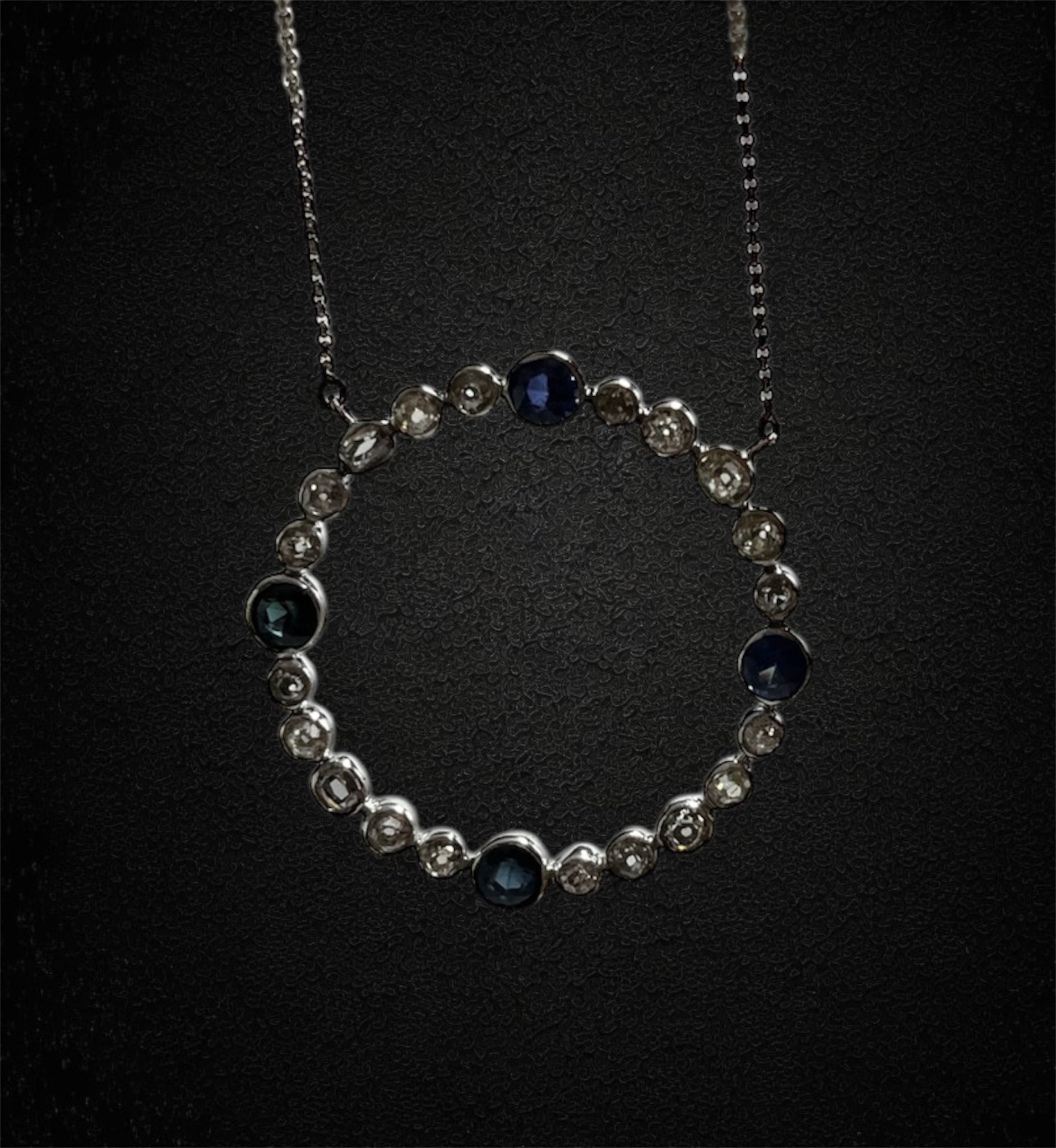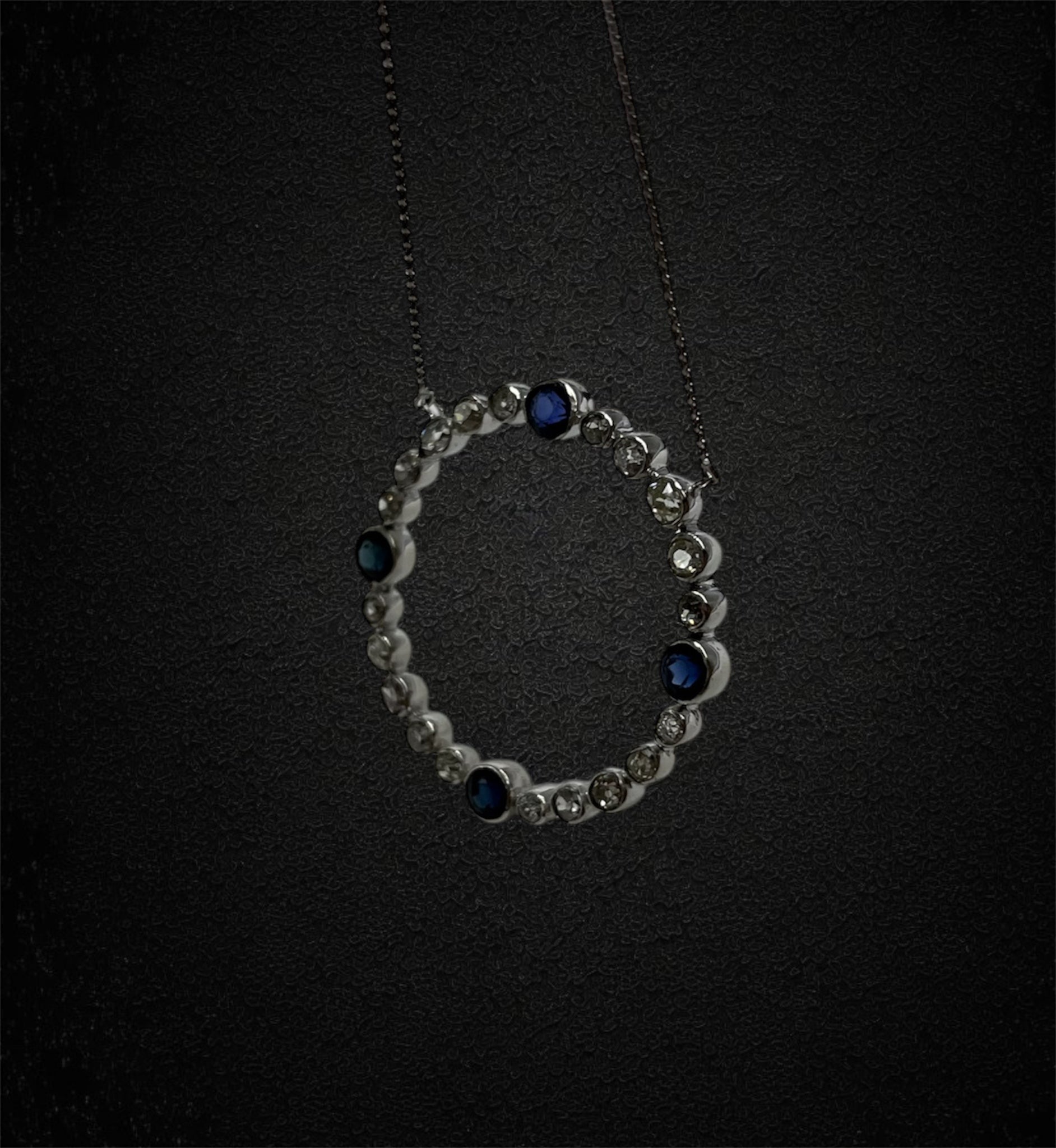 Crafted with 18K rhodium-plated white gold, this refined pendant features 20 "old European" cut natural diamonds and 4 deep blue sapphires.