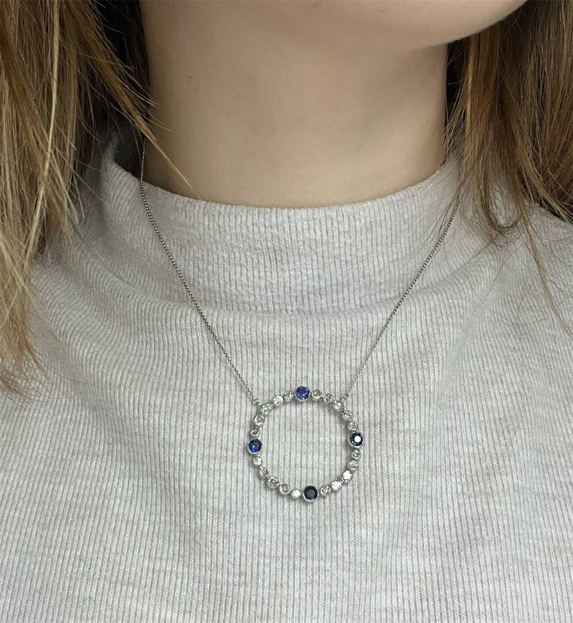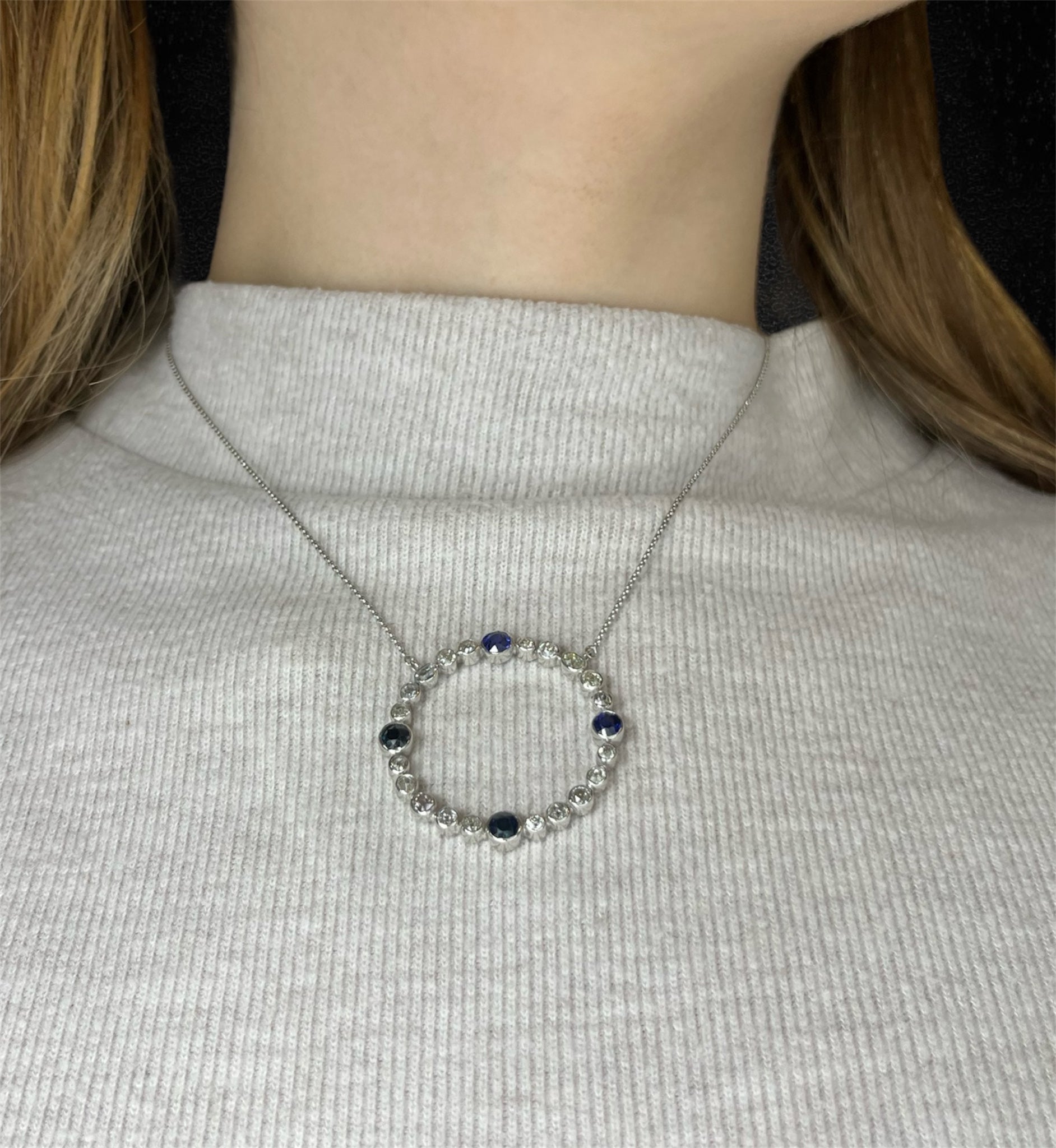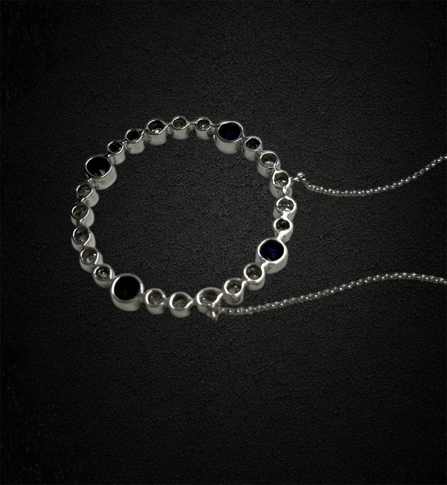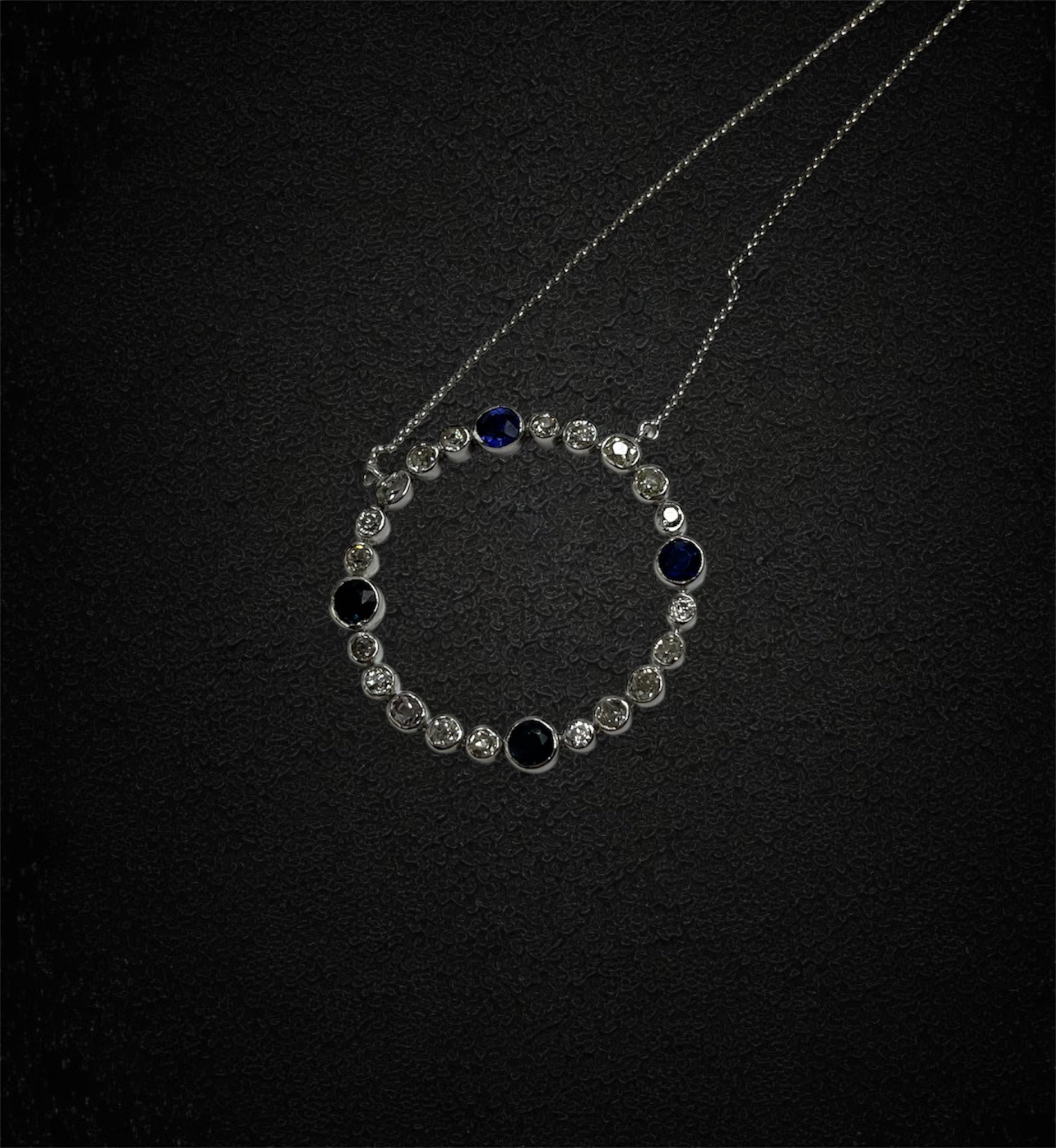 Crafted with 18K rhodium-plated white gold, this refined pendant features 20 "old European" cut natural diamonds and 4 deep blue sapphires.