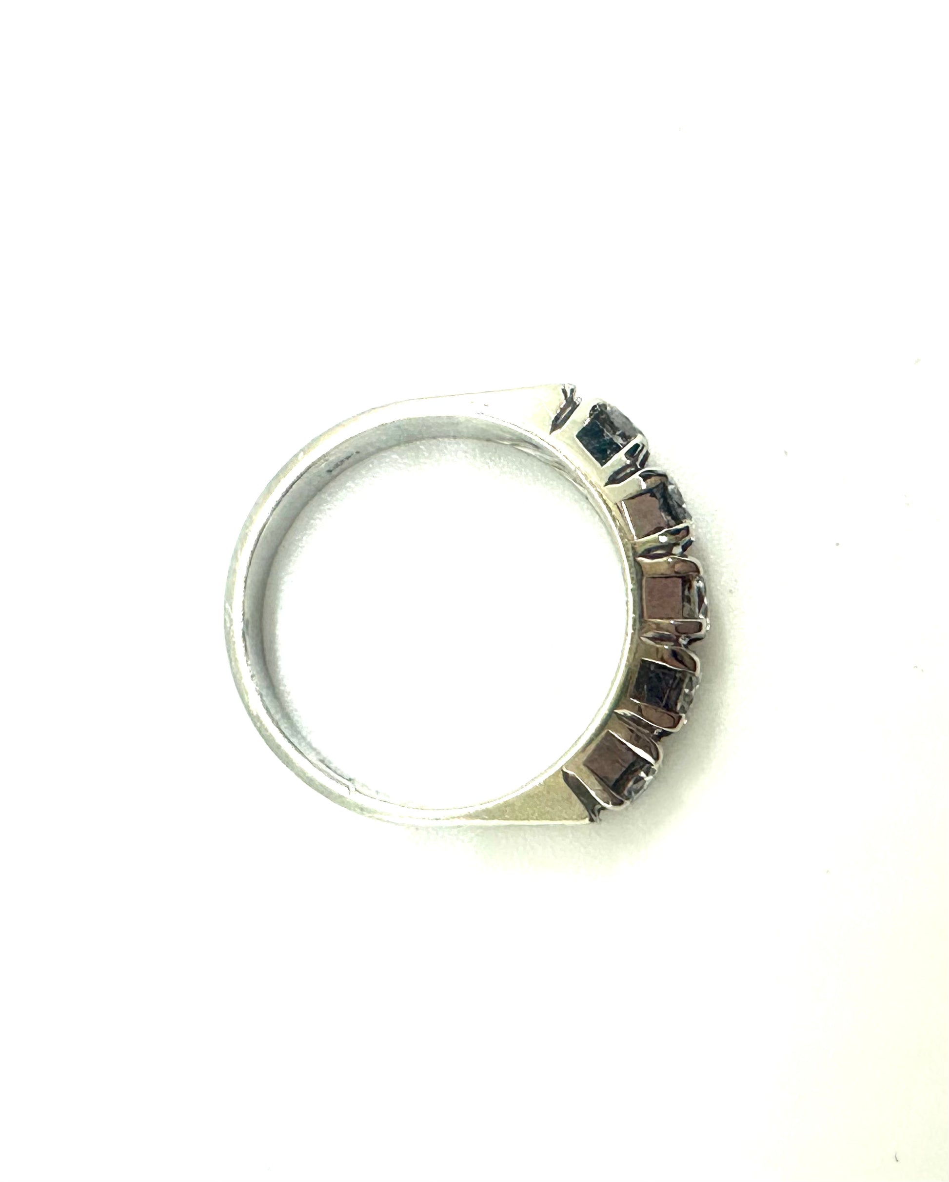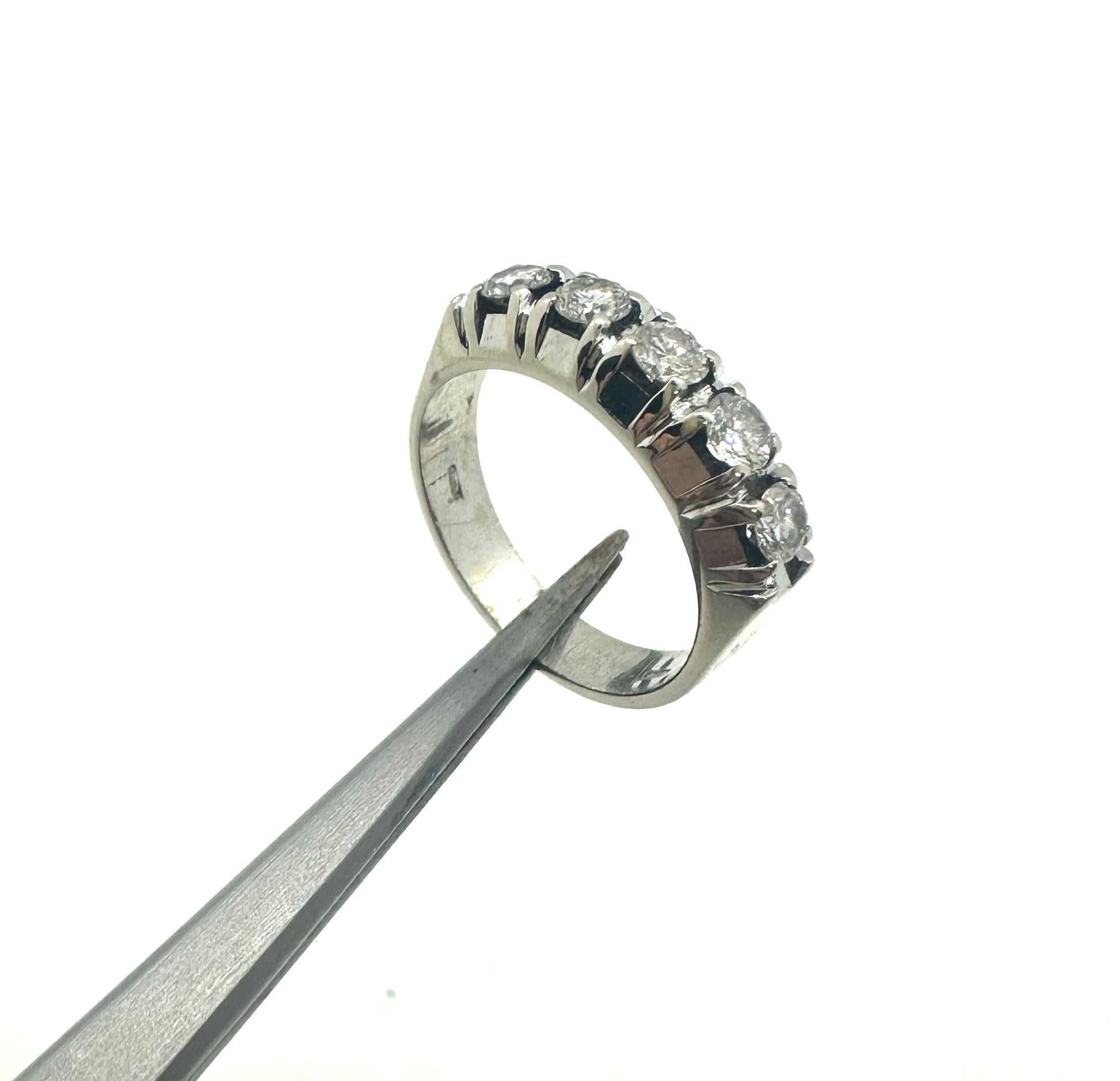 Anello riviere in oro bianco degli anni '70, emblema di eleganza senza tempo e raffinata maestria artigianale. La fascia è adornata da una sequenza armoniosa di castoni a griffe, ciascuno dei quali custodisce un diamante bianco di taglio a brillante di 0,15 carati.