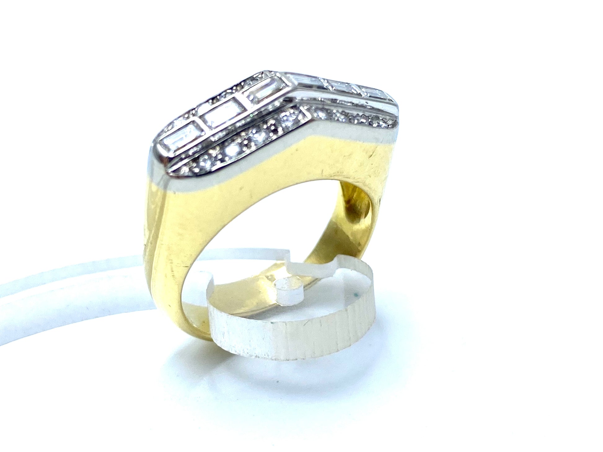 Crafted with 18K yellow and white gold, this ring showcases a row of exquisite "carrè" cut diamonds weighing 0.15 ct each, totaling 0.90 carats. These dazzling stones are beautifully surrounded by natural "brilliant" cut diamonds, weighing 0.03 ct each, totaling 0.24 carats, creating a truly captivating piece.